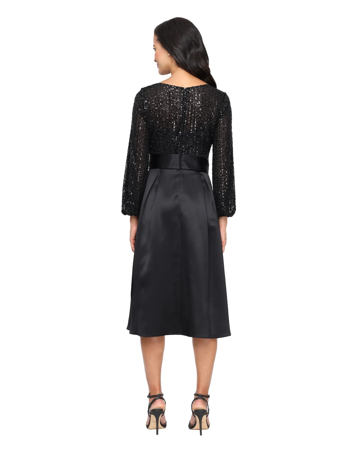 Flowing with an A-line silhouette and sequin bodice, this Alex Evenings midi dress includes a satin skirt and tie waist for definition. The boat neckline offers a classic and elegant formal look.