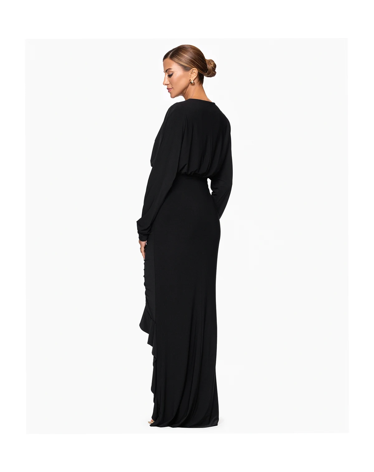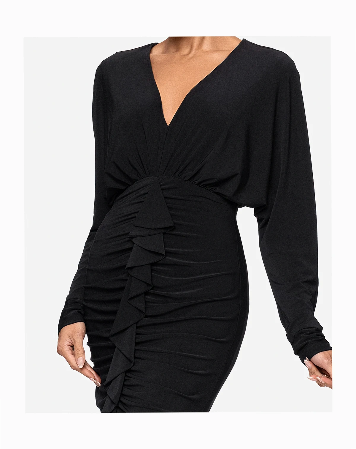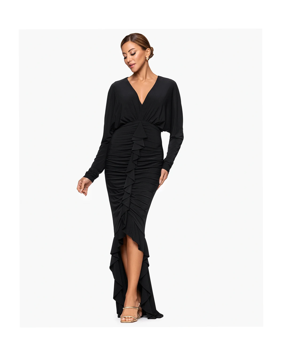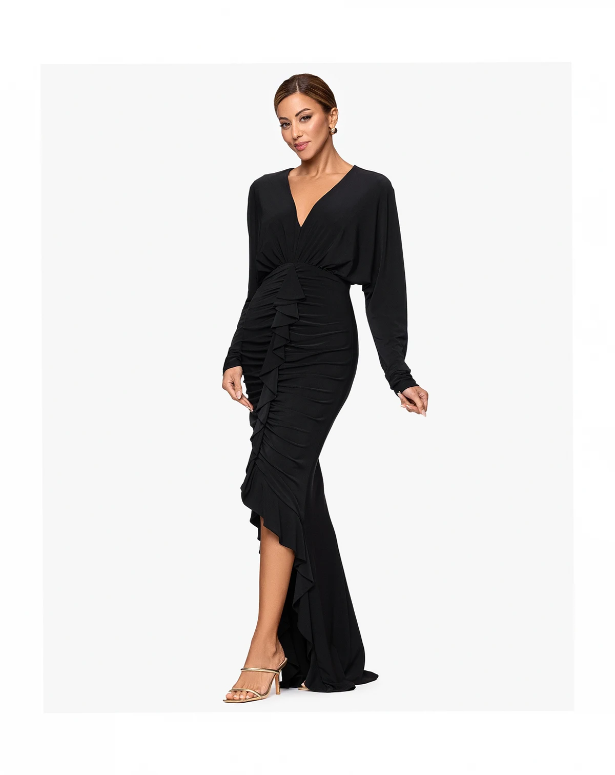 Create visual interest with ruched detailing and an asymmetrical hemline in this long dress from XSCAPE. The V-neckline offers a flattering frame for the dynamically styled silhouette.