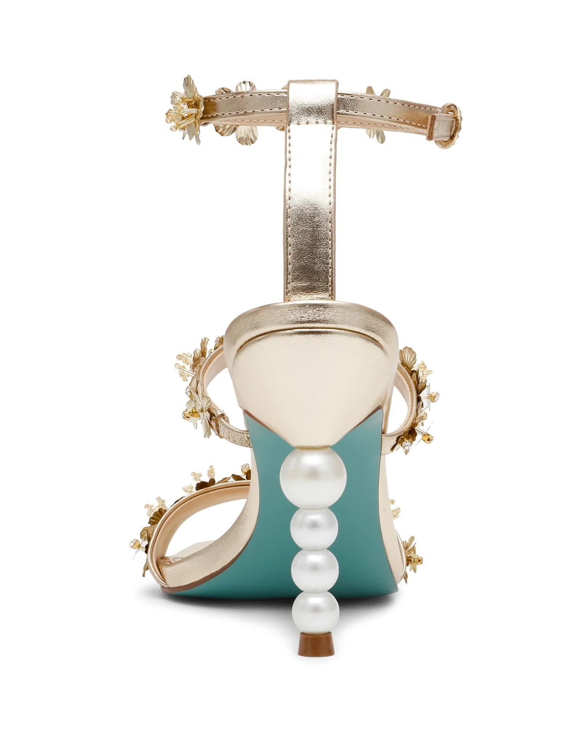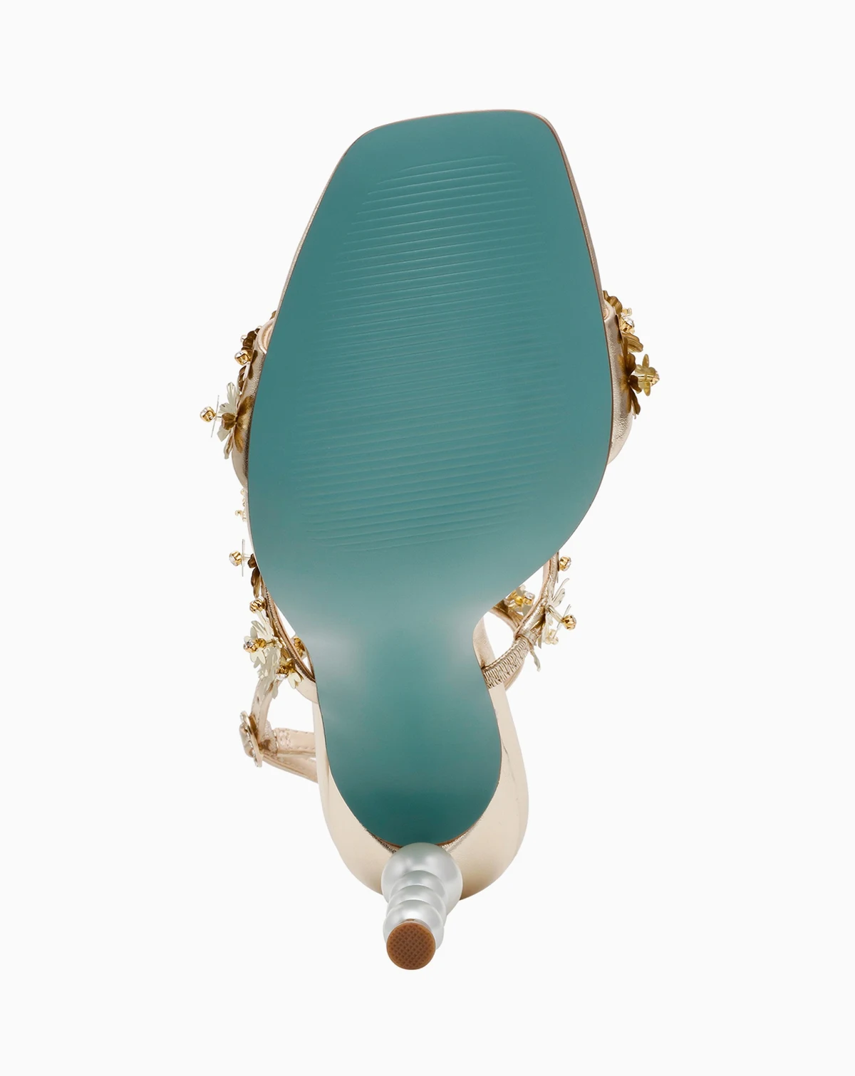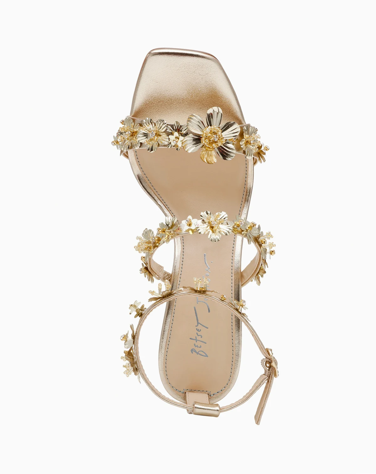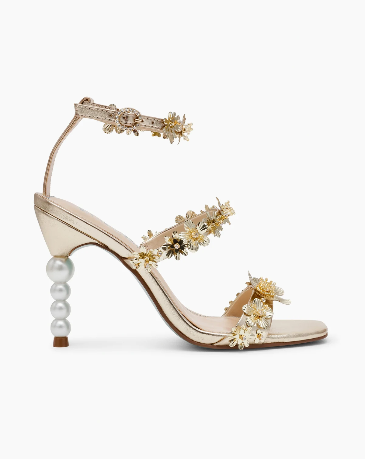 Meet Betsey Johnson's Lorra dress sandal! The flowers and sewn sequins, and pearl heel are making them perfect for any event.