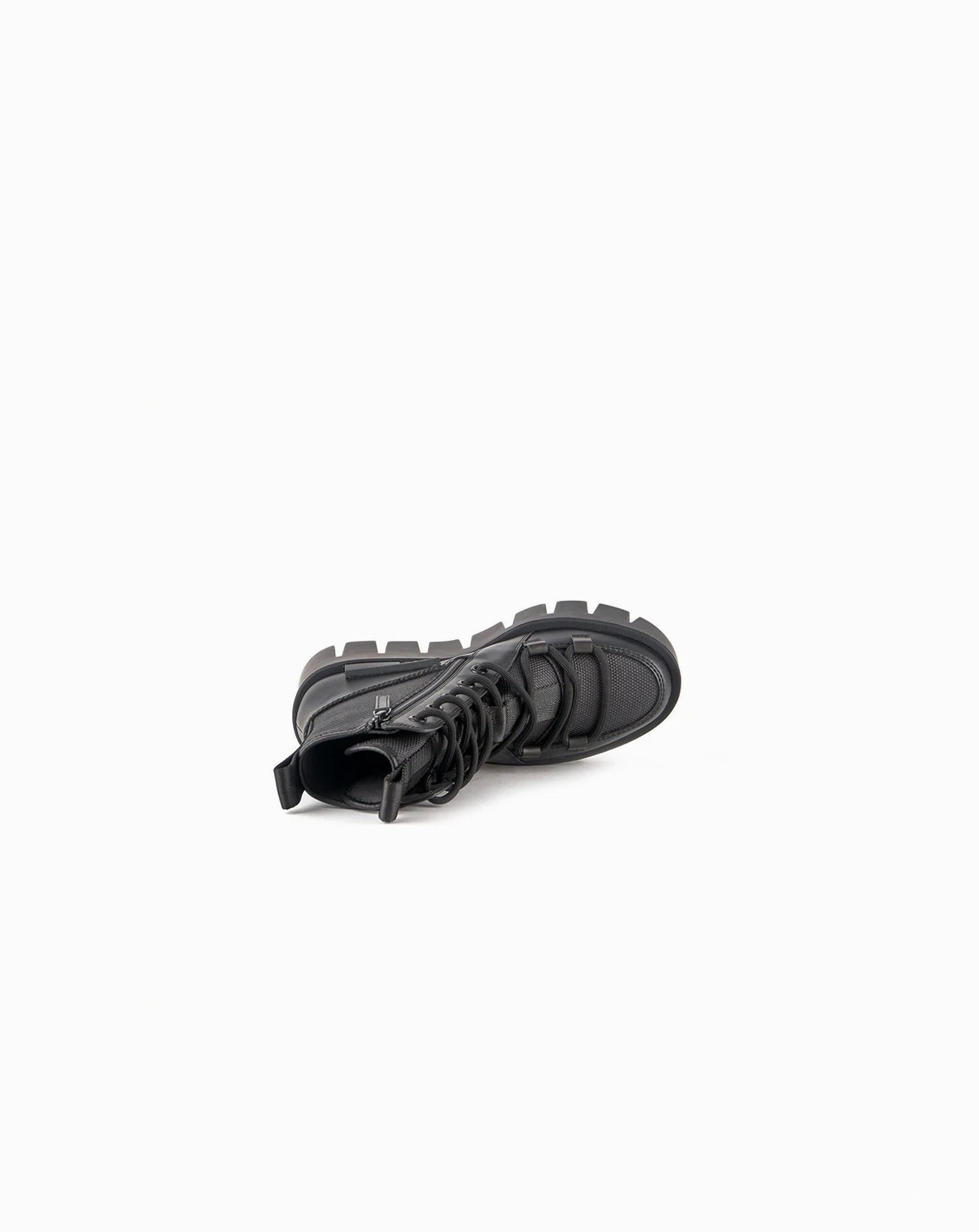 The Grip Explorer is a waxed canvas lace-up bootie with nappa leather trims, platform lift, nylon straps, a statement logo block, and a defining lug sole.