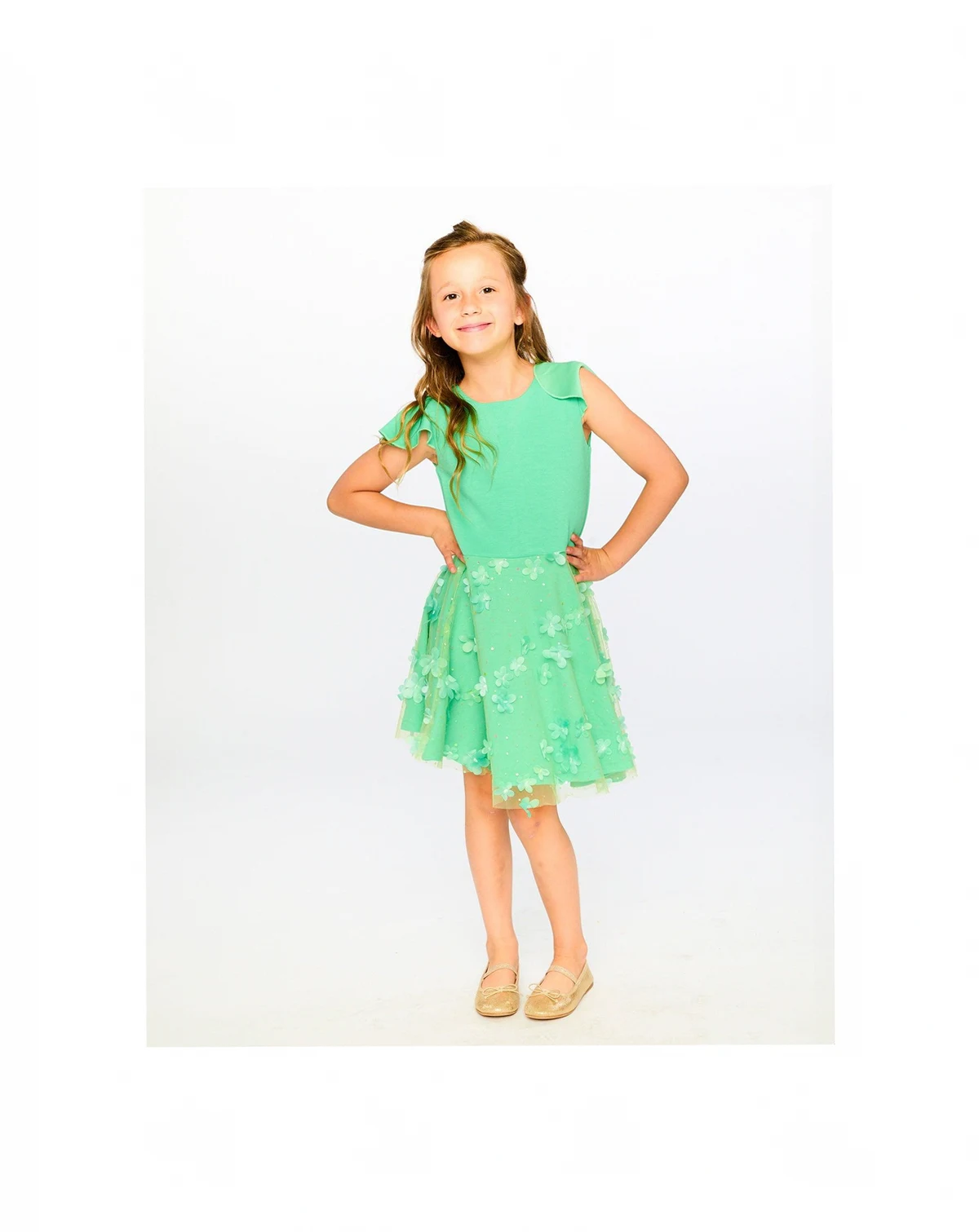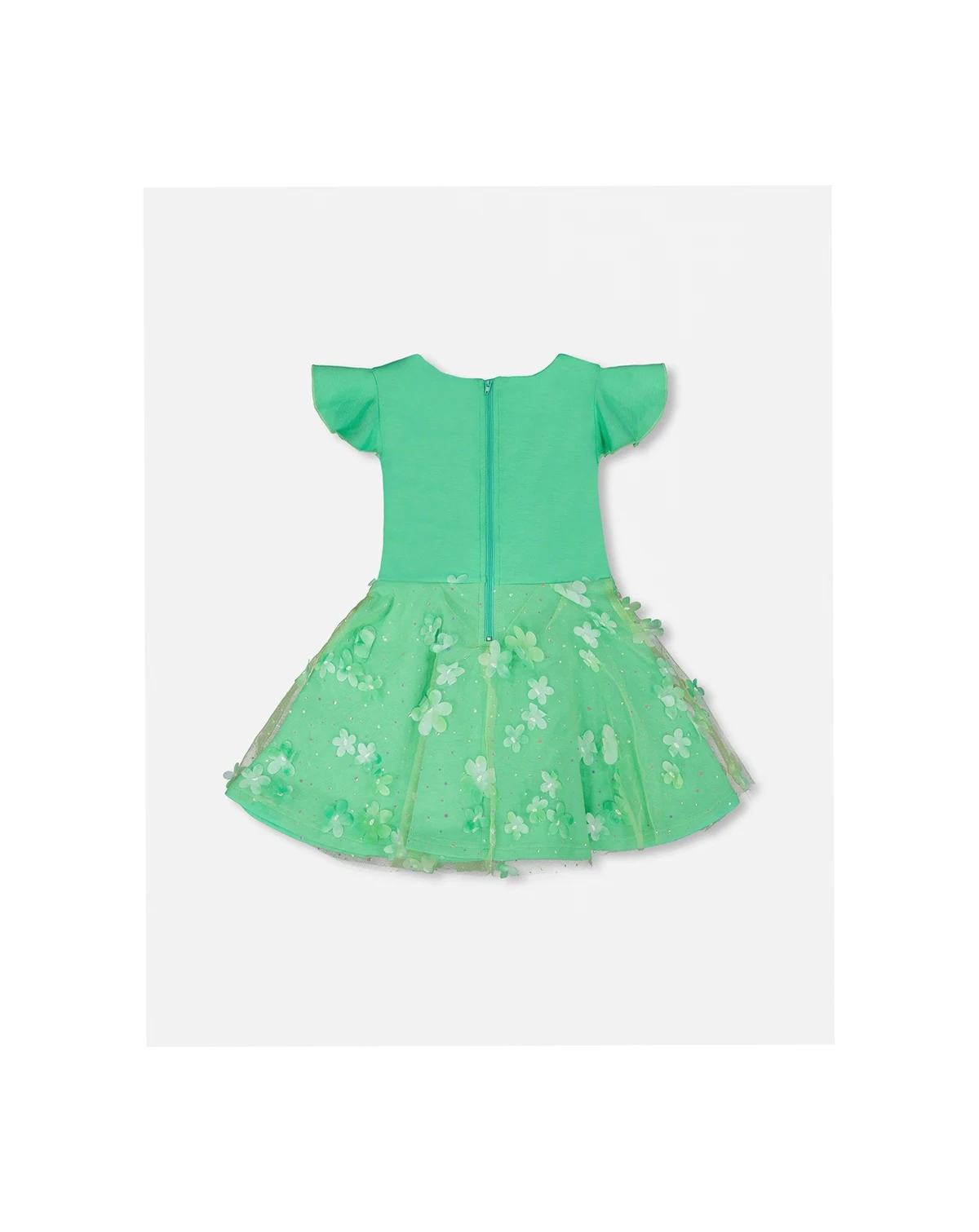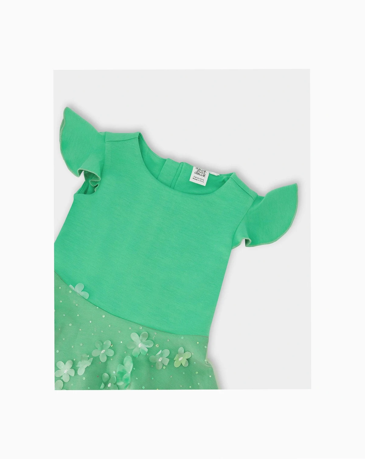 This bi-material dress in bright mint green brings a fresh and playful elegance to her special occasions. The dress features a fitted bodice with short flutter sleeves, while the flared skirt is covered with a sheer mesh overlay adorned with a tonal flower motif that adds texture and charm. A soft lining ensures comfort, while the mesh outer layer gives this dress a delicate, airy finish.