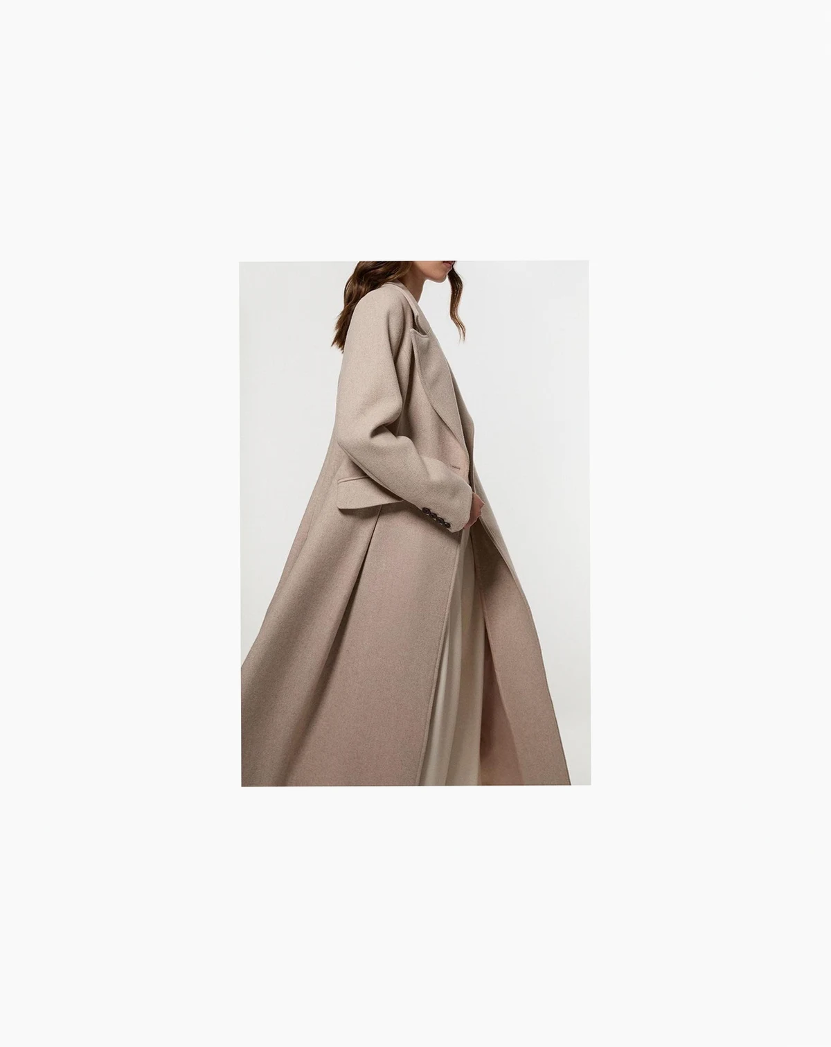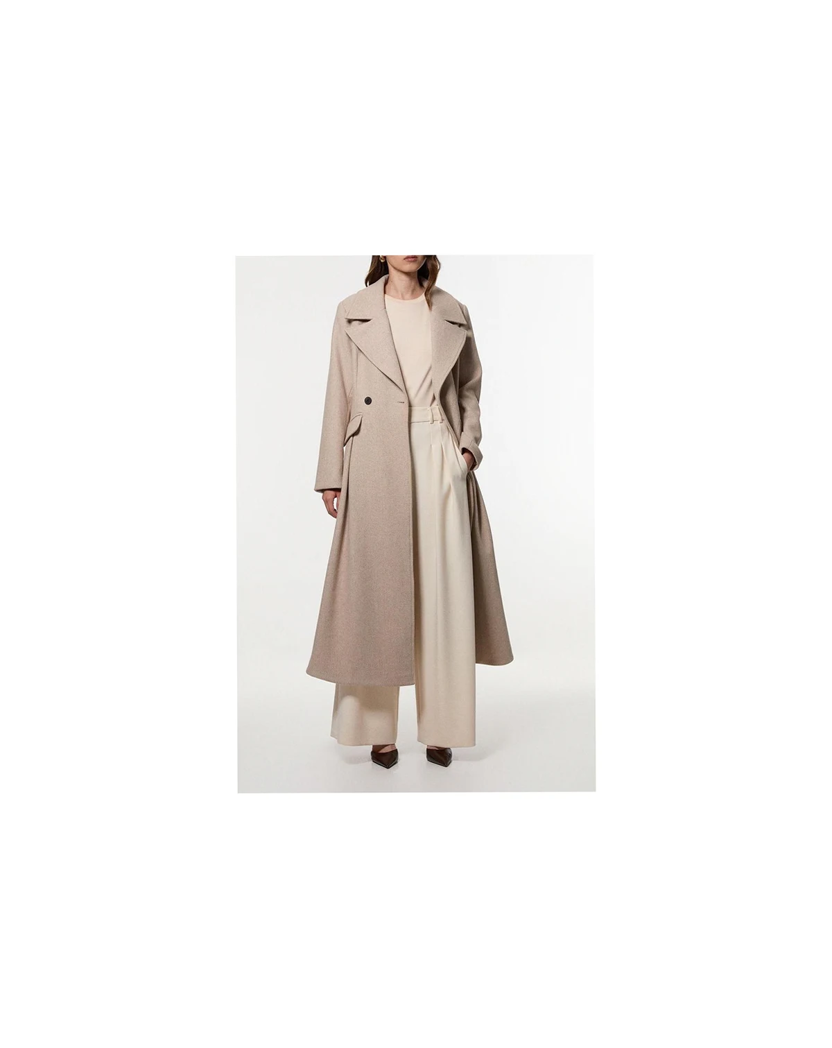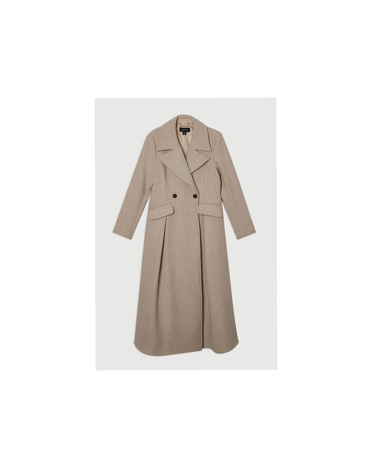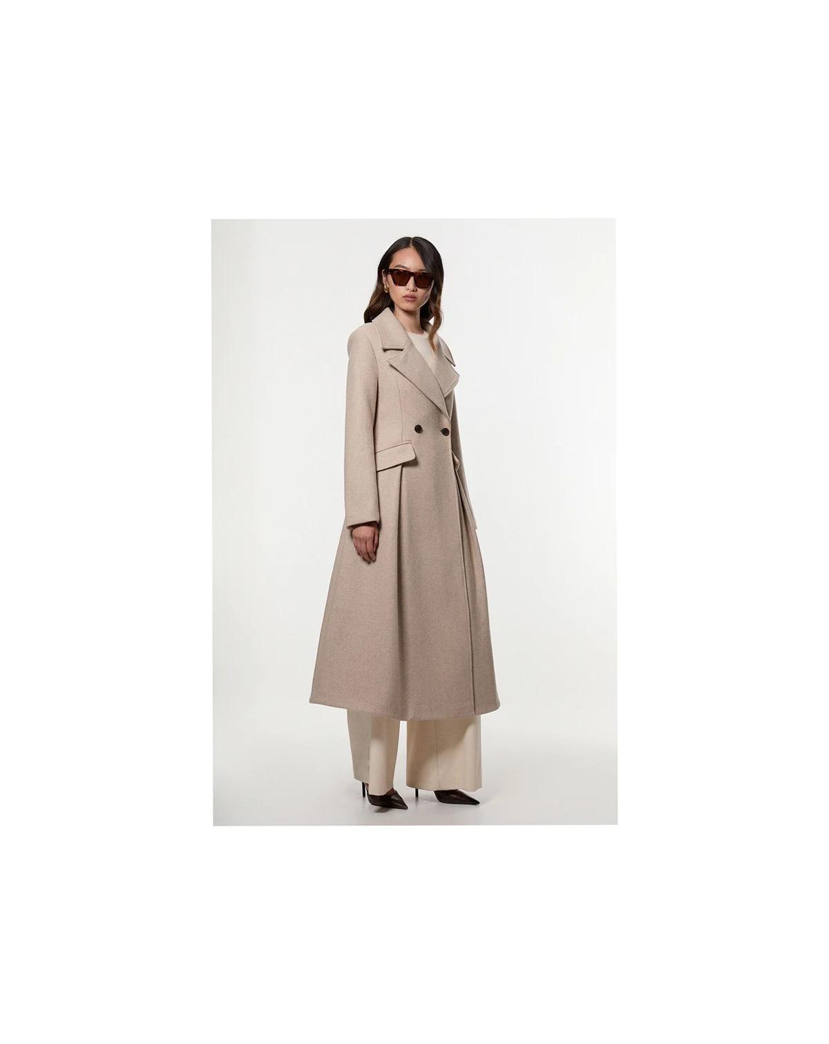 This tailored midi coat showcases Karen Millen's expert craftsmanship with its striking flared skirt design that creates a dramatic silhouette. The structured shoulders and nipped-in waist offer a flattering shape that transitions beautifully from day to evening. Style with knee-high boots and a fine knit roll neck for sophisticated daywear that works perfectly for family gatherings or weekend brunches.