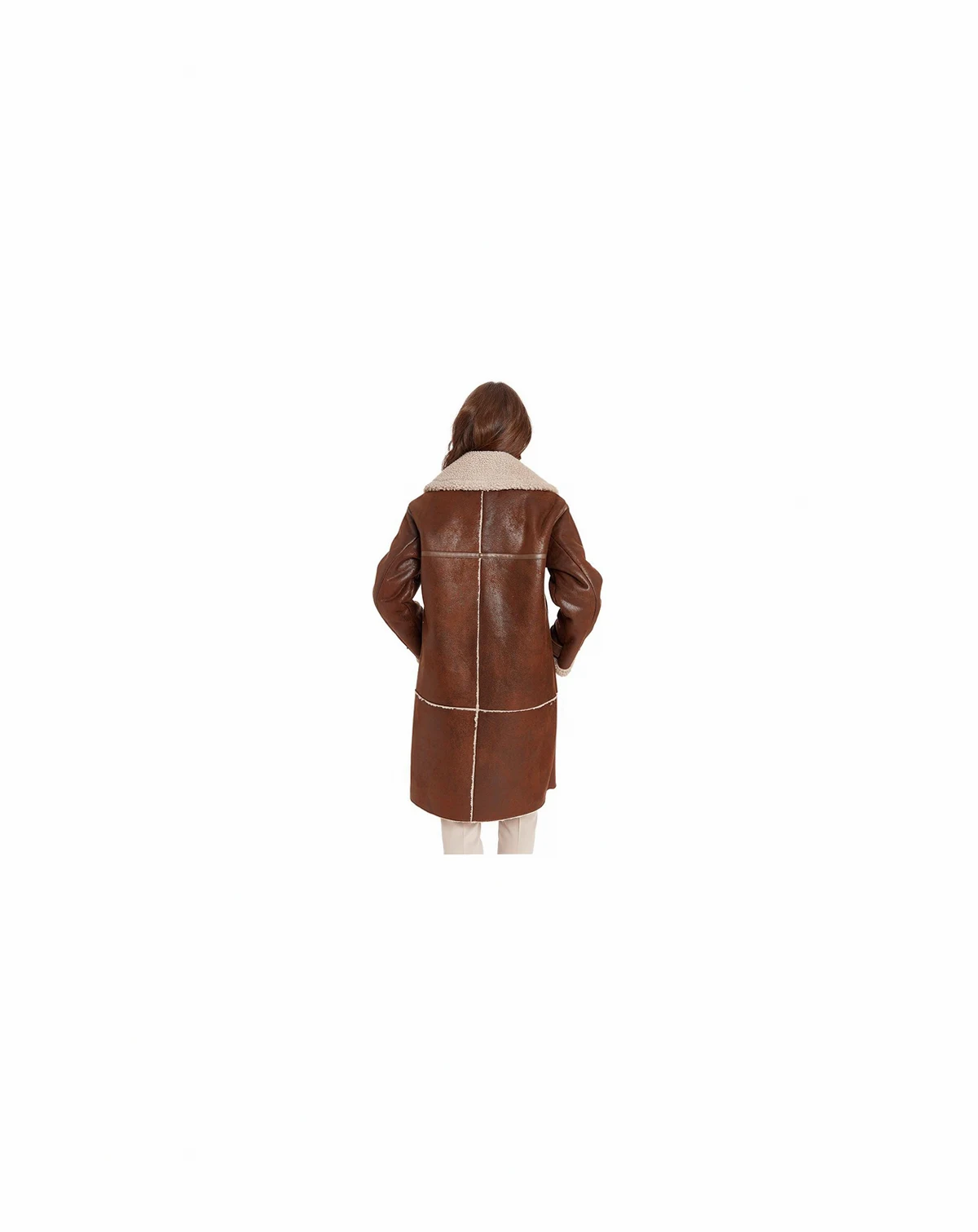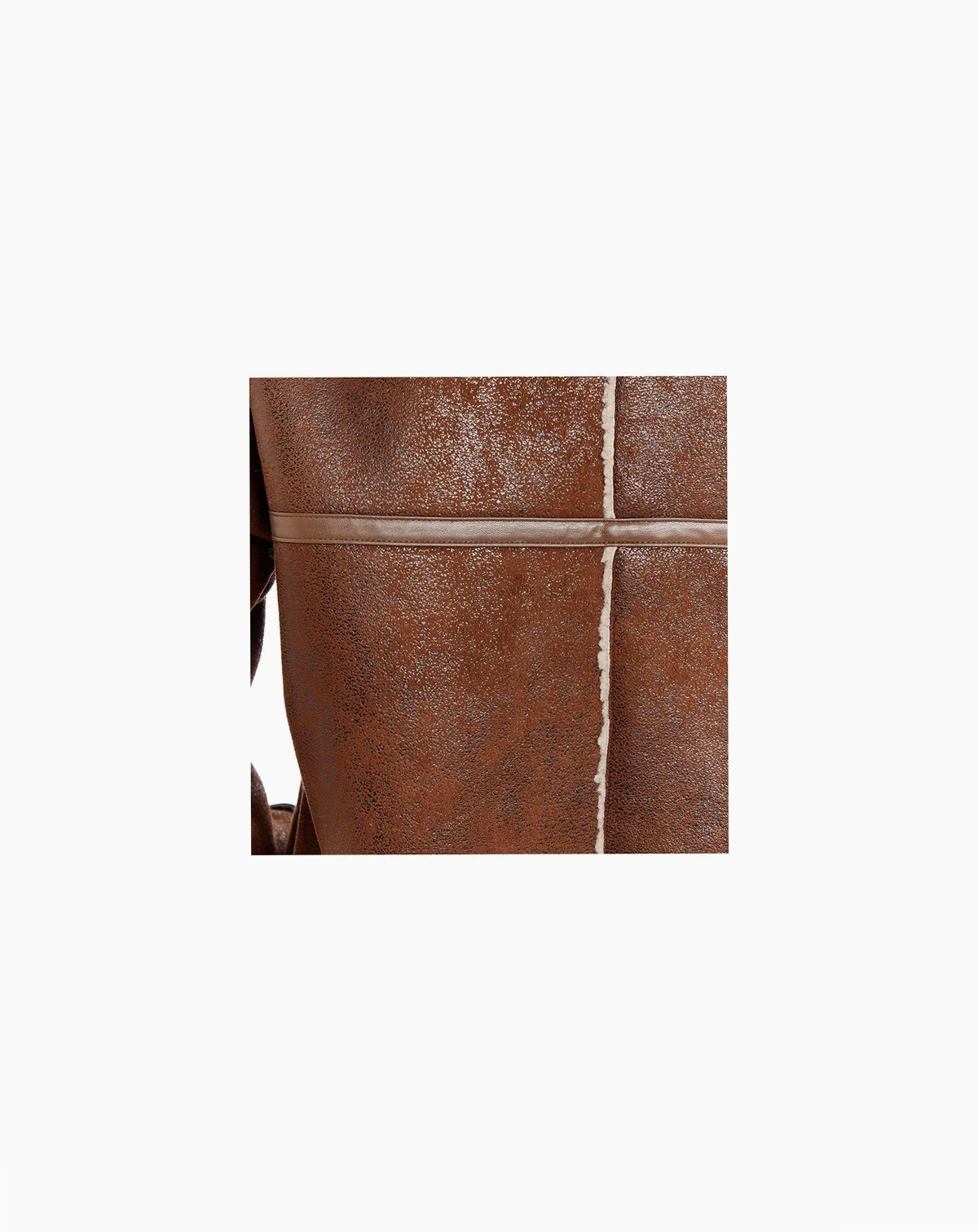 Distressed faux shearling men's wear inspired FRYE coat lined in faux sherpa with a notch collar make this the perfect outerwear staple. Faux leather detail trim on shoulders and adjustable cuffs add style and function this your coat of choice.