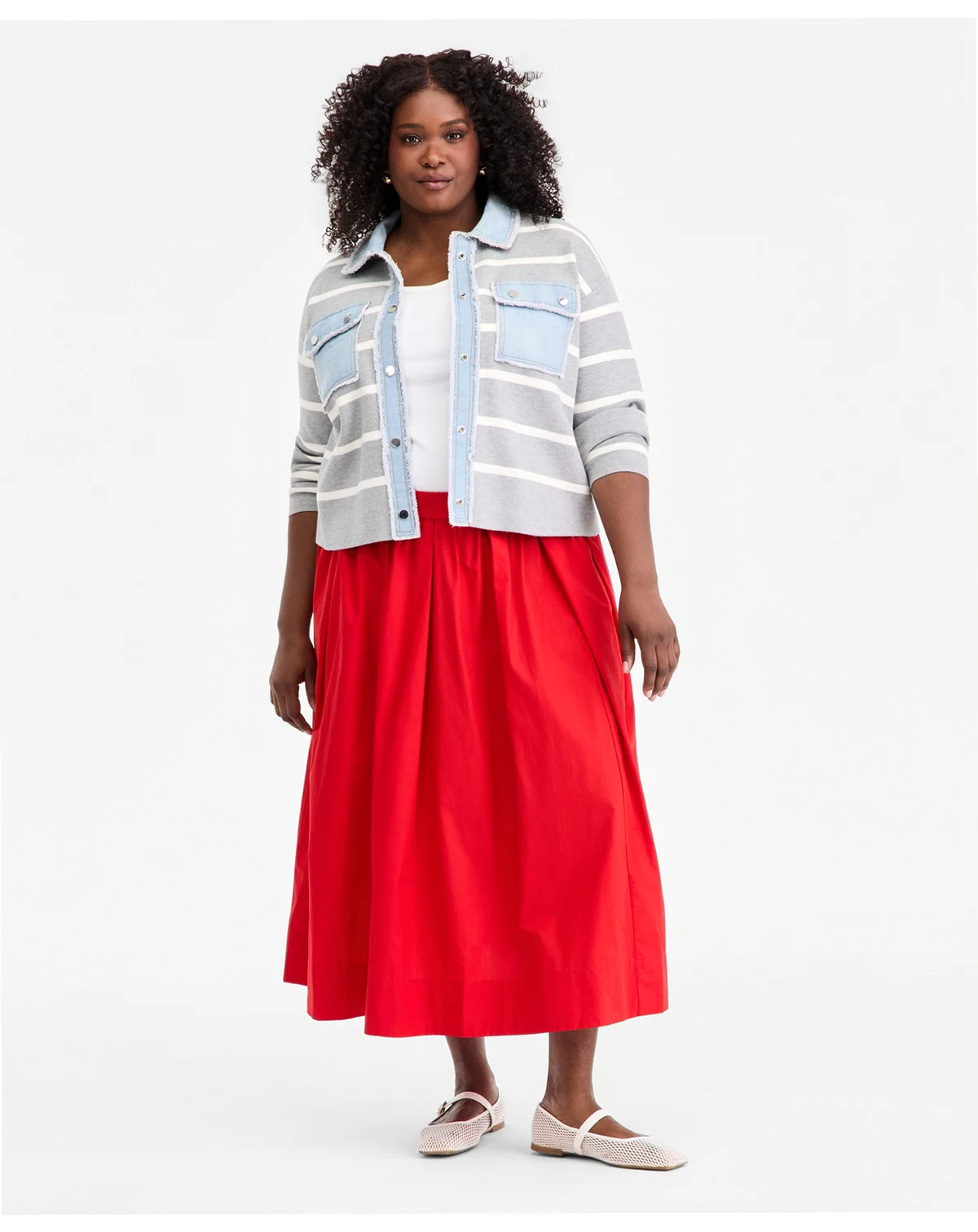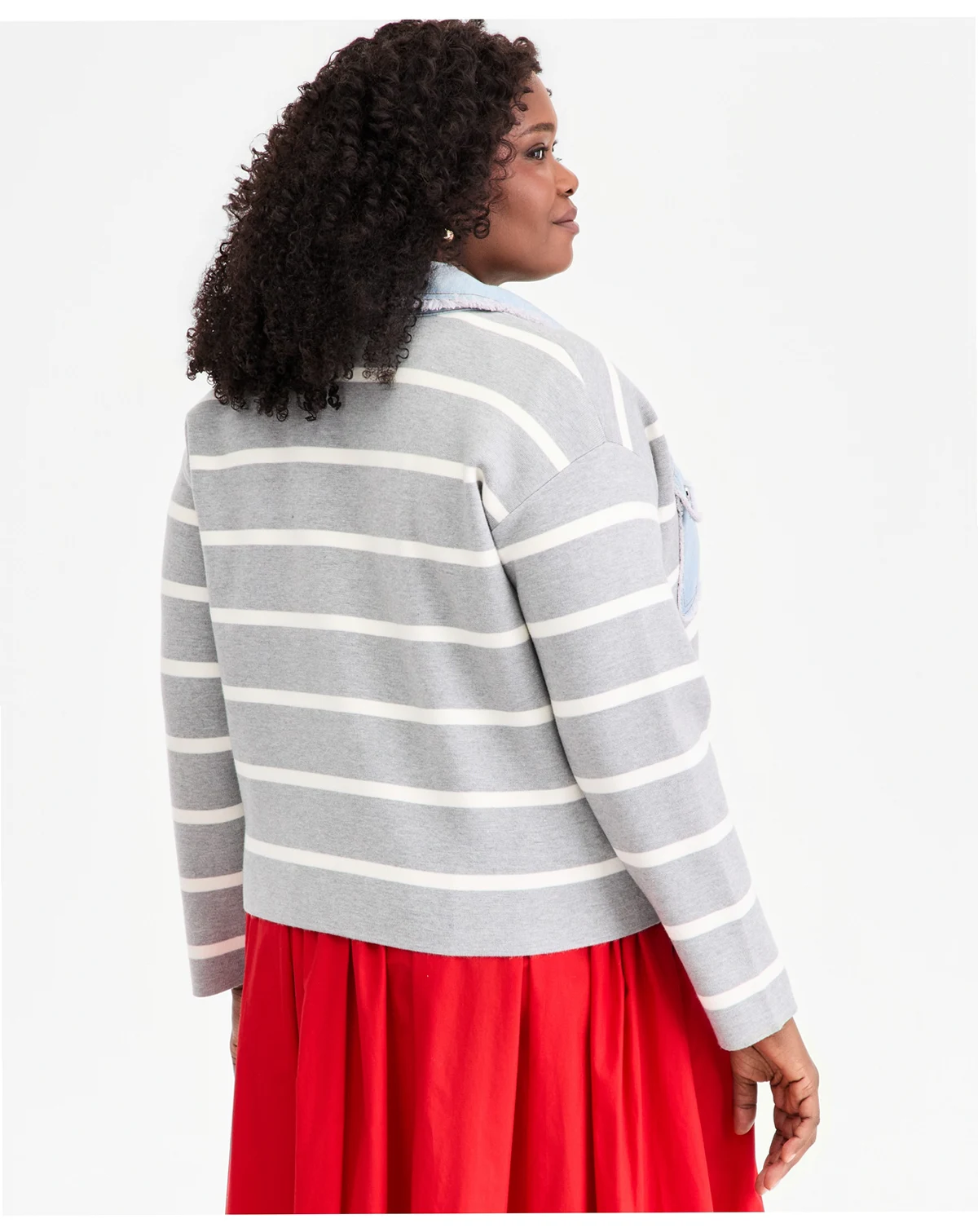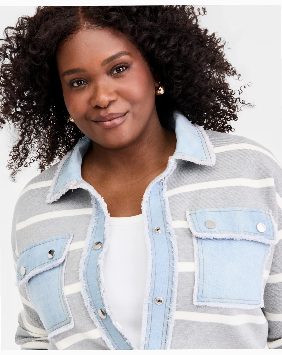 We love the modern mash-up of striped knit and frayed denim in this plus size snap-front jacket. Its edgy appeal leads to countless layering options. ABOUT THE BRAND: Our brand was designed for and with women like you. Made for your body, your style, and your truth. As your wardrobe's best friend, these mix-and-match pieces work with everything in your closet.