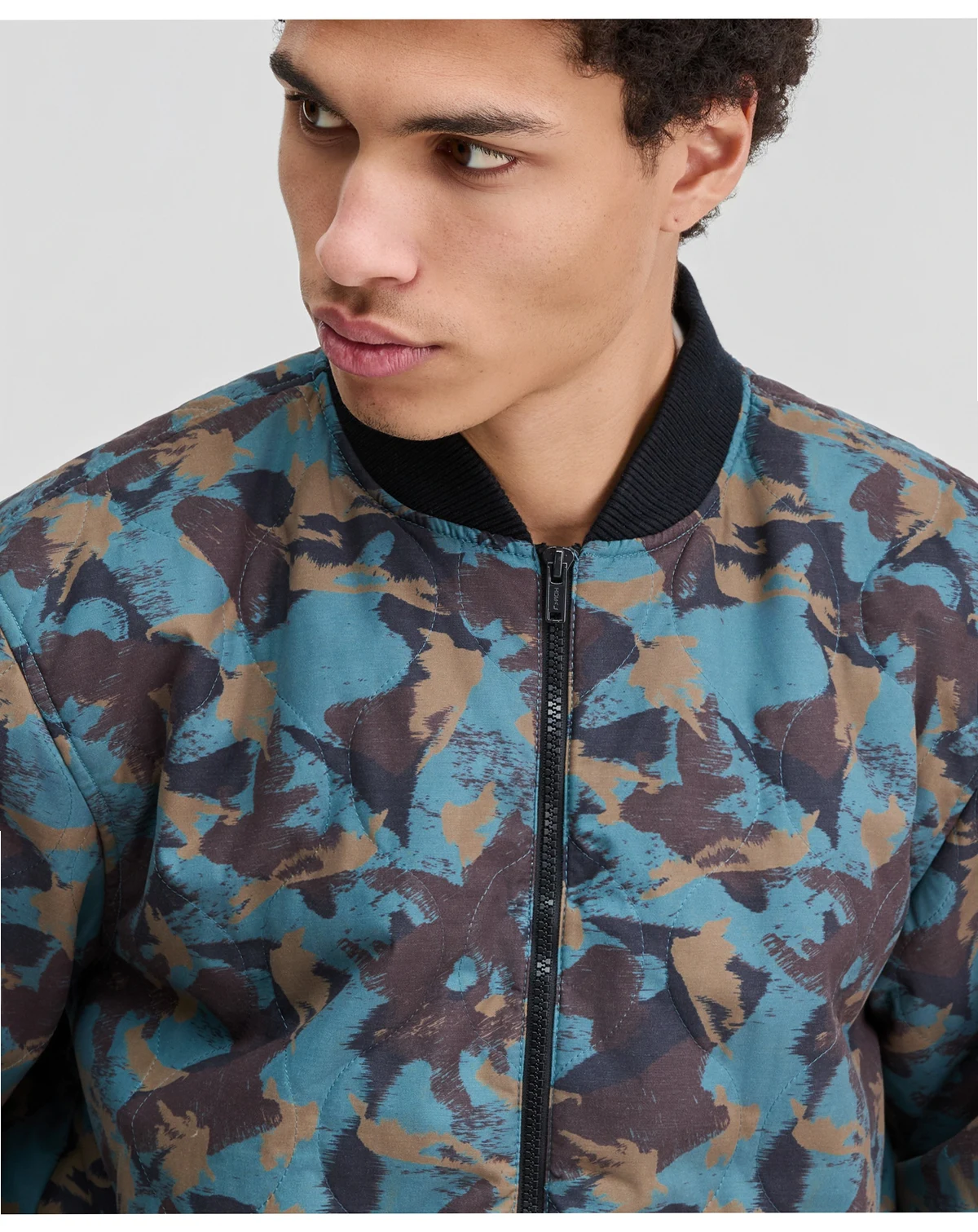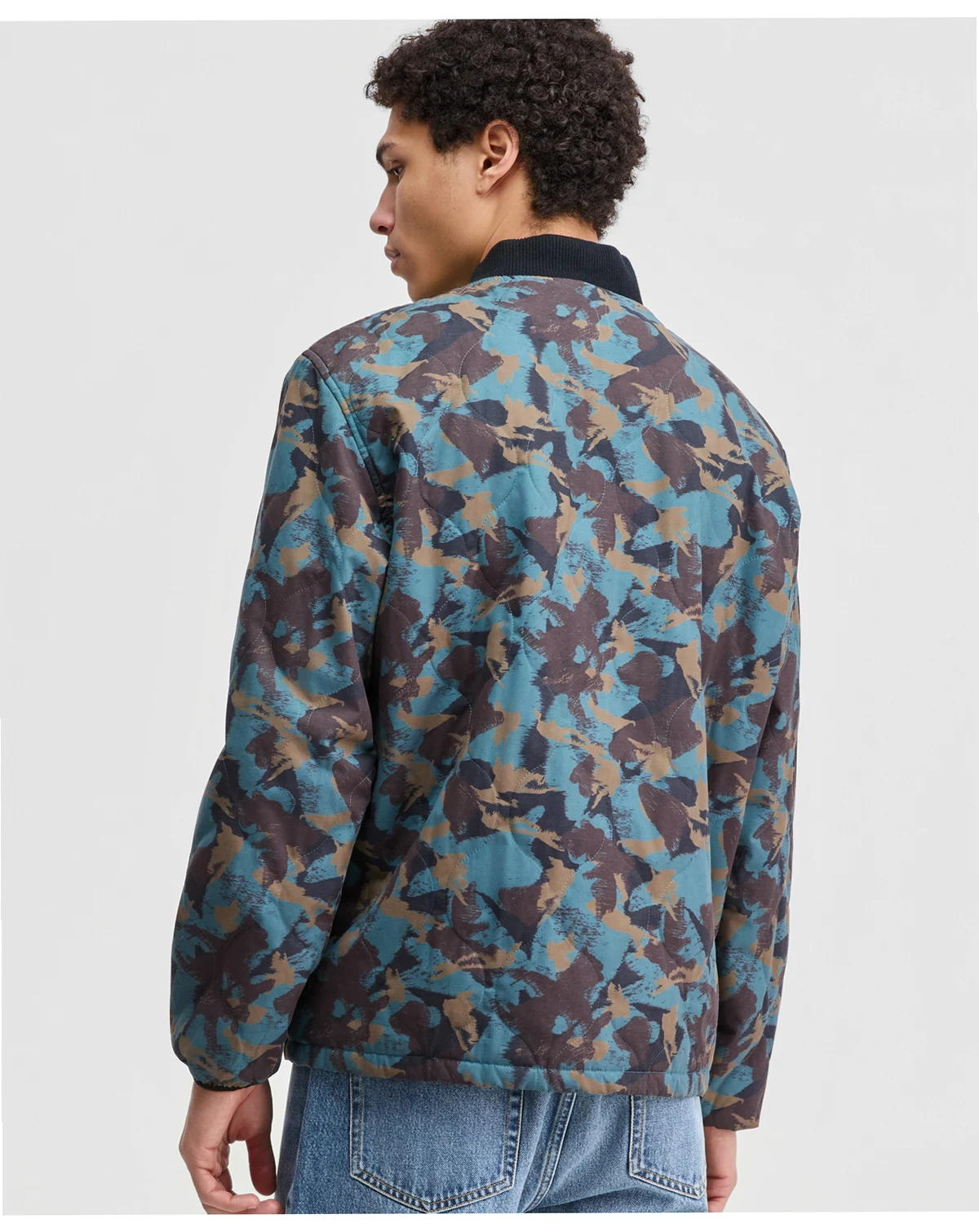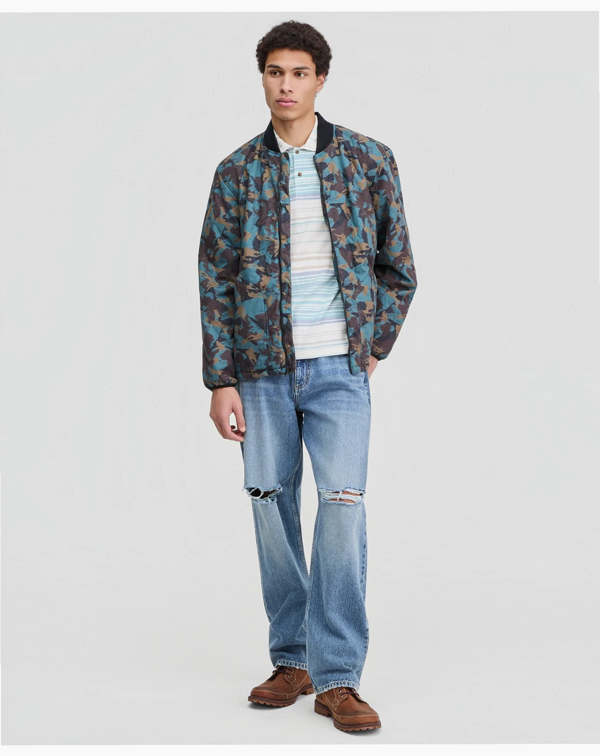 A dynamic print updates this Sun + Stone bomber jacket, giving you the perfect piece for energizing your cool-weather look.