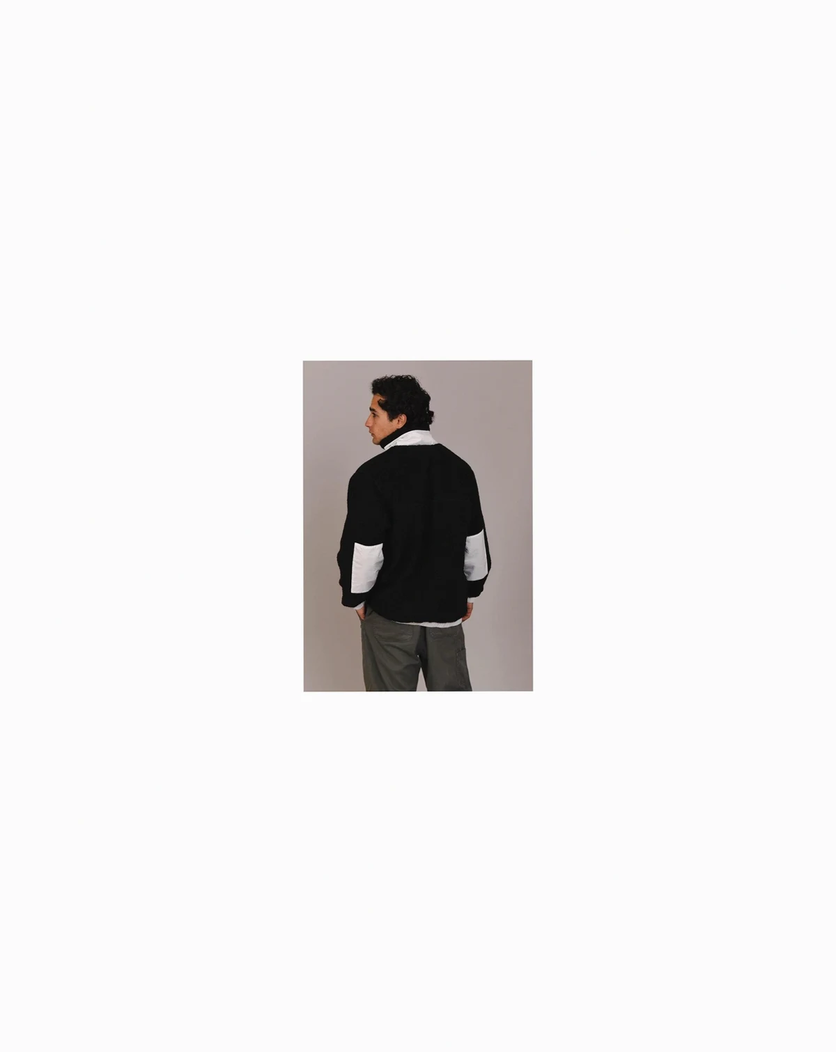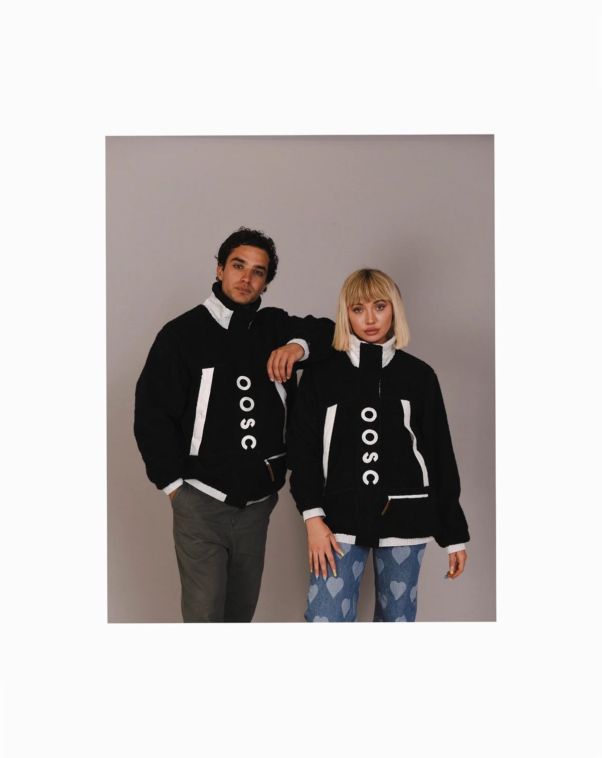 The OOSC Sherpa Fleece Jacket in Black / White has been constructed from 100% Recycled polyester and features a breathable mesh lining, a nylon collar and elbow patches, a full YKK zip covered by a placket with statement OOSC branding and two kangaroo pouch hand warmer pockets.
