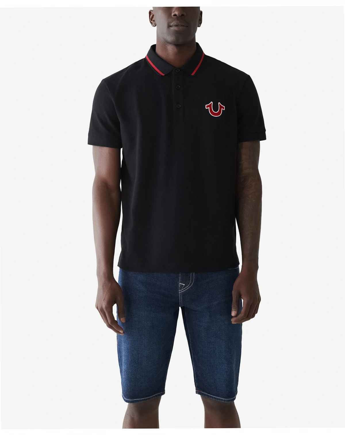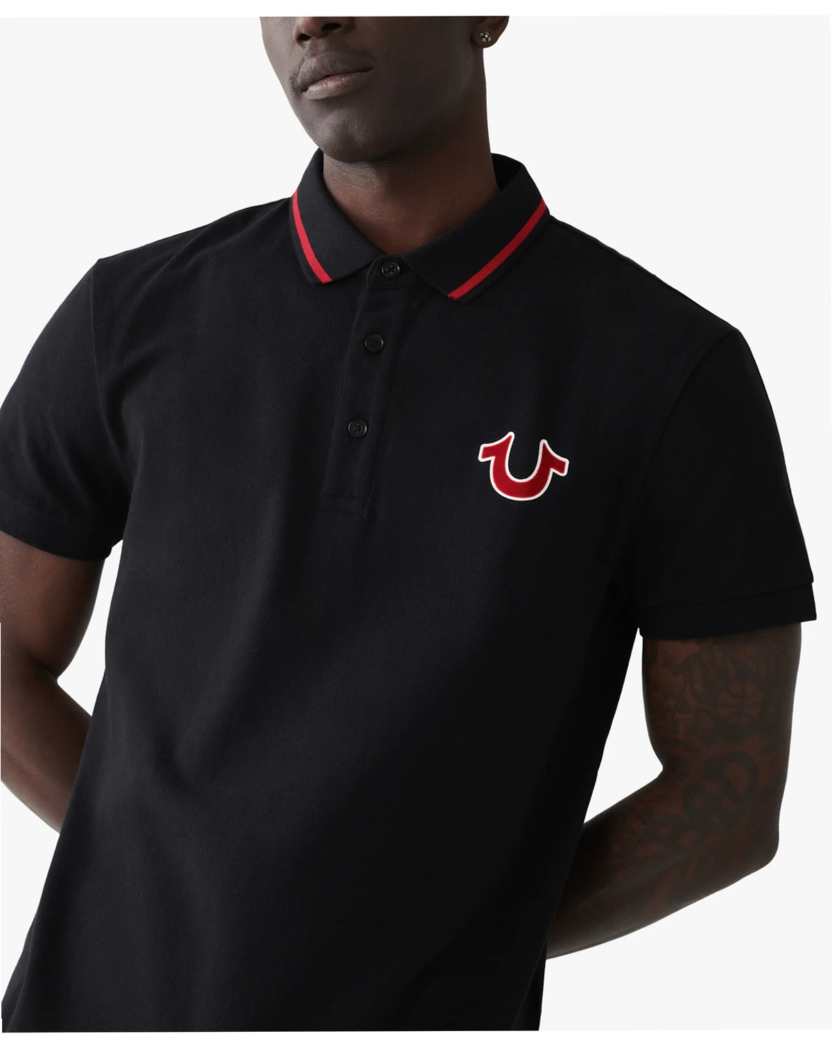 This men's collared polo shirt features a 3-button placket and is detailed with contrast striping at the collar and sleeves. Finished with our signature horseshoe at the chest and our classic Buddha logo design across the back.