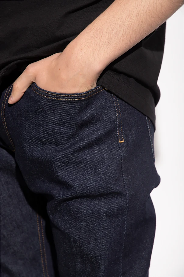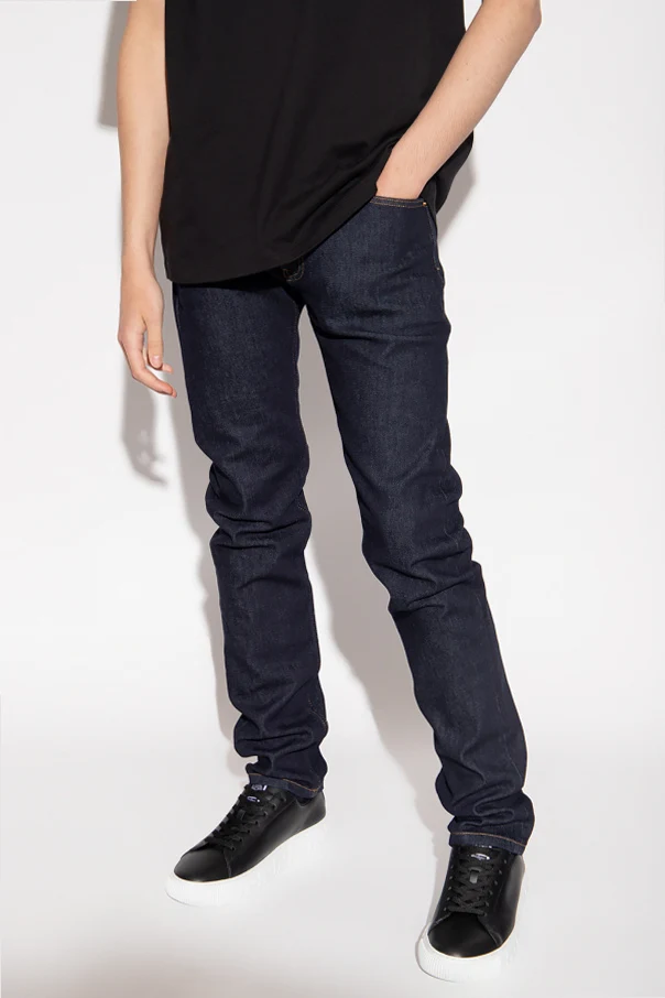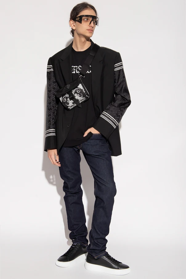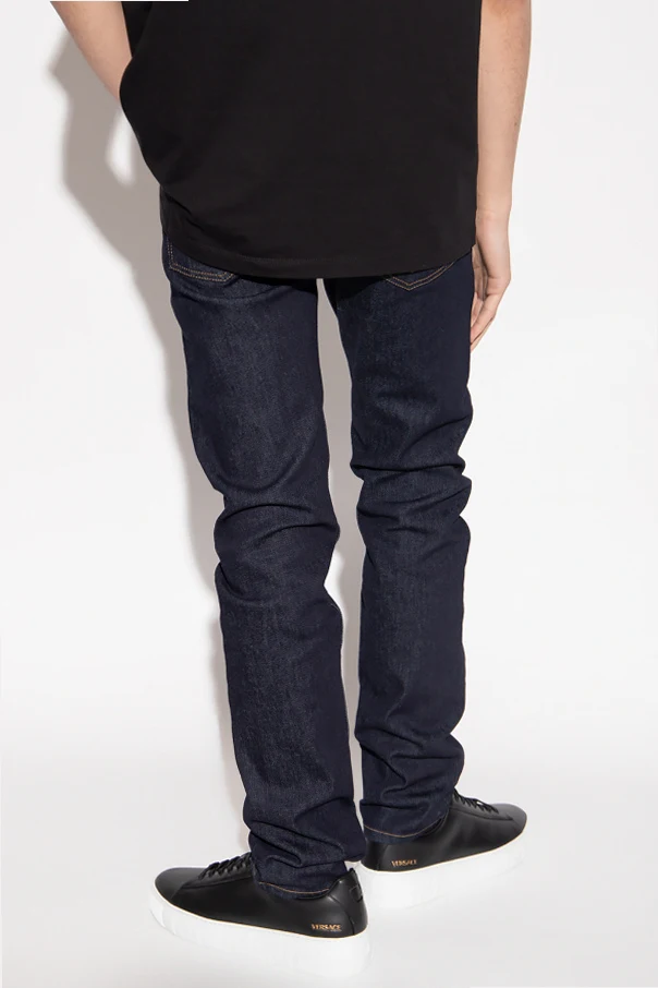 Navy slim fit jeans from Versace. Fastened with a zip and decorative buttons in gold-tone, this pair features a patch, appliqué, black leather patch with the iconic Medusa head appliqué, Greca motif, logo detail, five slip pockets with a Medusa embroidery and tapered legs.