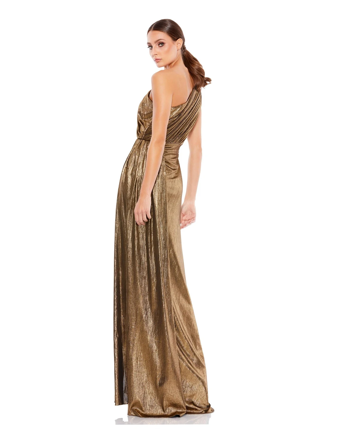 Elevate your style with this Grecian-inspired evening gown crafted from rich metallic jersey. The one-shoulder design features a draped skirt, thigh-high slit, and subtle train for an elegant, unforgettable look at weddings, galas, and formal events.