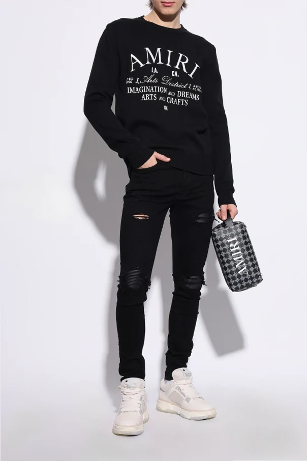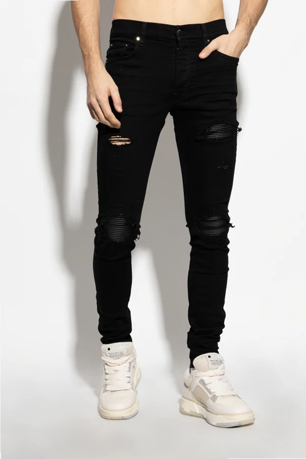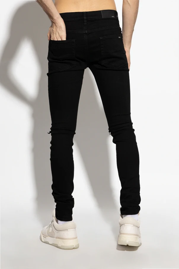 Black skinny jeans from Amiri. Falling with tapered legs, this pair features silver-tone branded button closures, classic five pockets, distressed effects, quilted leather details and a logo appliqué accompanied by a patch at the back.