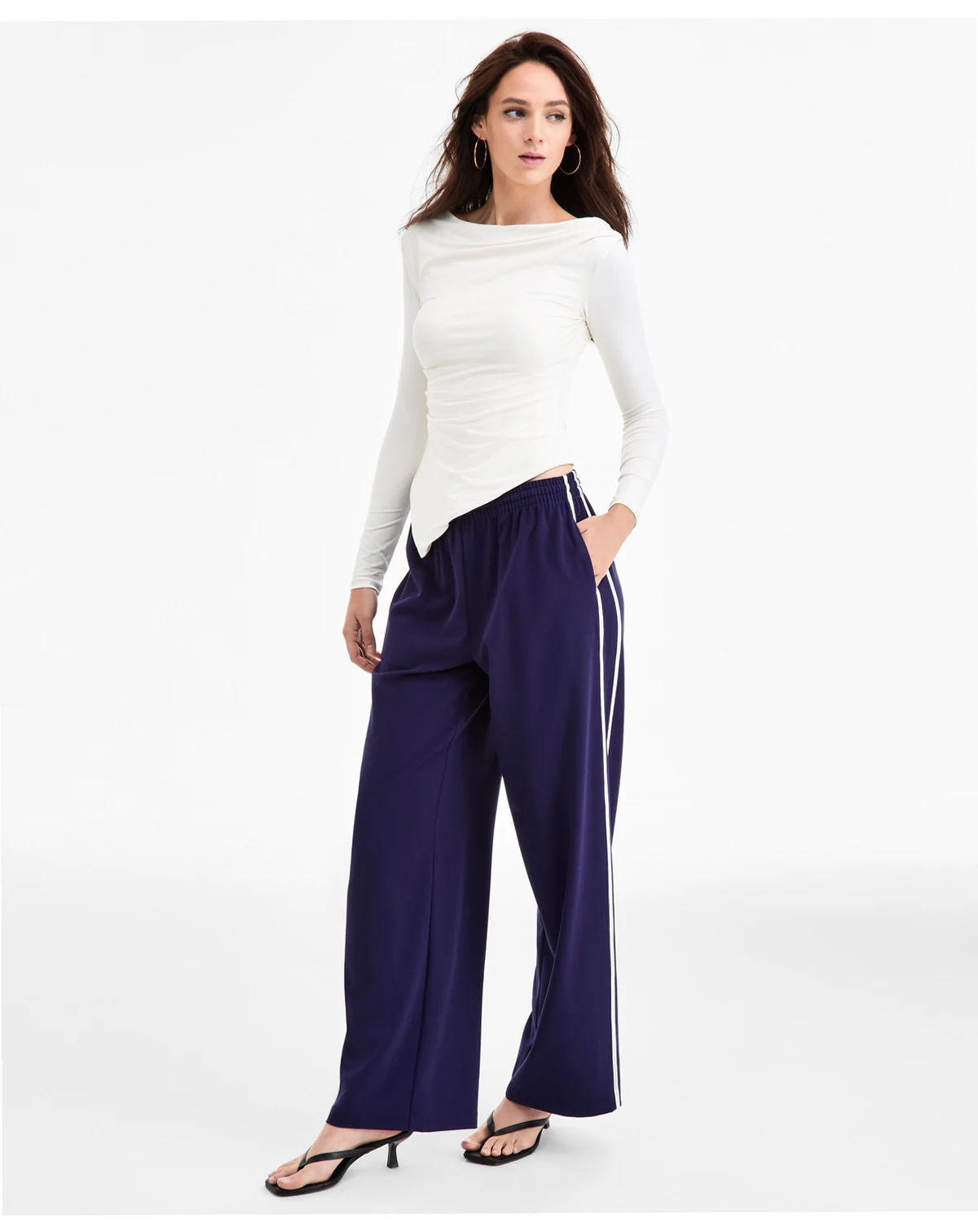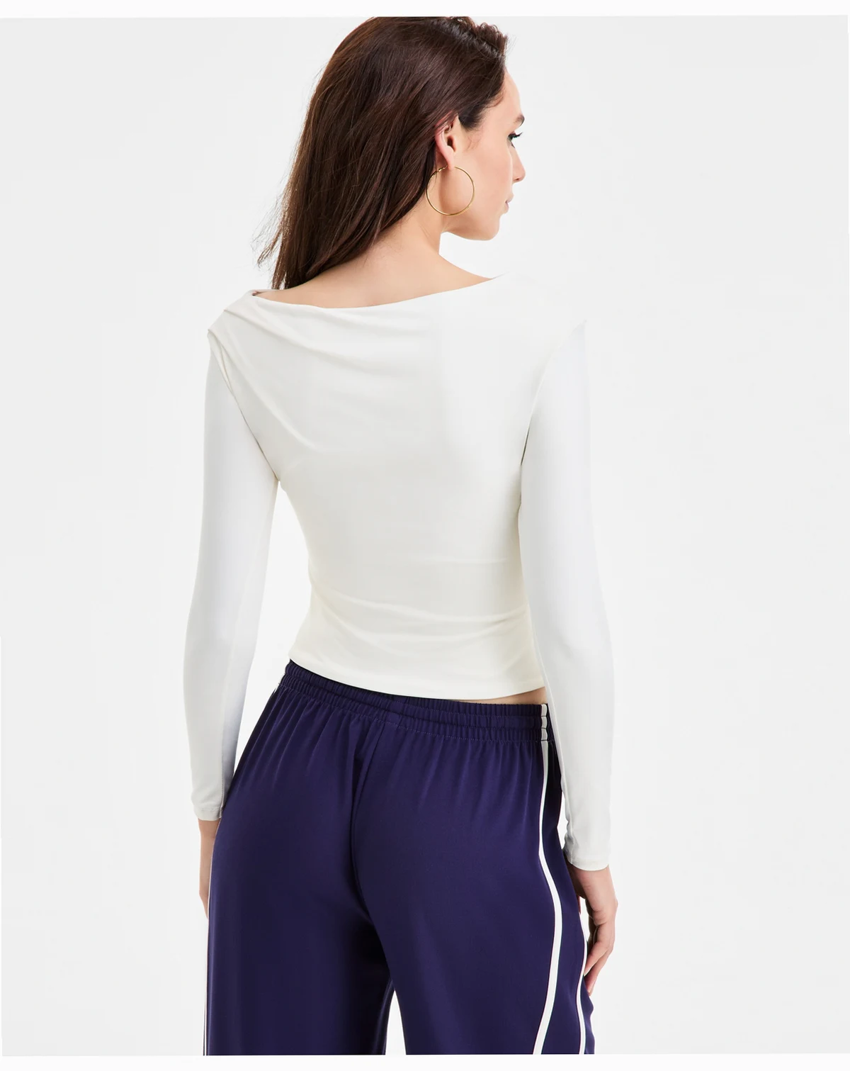 Bar III rethinks a boat-neck top, adding ruched side seams and an asymmetrical hem in front.