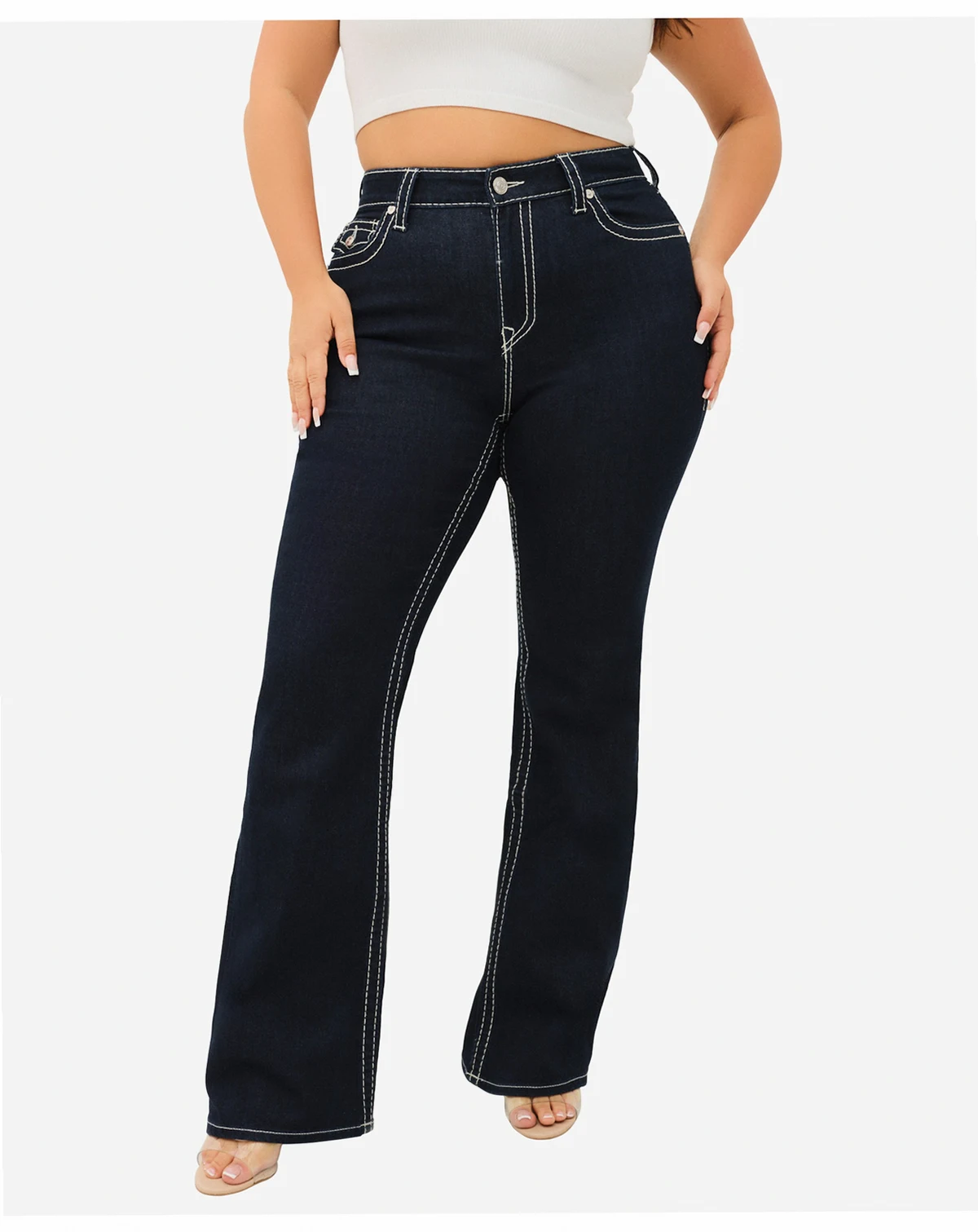 Classic and detailed, these True Religion jeans feature a mid-rise waist with a zip fly and belt loops. Big T stitching, silver-tone hardware, and horseshoe detailing on the flap pockets add signature style to a dark rinse finish.
