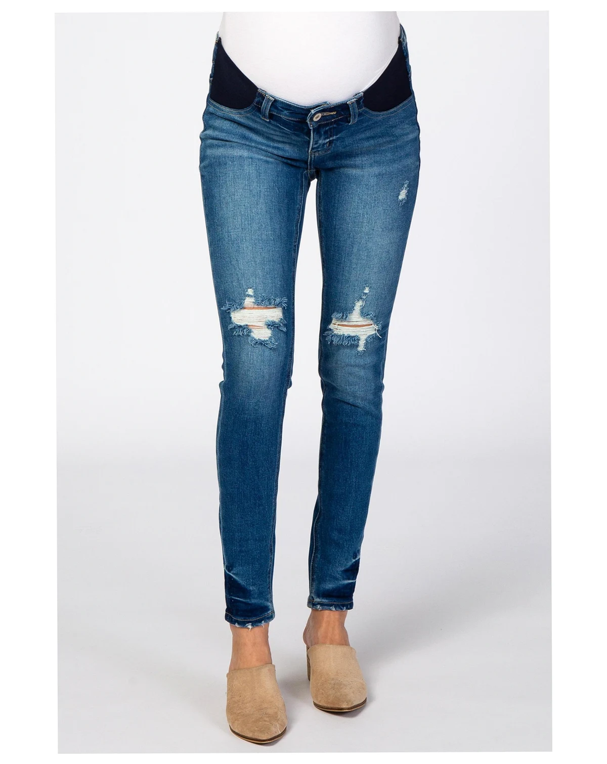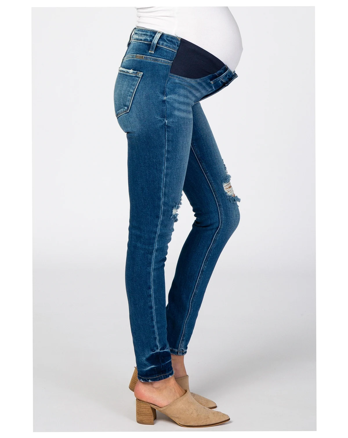 Meet your new go-to jeans for comfort and style! These Distressed Side Insert Maternity Jeans are designed to fit and flatter through every stage of pregnancy. Featuring a trendy distressed wash and stretchy side inserts, they offer extra room for your growing bump without sacrificing style. The classic denim, paired with subtle rips and a slim fit, ensures you stay on-trend and comfortable no matter the occasion. Perfect for dressing up or down—pair with your favorite tees, tunics, or sweaters. Experience the perfect blend of support, flexibility, and fashion in one chic pair of maternity jeans!