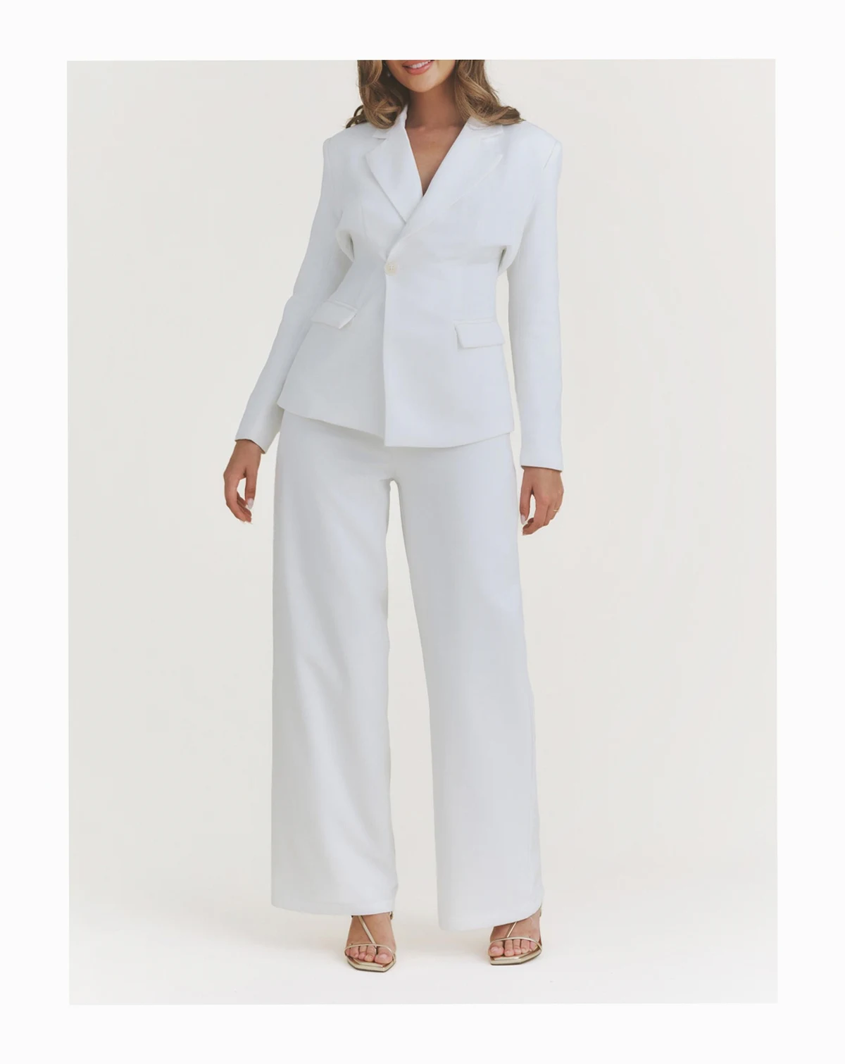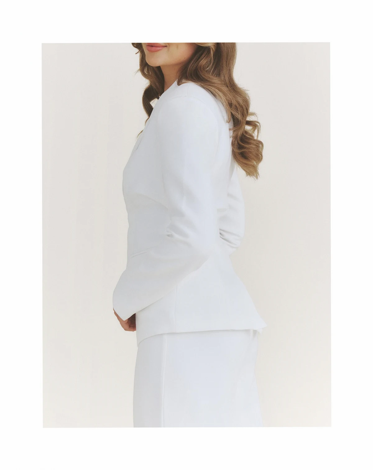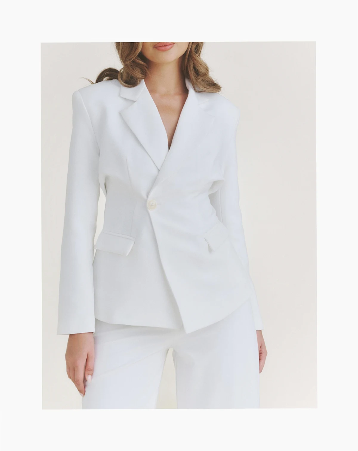 With a striking neckline, side button fastening, and gathered waist detail for a cinched silhouette, the Asym Tailored Jacket is a premium white piece made for special occasions. It is fully lined and finished with classic lapels - tailoring made modern.