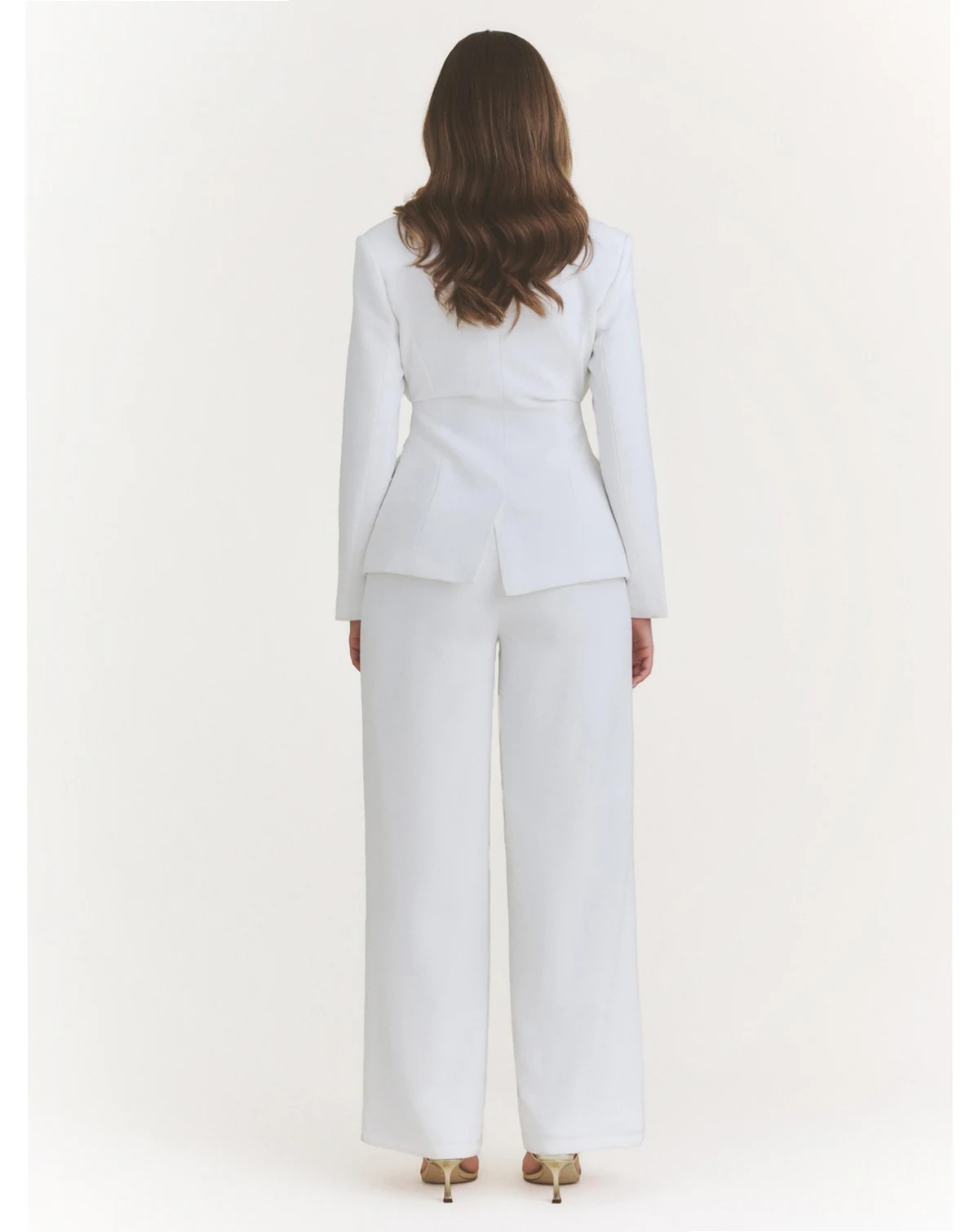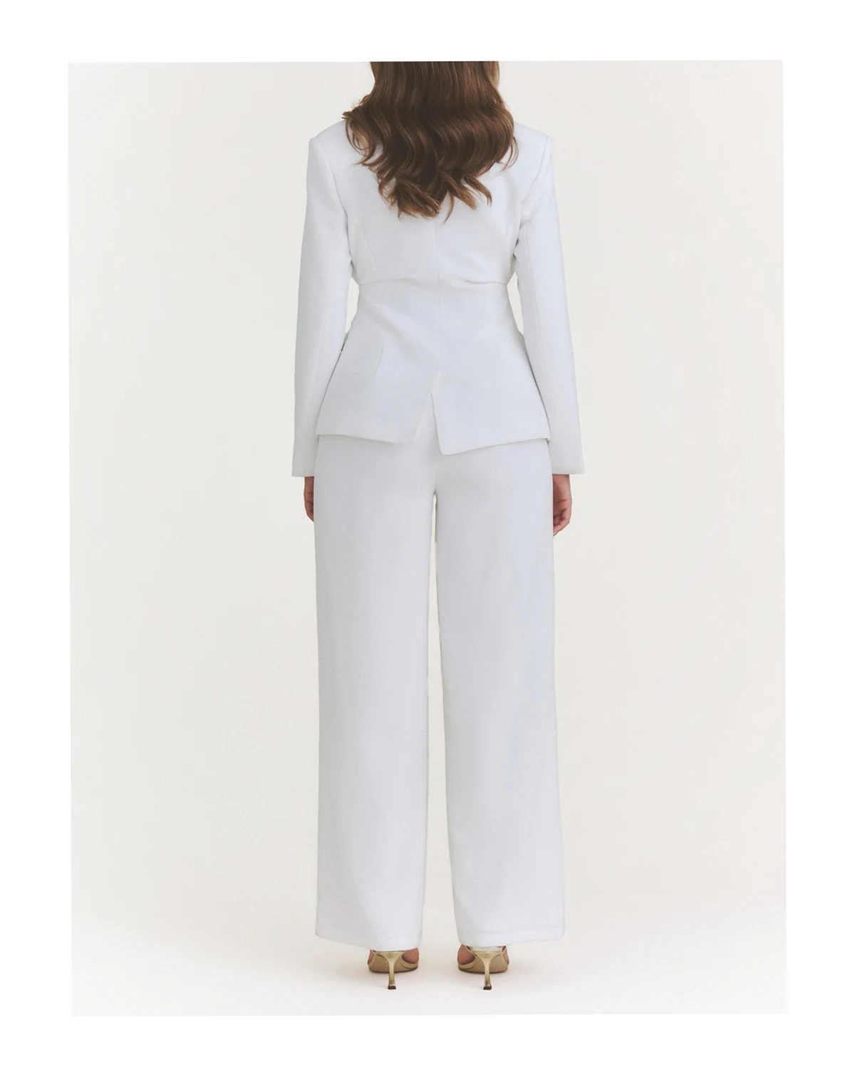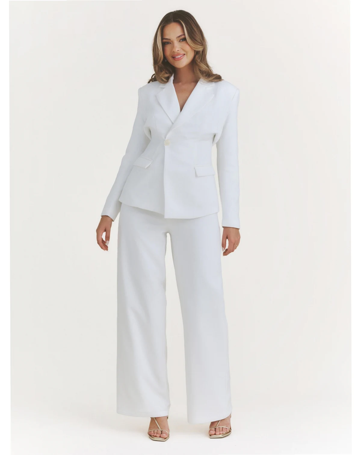 With a striking neckline, side button fastening, and gathered waist detail for a cinched silhouette, the Asym Tailored Jacket is a premium white piece made for special occasions. It is fully lined and finished with classic lapels - tailoring made modern.
