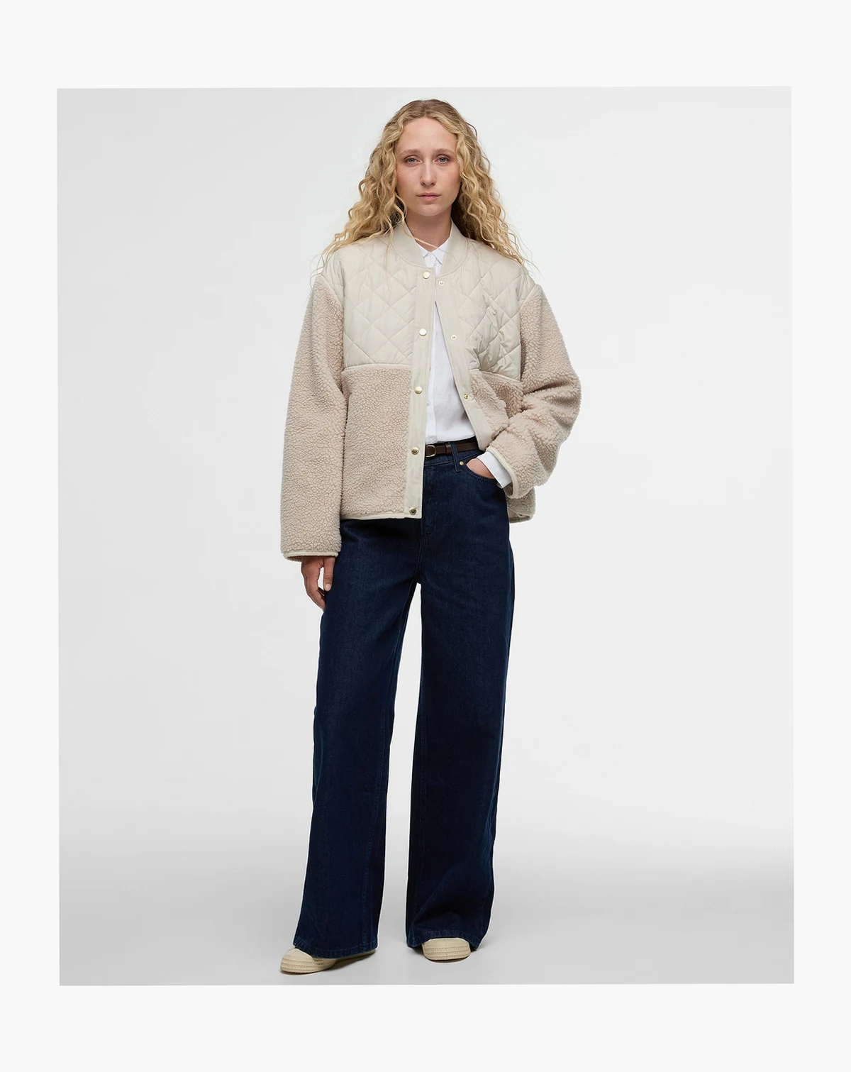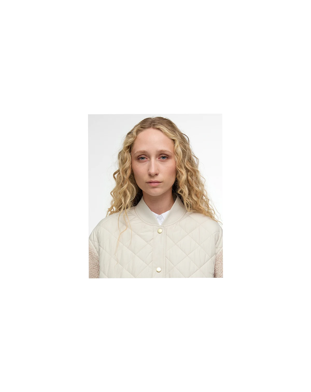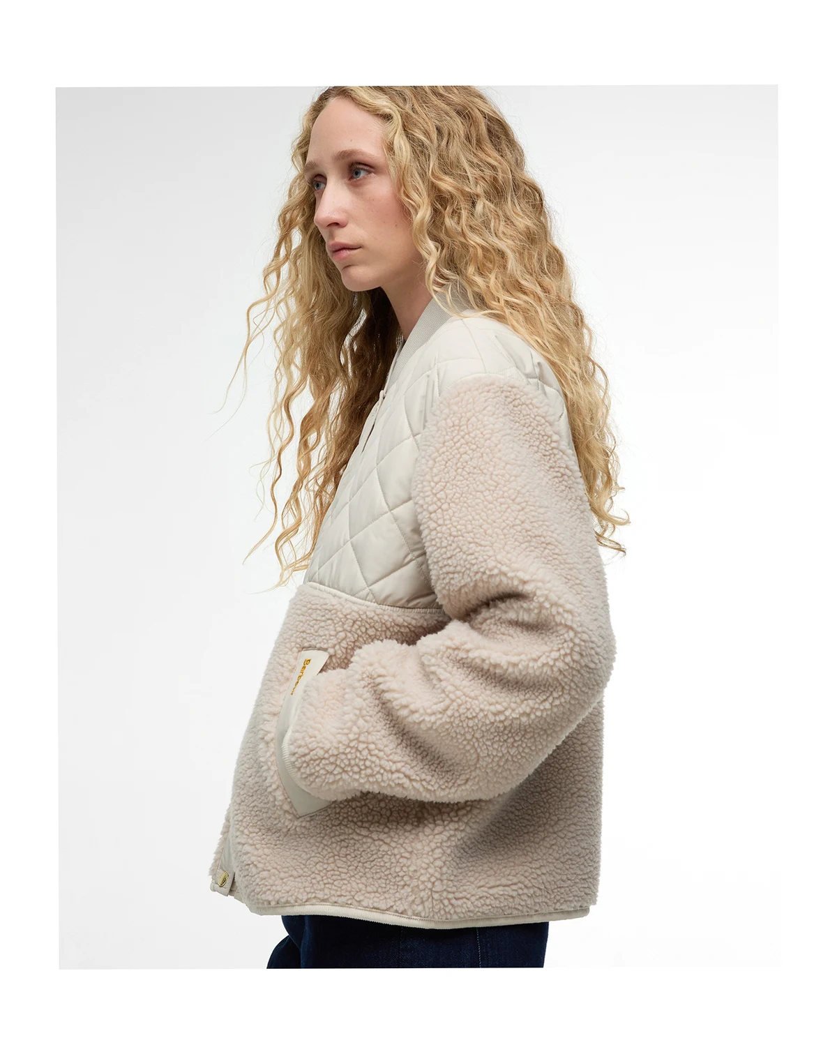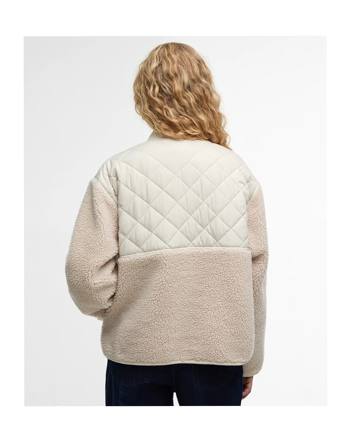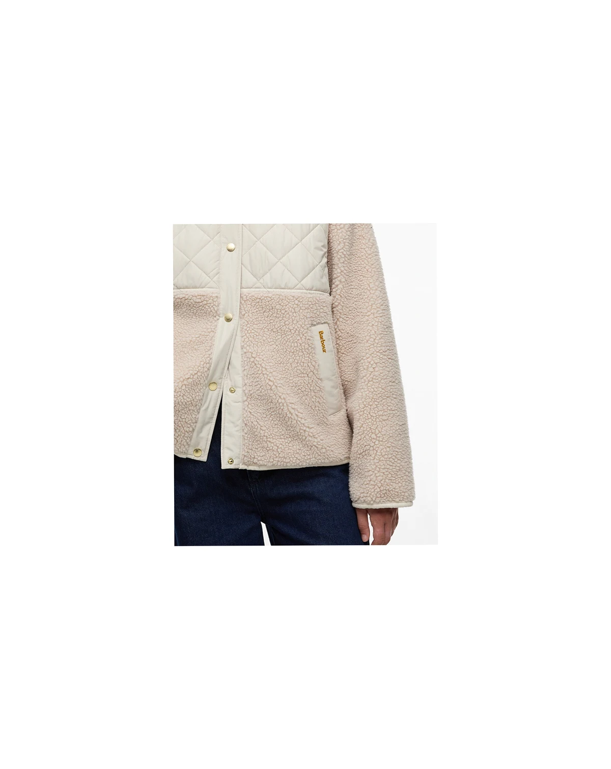 Cozy with a modern edge, this chic Barbour jacket features contrast quilted panels, a studded front fastening, a rib collar, and welt pockets, combining style with functional appeal.