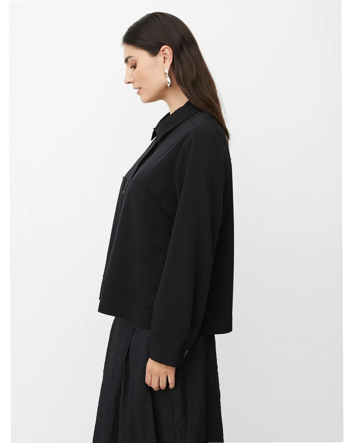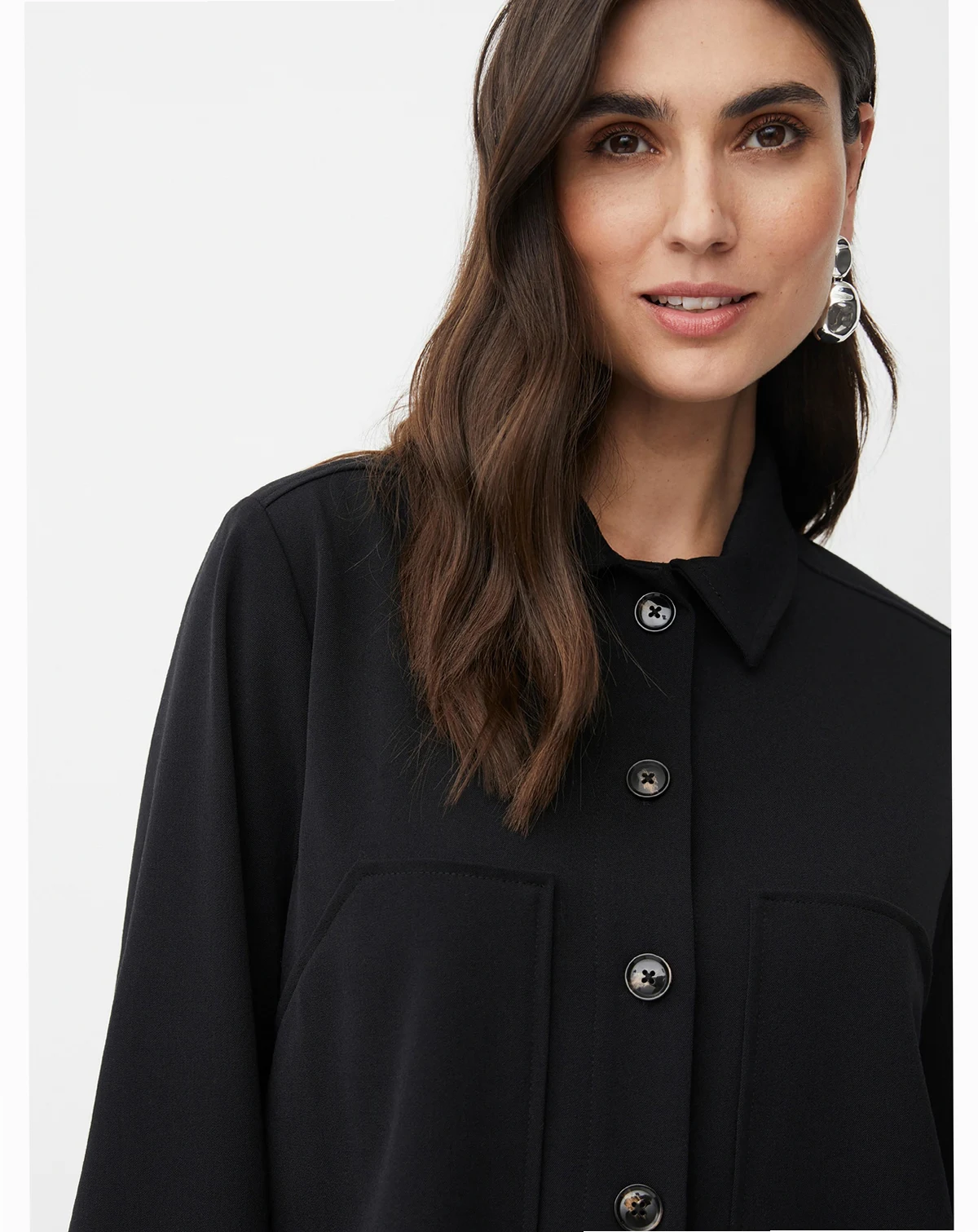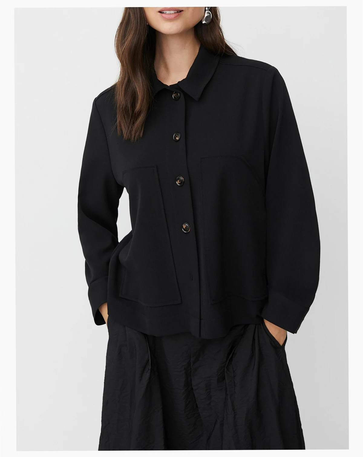 Simple, stylish, elegant - this shirt jacket is perfect for everything! It is crafted from a light and comfortable fabric with a classic shirt collar, buttons, and large decorative slit pockets at the front.