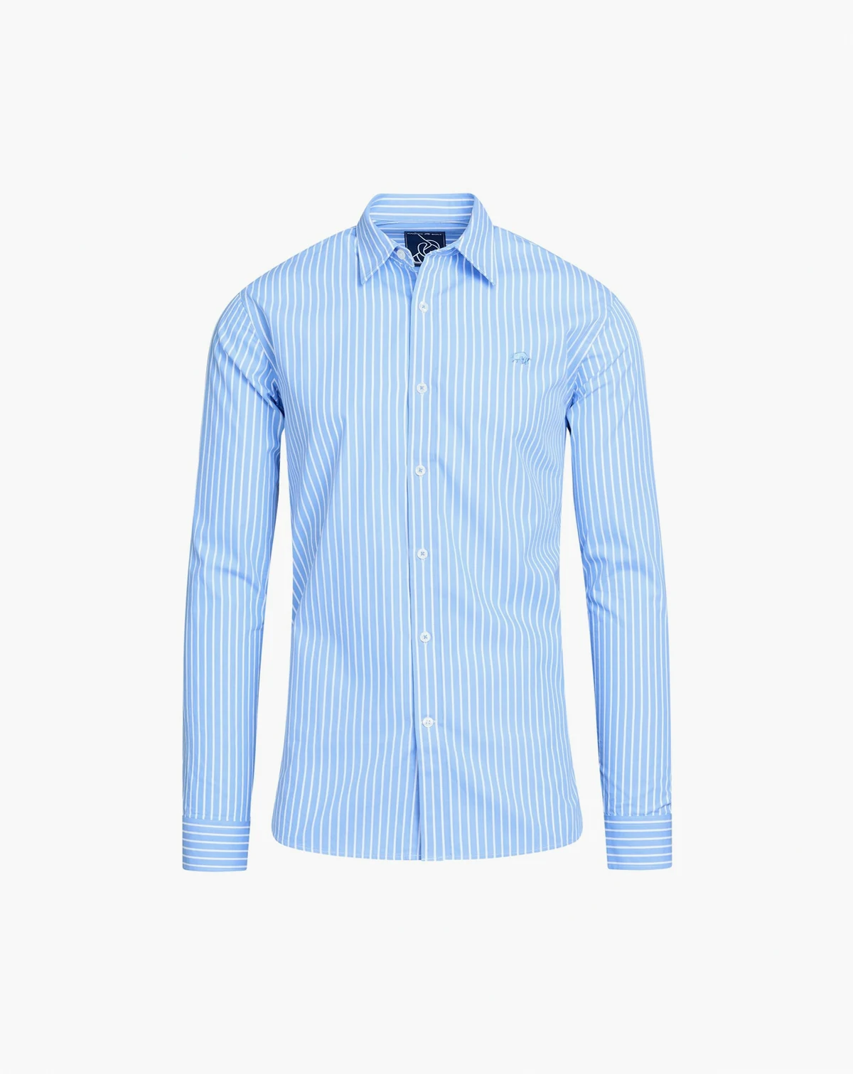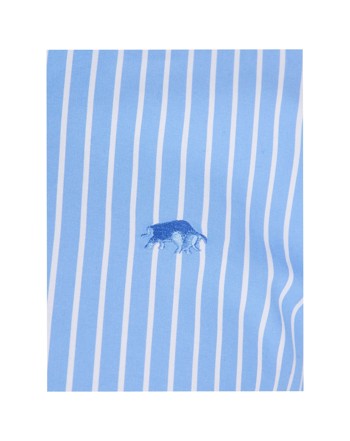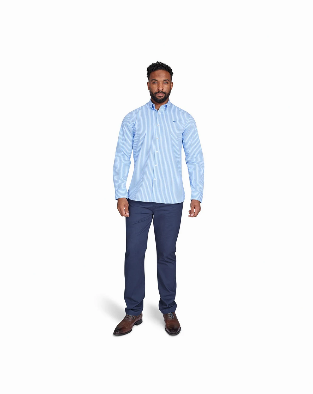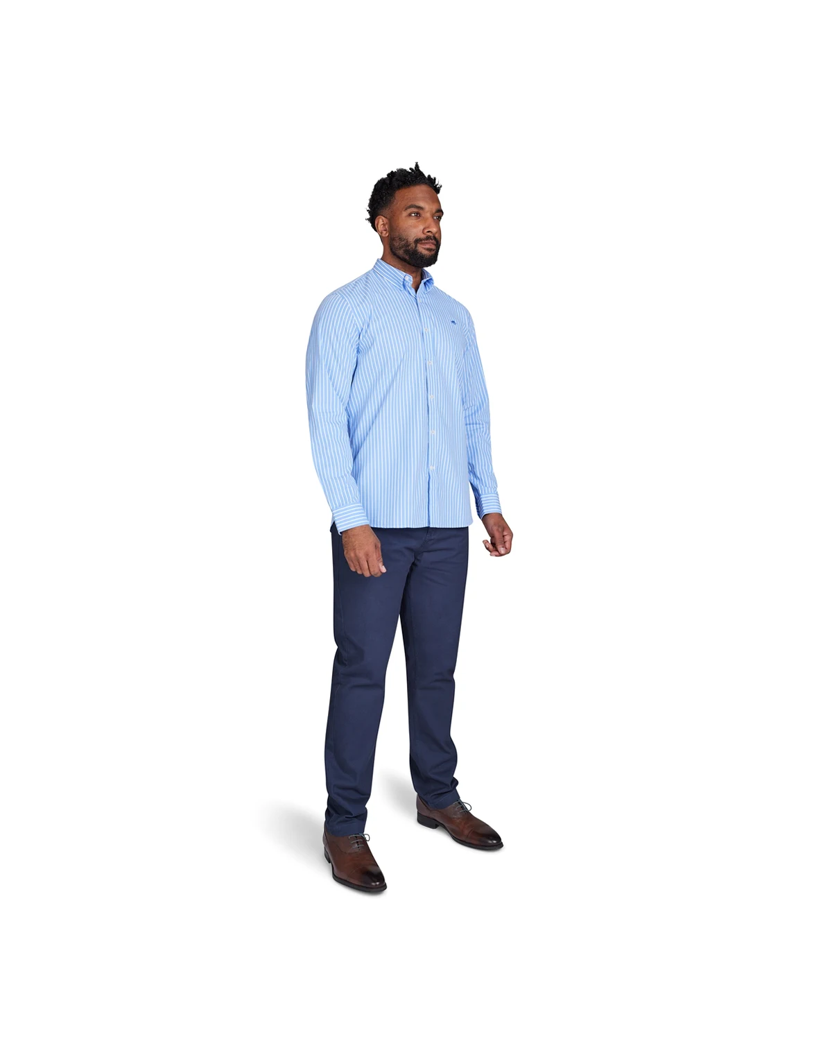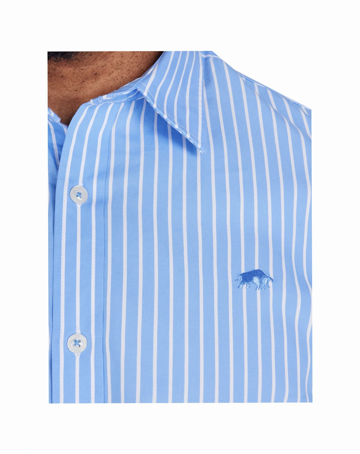 This Classic Long Sleeve Stripe Shirt is made from 100% cotton and is perfect for office wear. The stylish vertical white and light blue stripes make it a timeless wardrobe staple. It features a signature Raging Bull logo embroidered on the left chest in navy blue and button cuffs. Quality construction ensures long-lasting style. Available in a wide range of styles from small to big and tall - up to 6XL.
