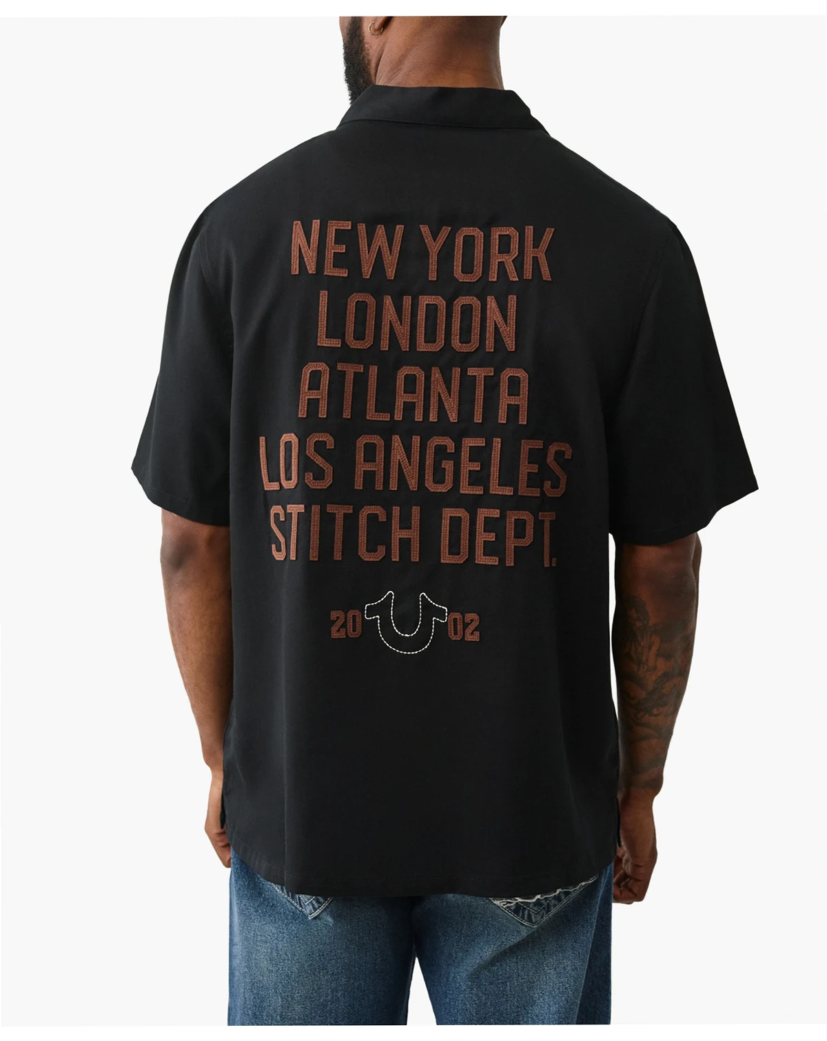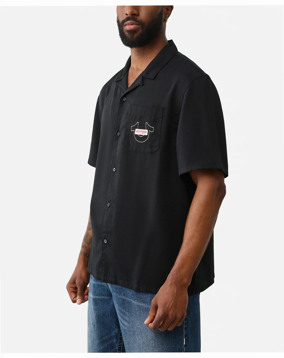 Graphic printing creates visual interest on this camp shirt from True Religion. A horseshoe-detailed chest pocket and short sleeves provide casual comfort.