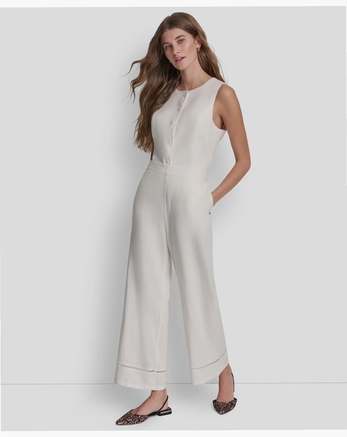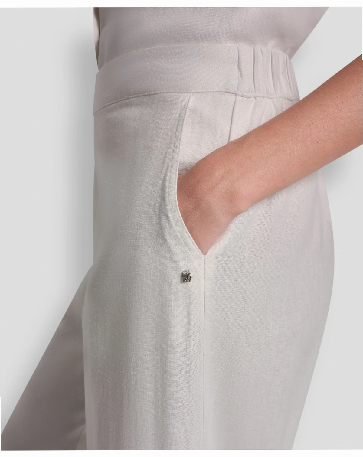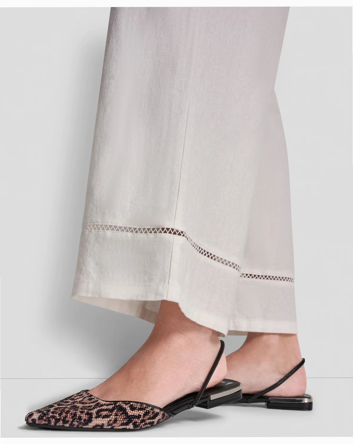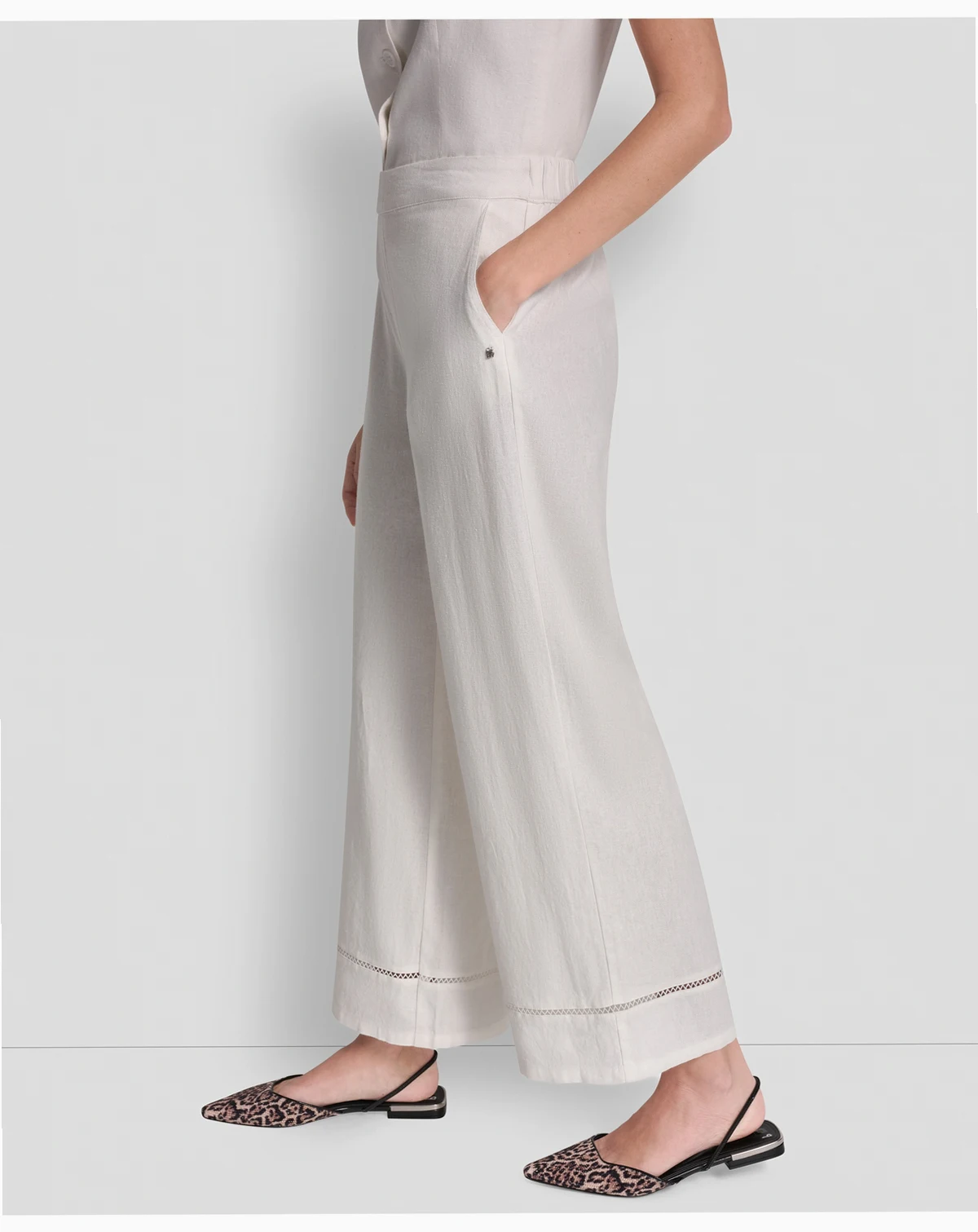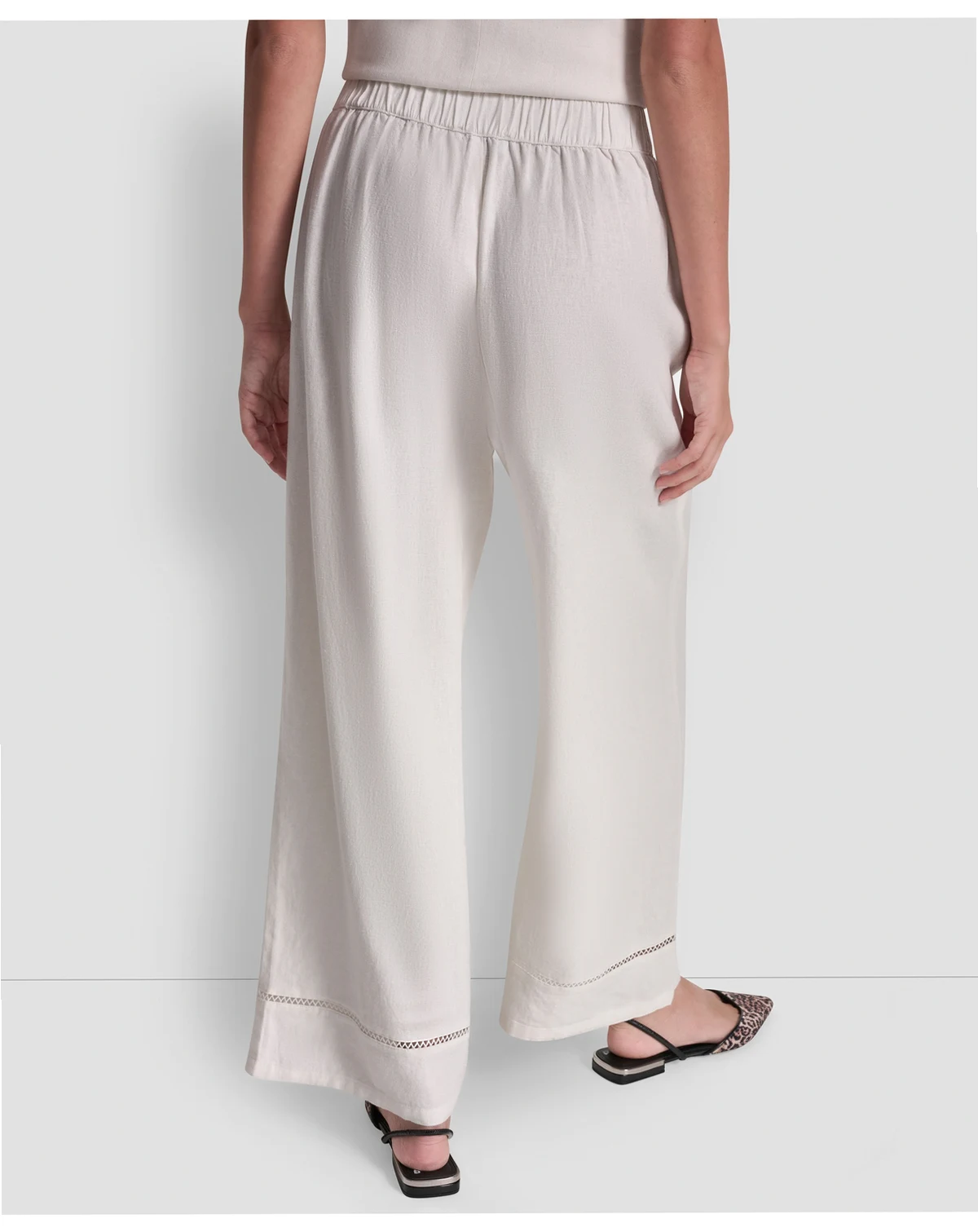 Experience effortless elegance with these pants by DKNY Jeans, featuring a high-rise waist and a wide-leg ankle silhouette. A delicate lace inset at the hem adds a unique, feminine detail.
