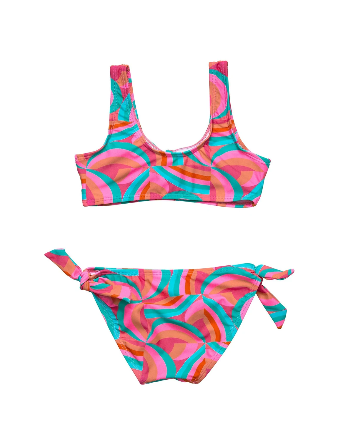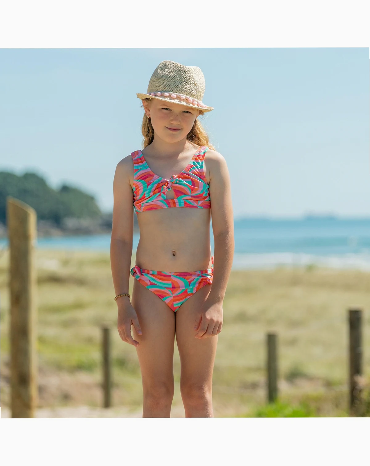 In swimwear as slick as this, your girl will be making a splash in more ways than one. This girls' crop bikini features ties on the top and bottoms and a keyhole cut-out at the front. Made from REPREVE recycled fabric, complete with home packaging and recycled paper swing tags.
