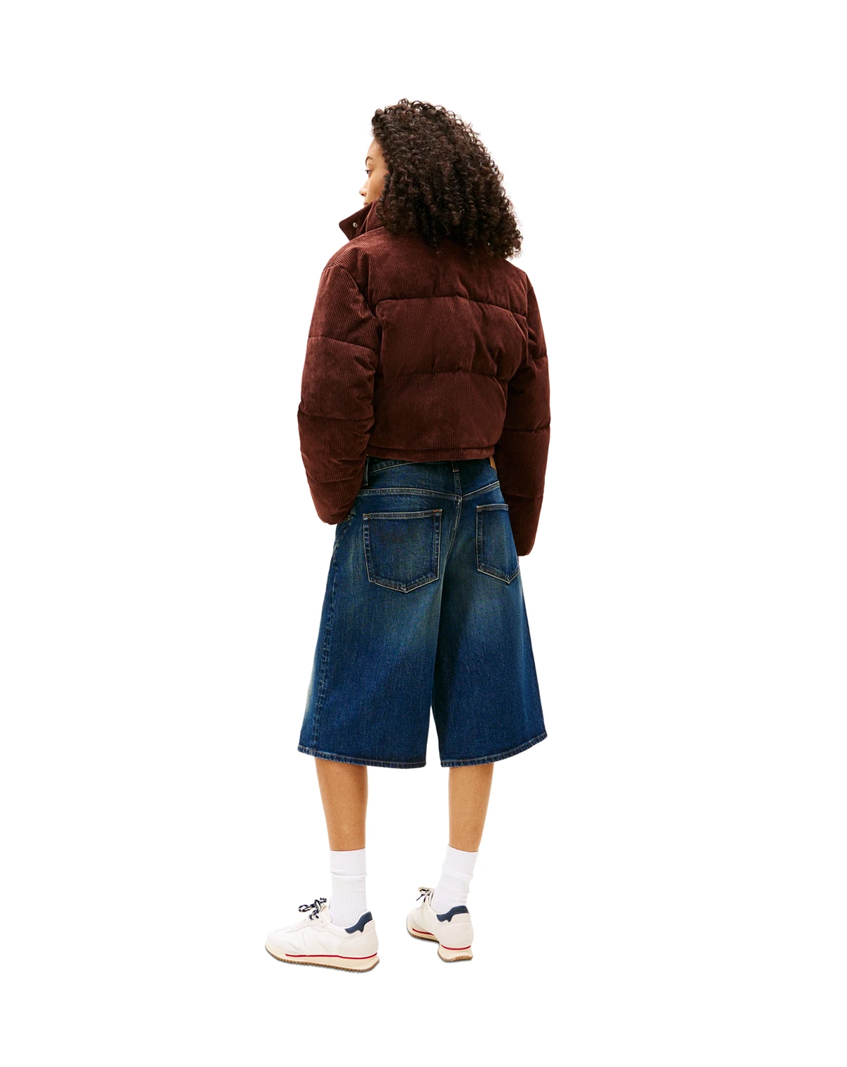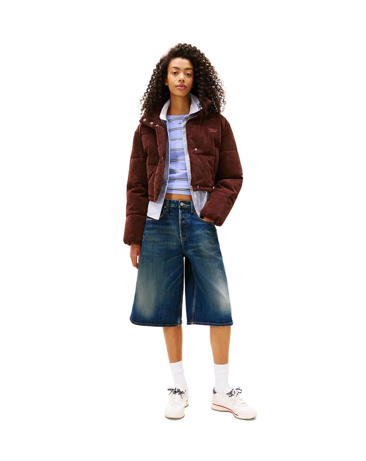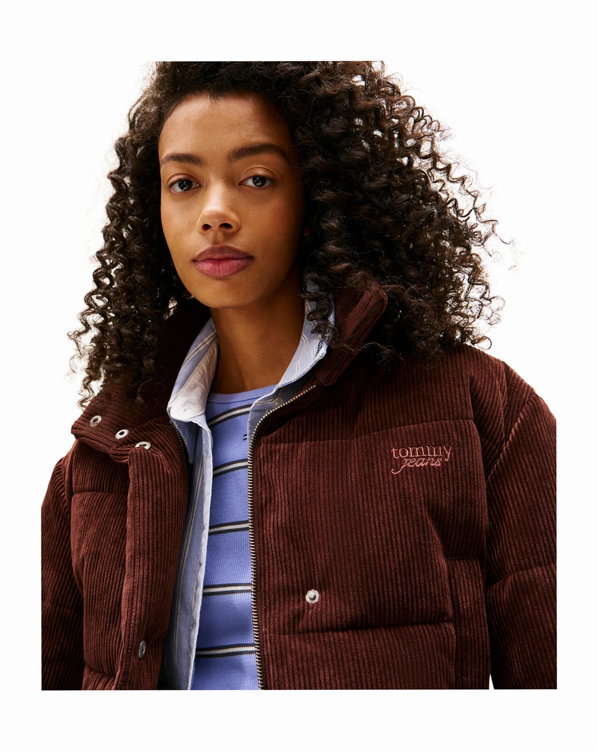 Corduroy brings fresh texture to the cozy tone of this cropped zip-front puffer jacket from Tommy Jeans.