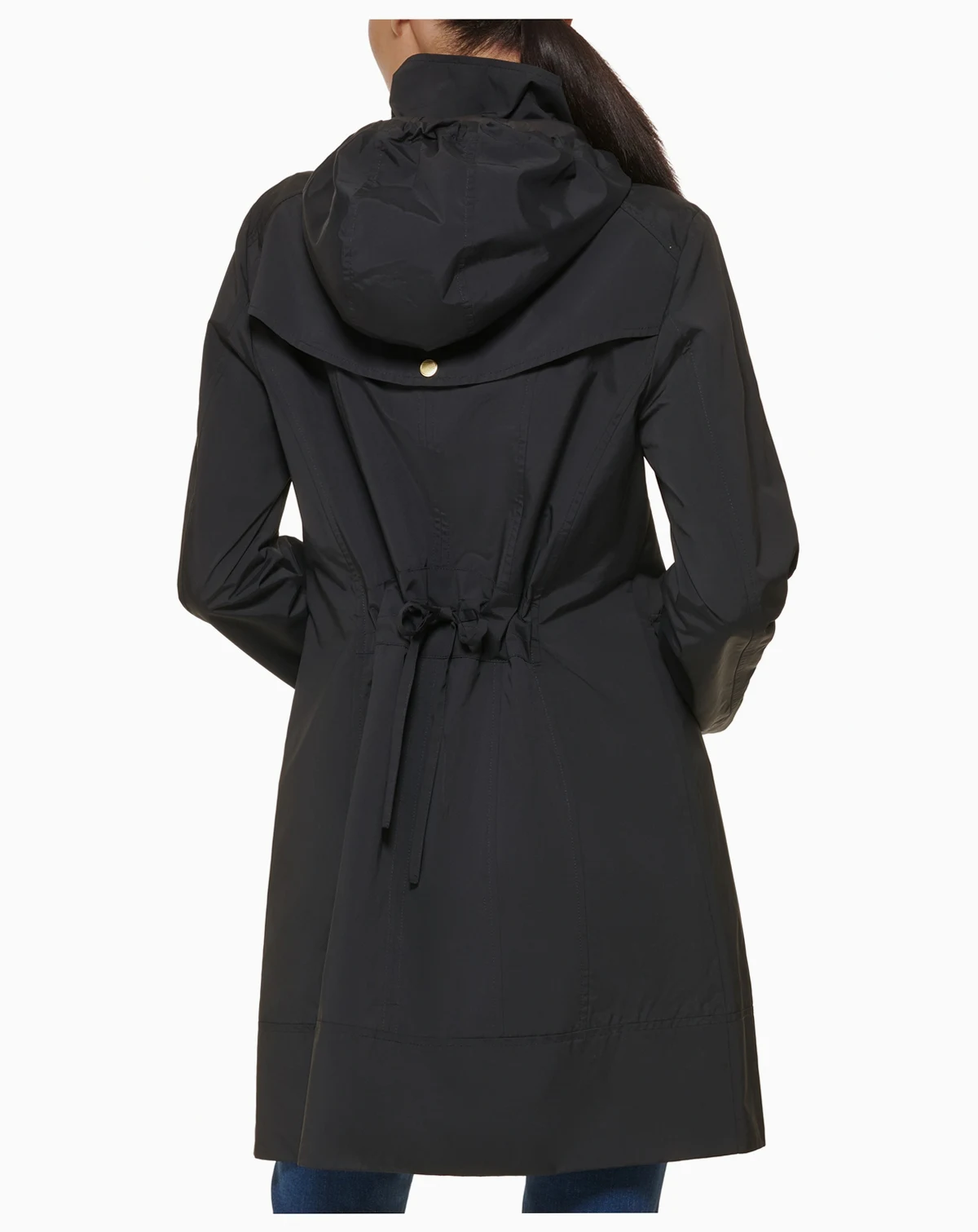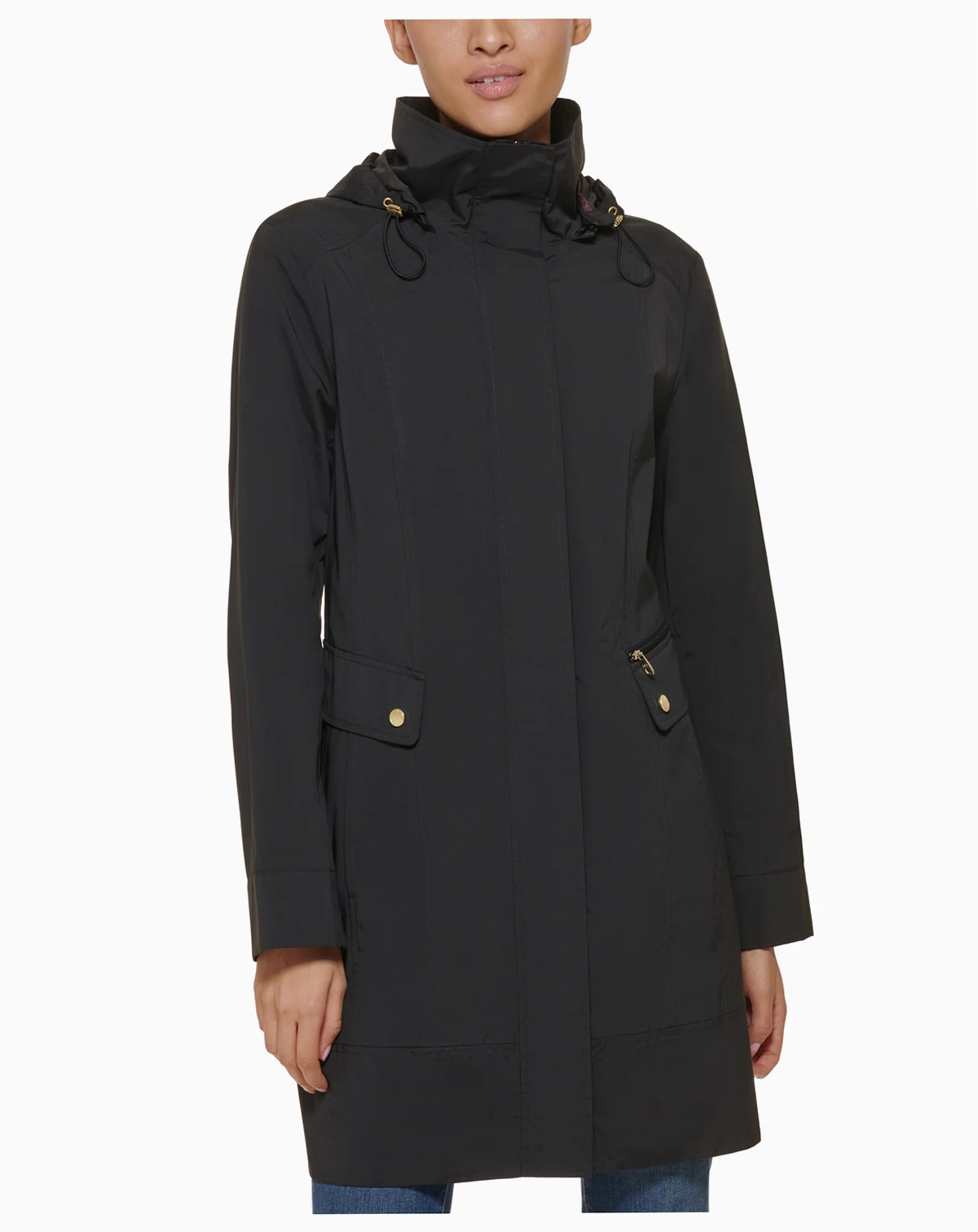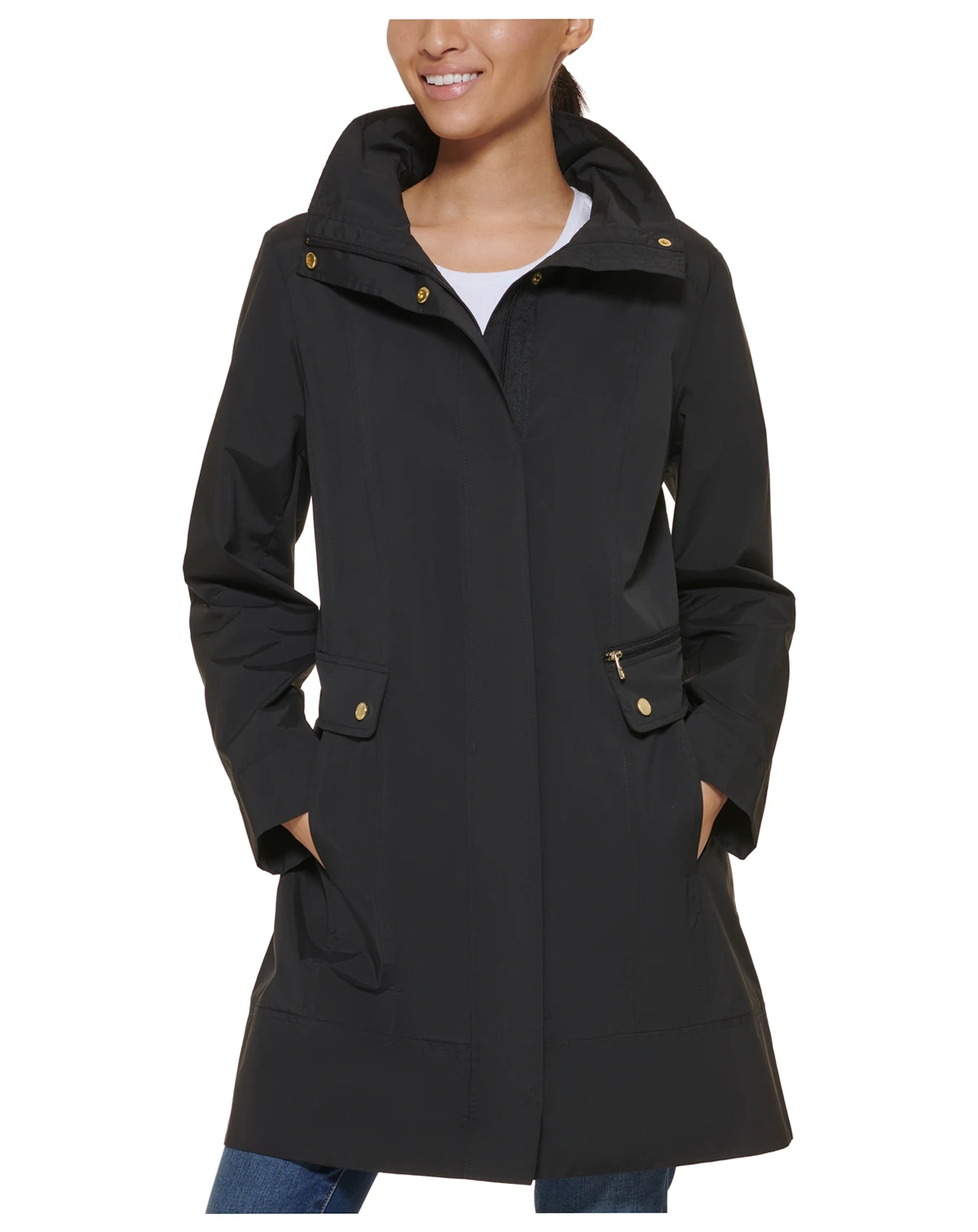 Pack it up! Cole Haan's long-length raincoat conveniently stows in the matching travel sack for weather-ready style while your on the go!
