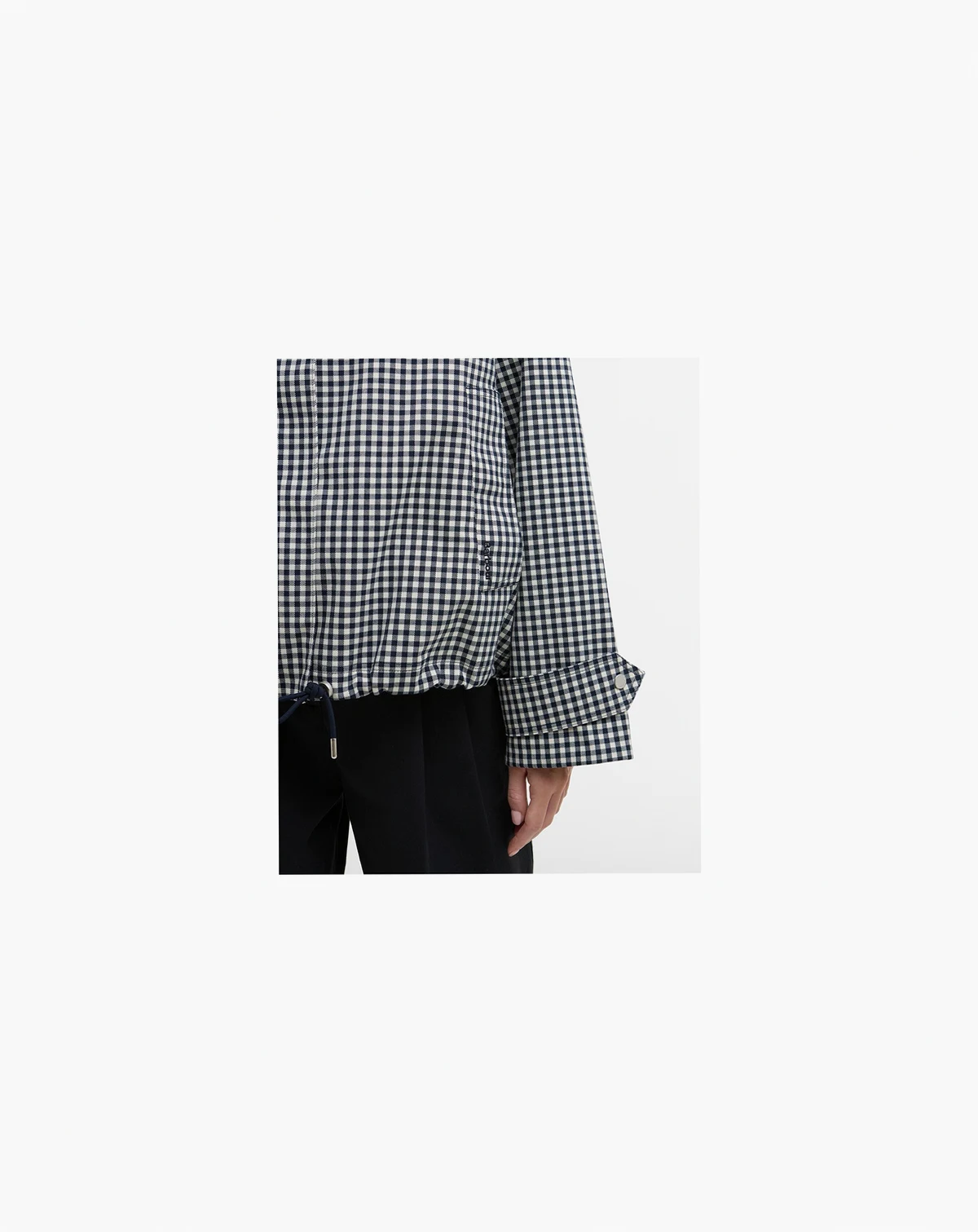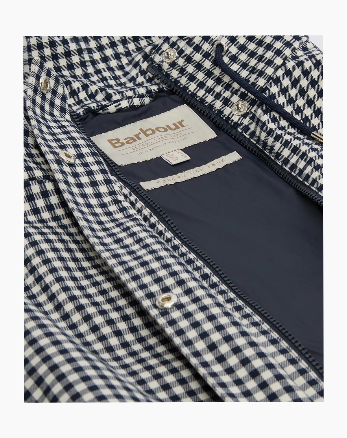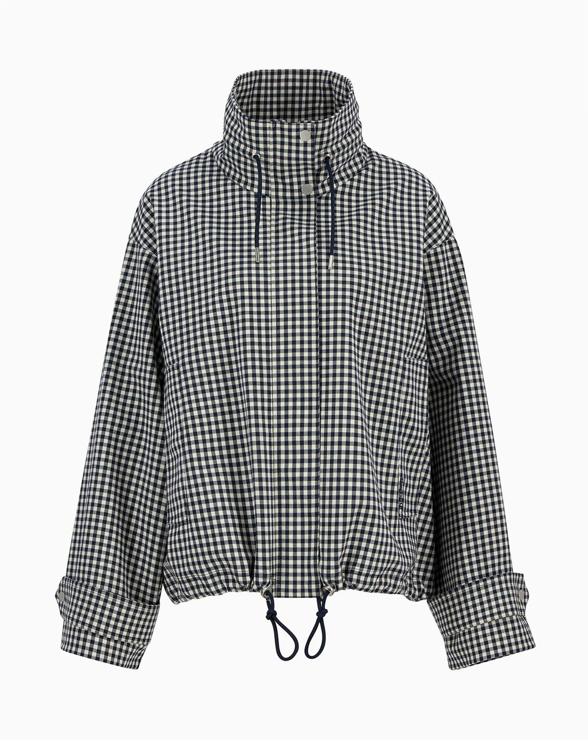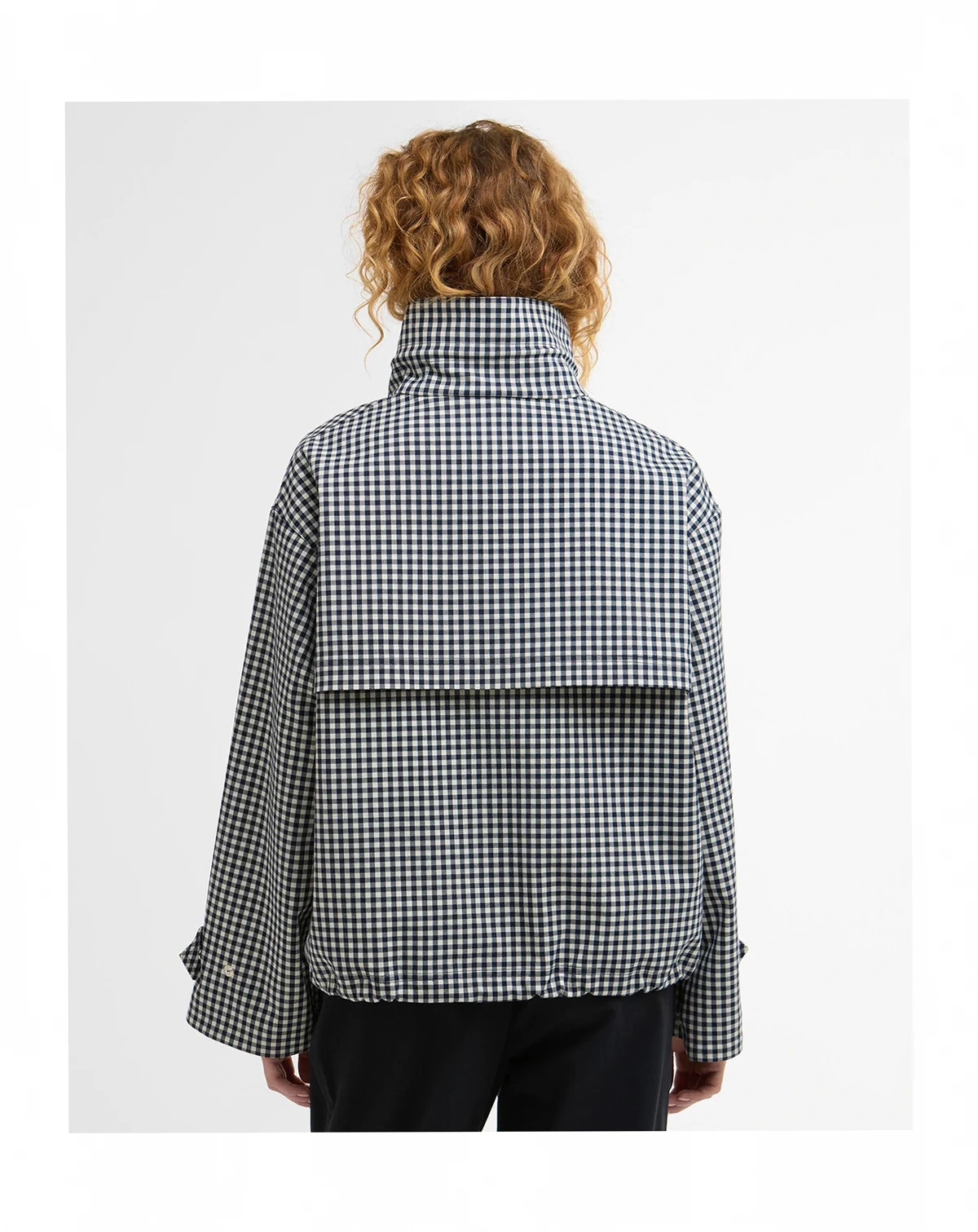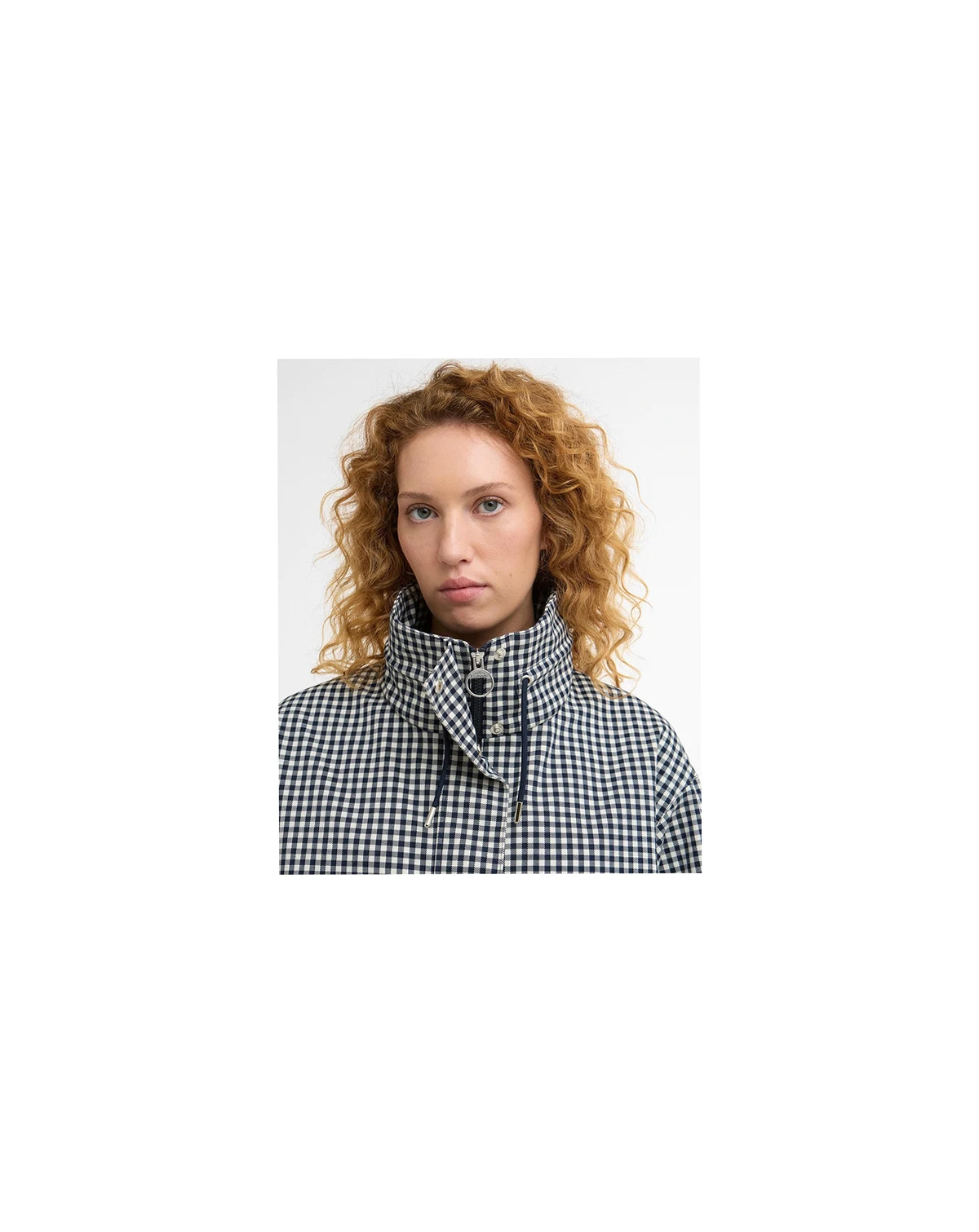 New gingham showerproof style with an oversized funnel neck with drawcord detail to neck and hem. Zip center front fastening, behind studded placket and welt pockets to front.
