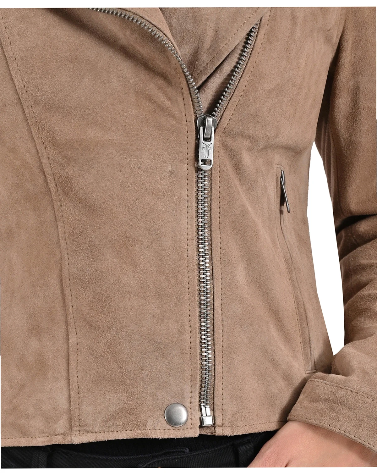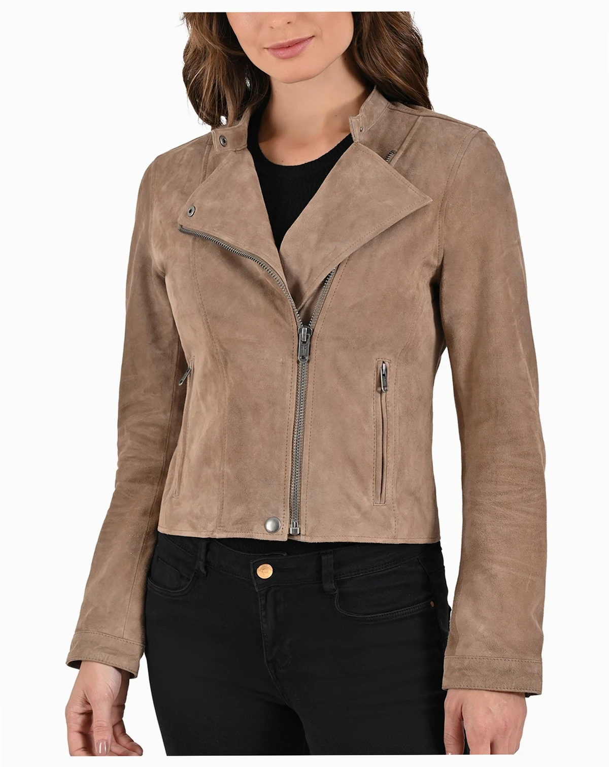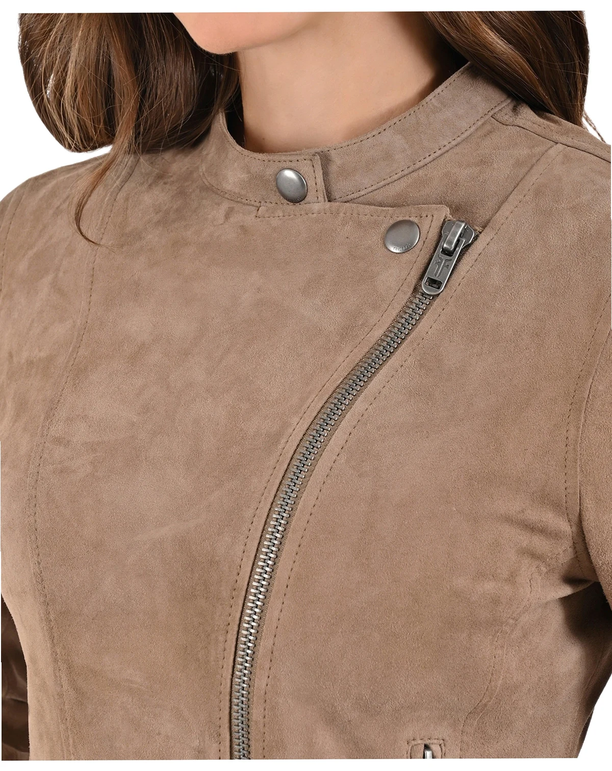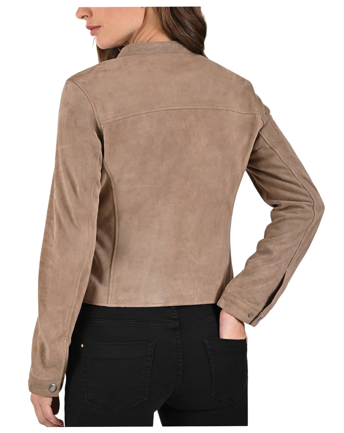 Crafted from goatskin with a suede-style finish, this casual stand collar jacket enhances its classic style with custom snaps and handles. Zippered rest pockets add practicality, while the stretch lining offers comfort and a perfect fit. The brand s plaque stands out on the back.