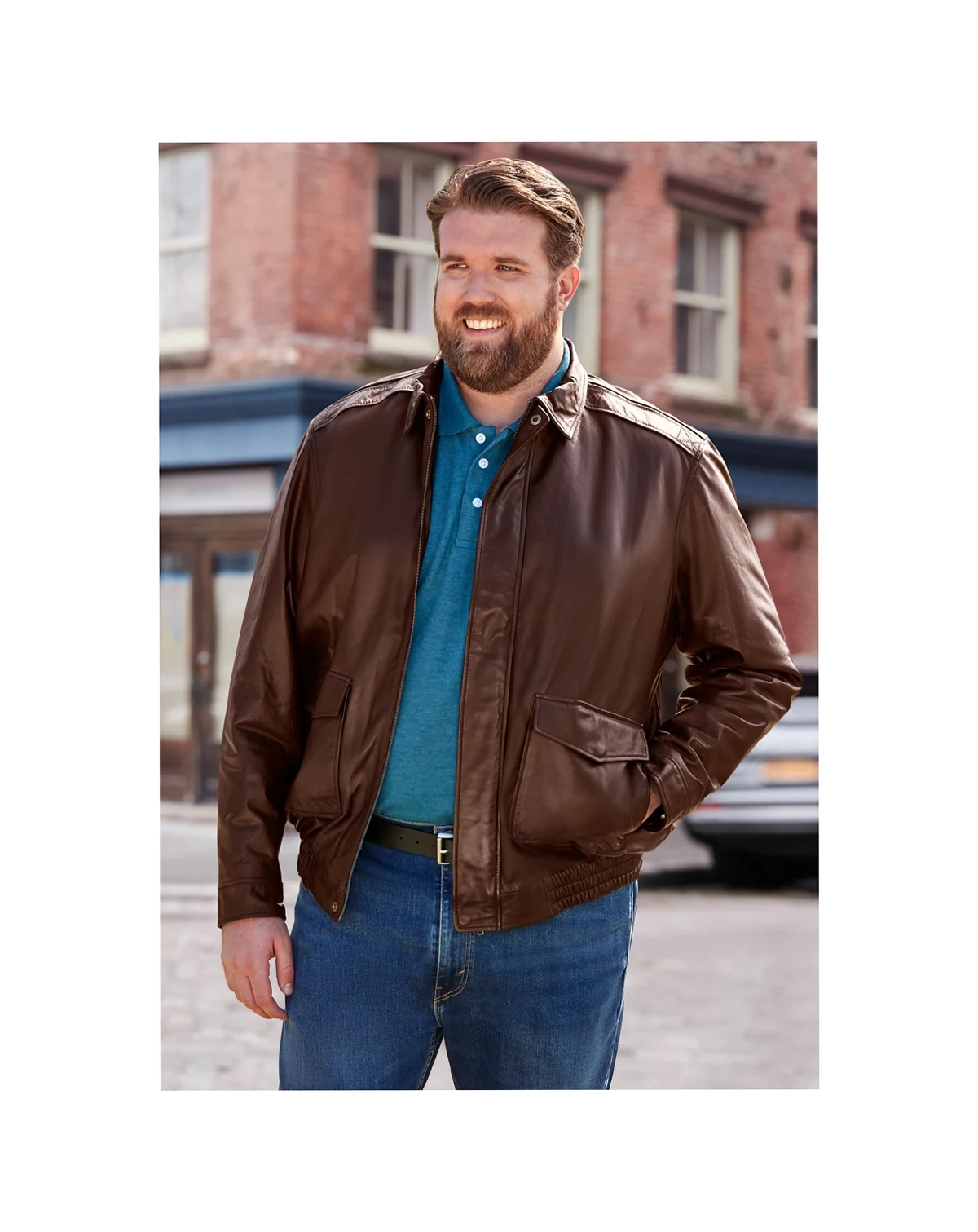 Our modern take on a vintage design. The zip front bomber was designed with a storm flap with snap buttons to keep cold drafts out. The adjustable snap cuffs and elastic band at the waist allow you to get a personal fit. Plus, the lower flap front pockets with the dual side entry pockets lets you enjoy the day (and night) hands-free. Zip-front with snap storm flap. Adjustable snap cuff. Elastic at waist. Lower flap front pockets with dual side entry pockets100% leather polyester lining. Professional leather clean. Imported