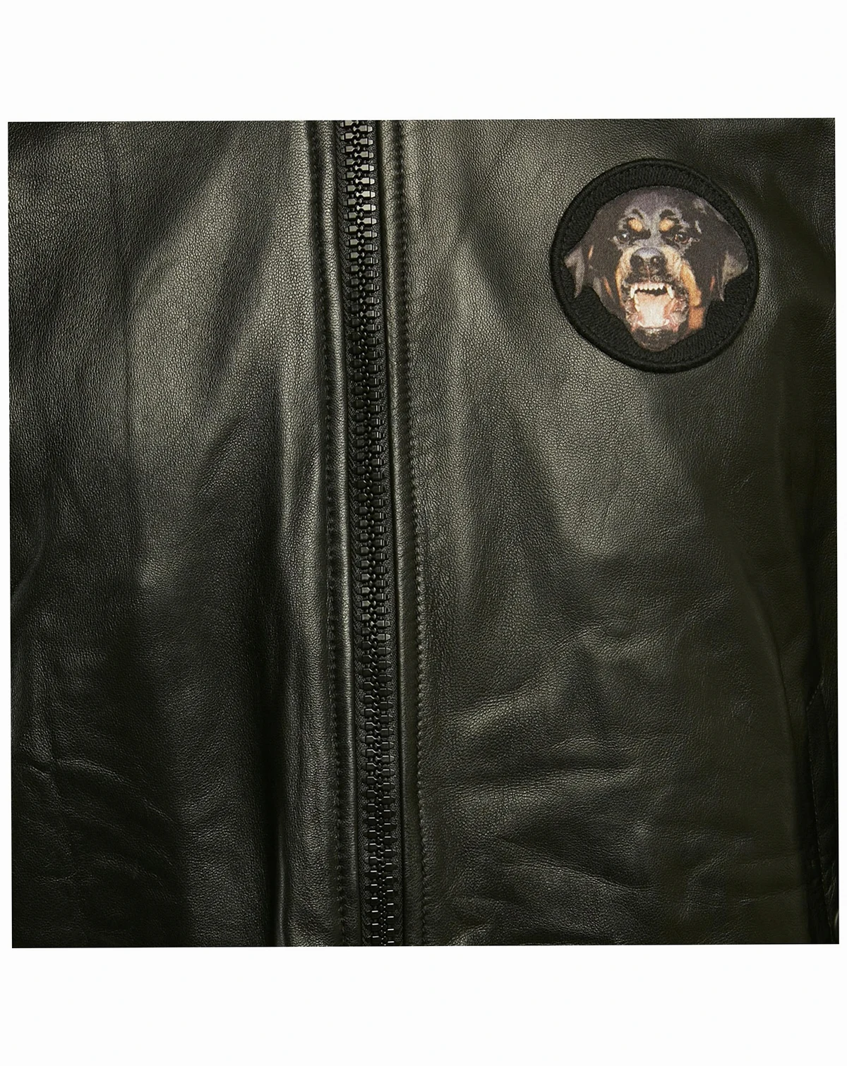 Crafted in black leather and finished with Givenchy s iconic Rottweiler patch this bomber has a strong street rooted presence that still feels considered. Easy to throw on with denim or boots and very much a statement layer.