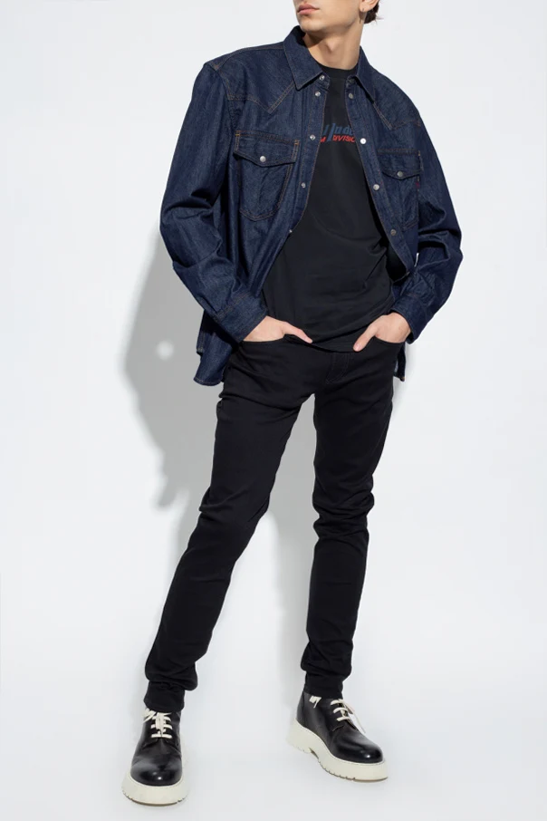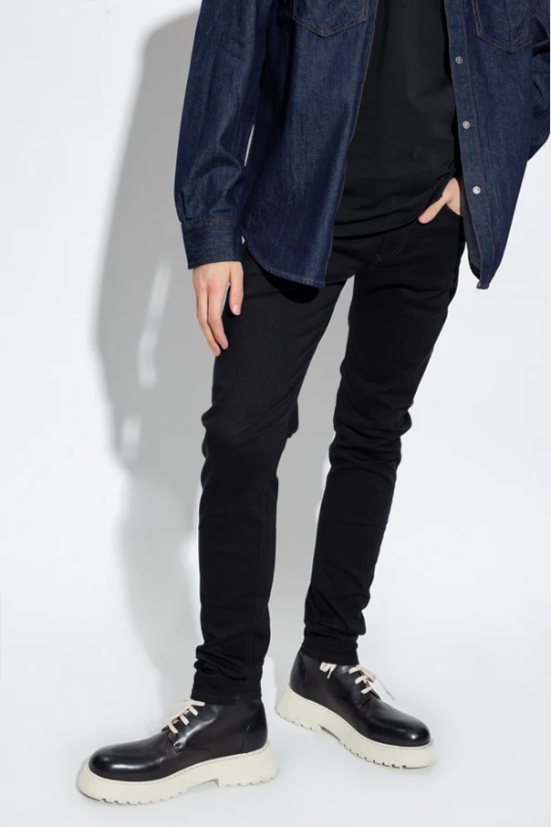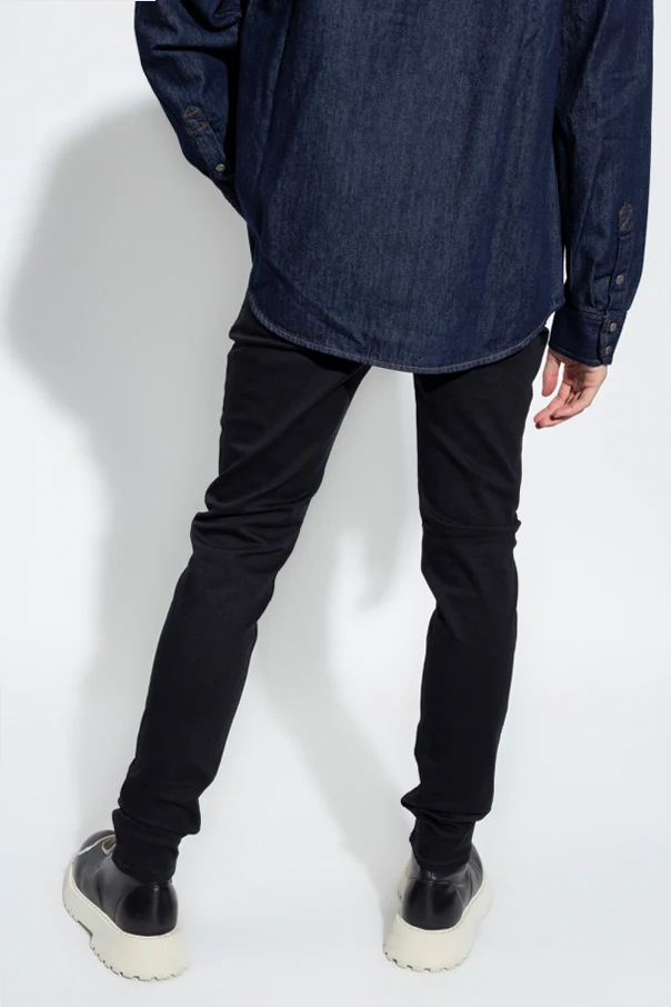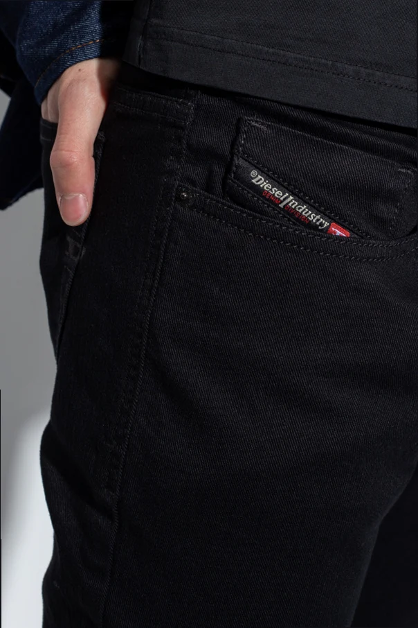 Black ‘1979 Sleenker’ skinny jeans from Diesel. Crafted from a stretch cotton blend, this pair features a zip fy with a button, classic five pockets, a logo patch on the front and black monogram embroidery on the back.