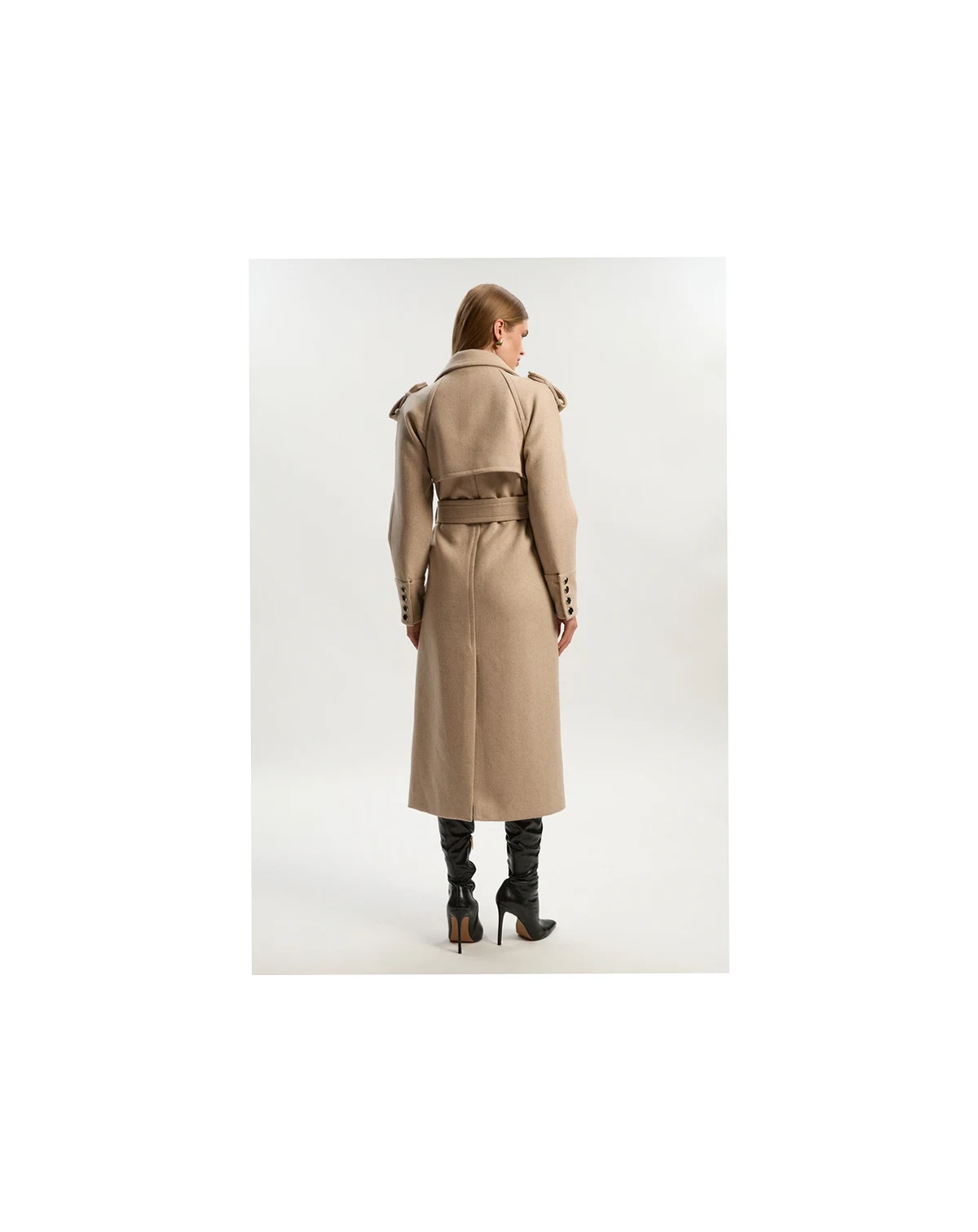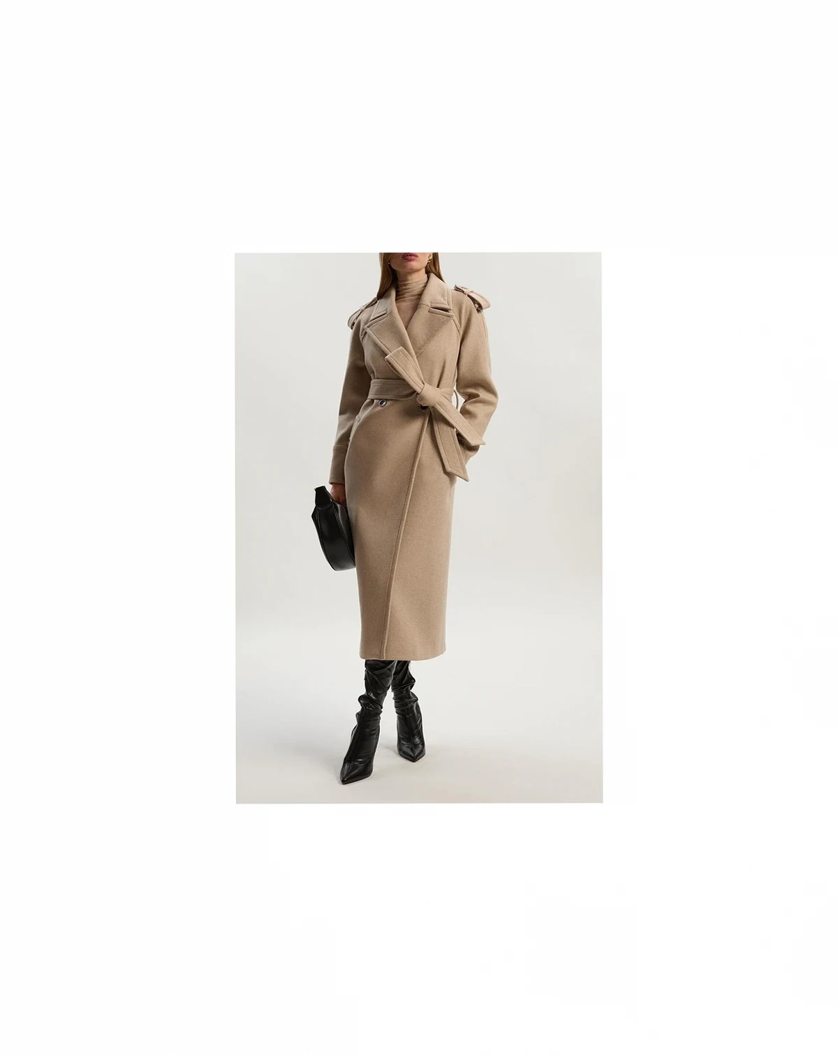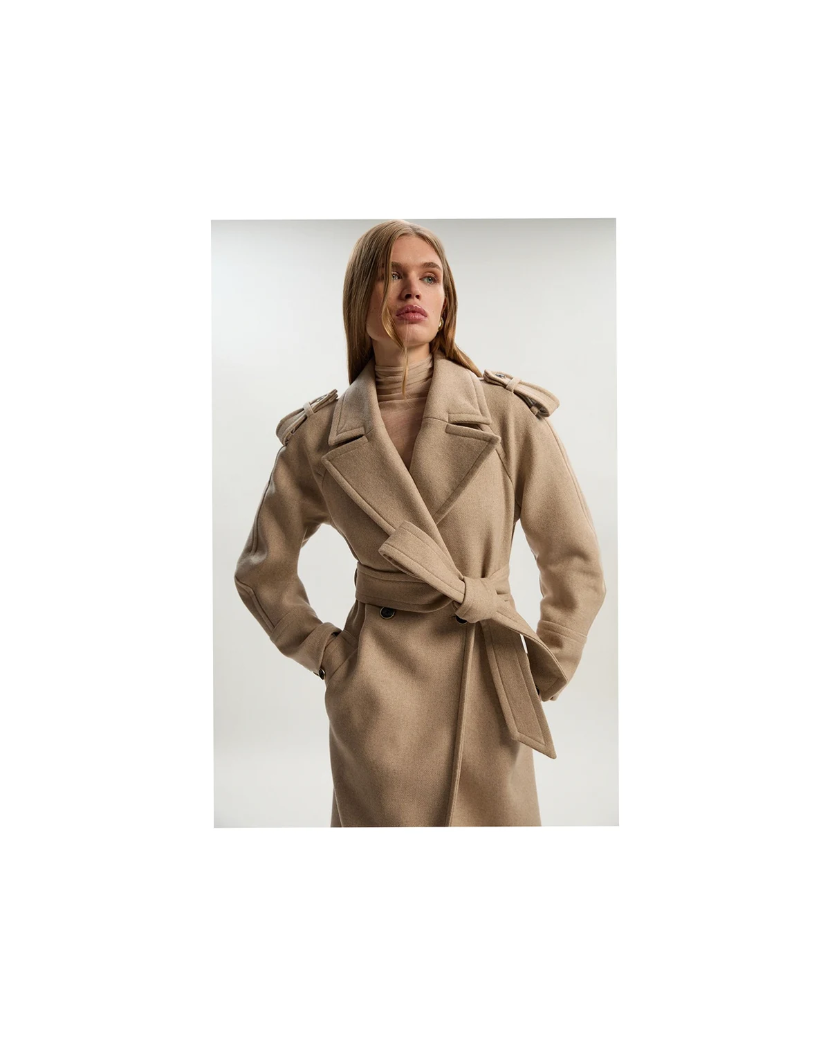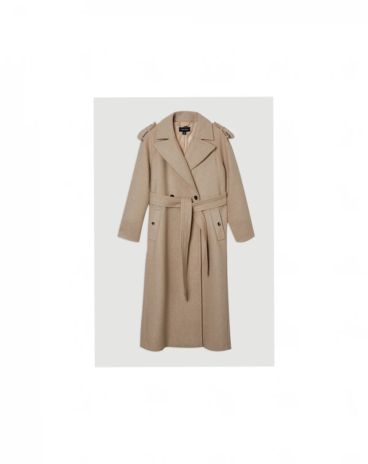 This Karen Millen wool blend coat embodies refined daywear with its sophisticated tailored silhouette and practical belted waist. The classic collared design creates a polished look that transitions effortlessly from work to weekend. Style with wide-leg trousers and a simple top for an elegant daytime ensemble, or layer over a fine knit jumper with straight-leg jeans and ankle boots for casual family gatherings.