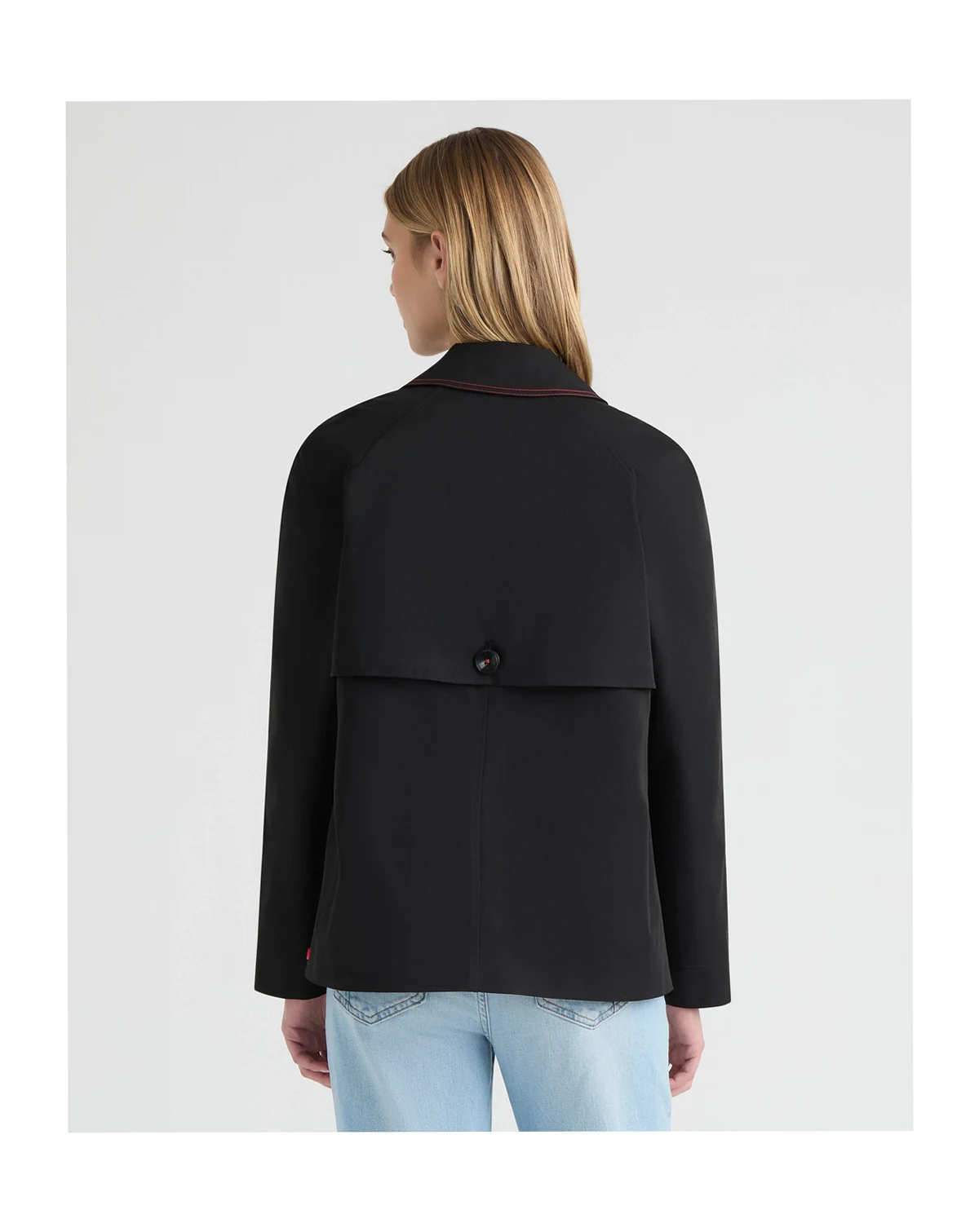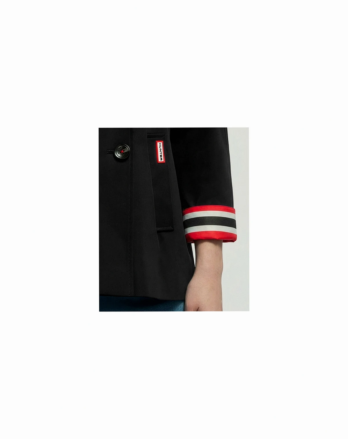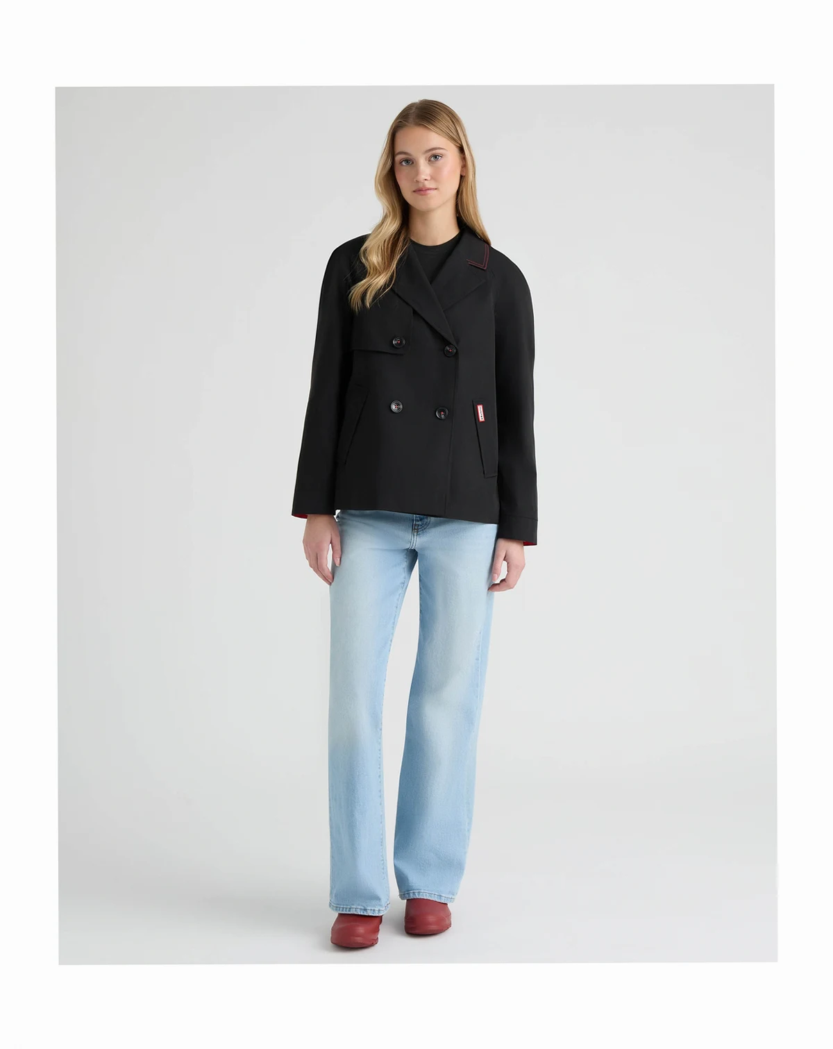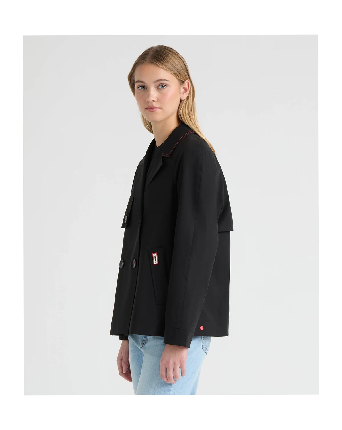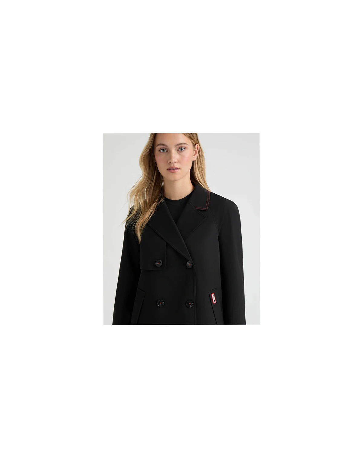 The Hunter Women's Tina Short Trench Coat offers a chic, tailored take on classic outerwear. Its double-breasted button closure and notch collar create a structured silhouette, while side welt pockets and a back storm shield add thoughtful detail. Accented with signature tri-colour cuffs and lining plus contrast stitching at the collar, it's a stylish, contemporary trench for everyday wear.