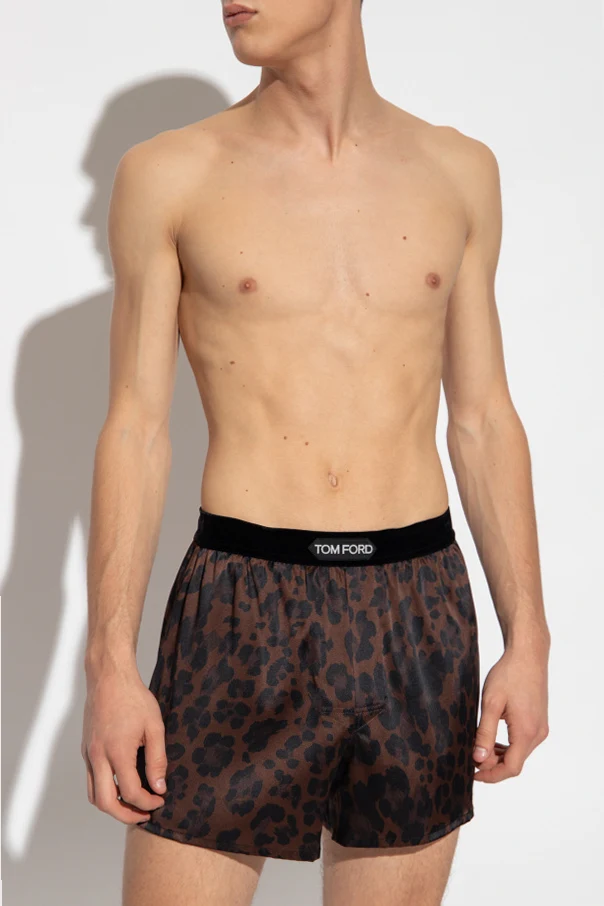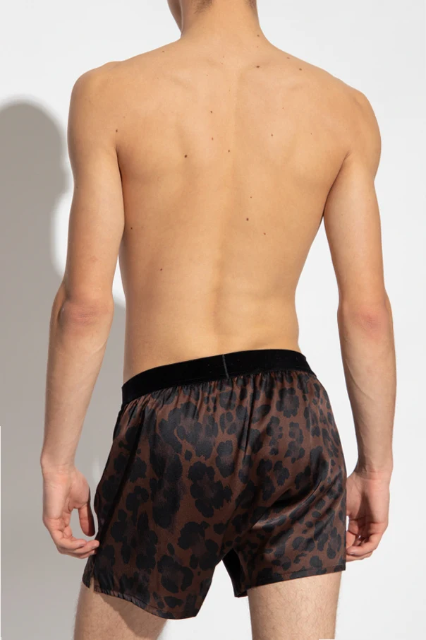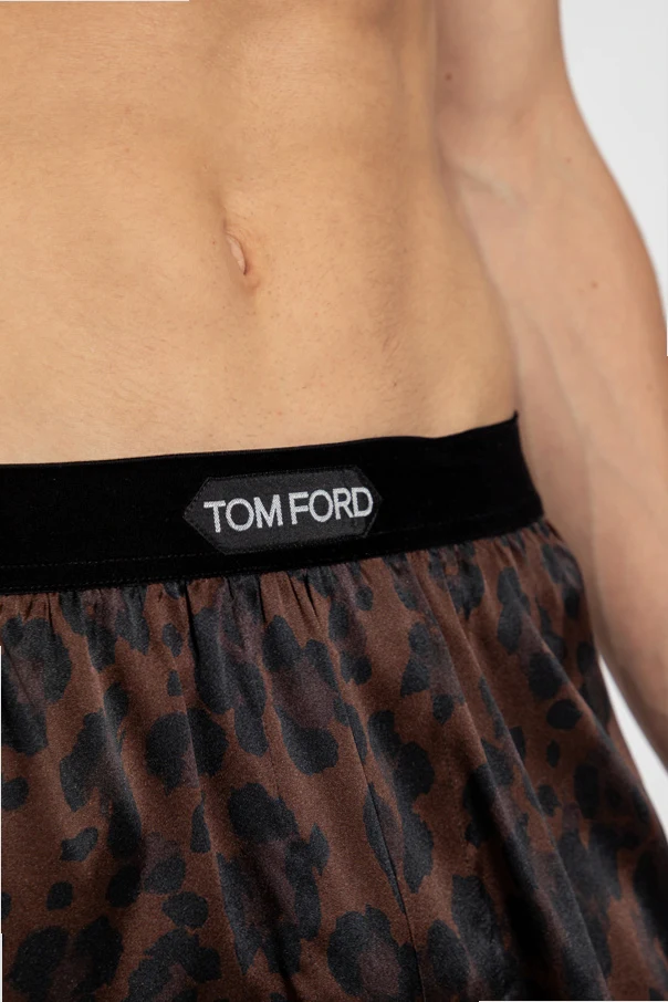 Dark brown and black boxers from Tom Ford. Made of silk, this pair showcases an animal motif, a logo patch on the front as well as a black waistband with a velvet trim.