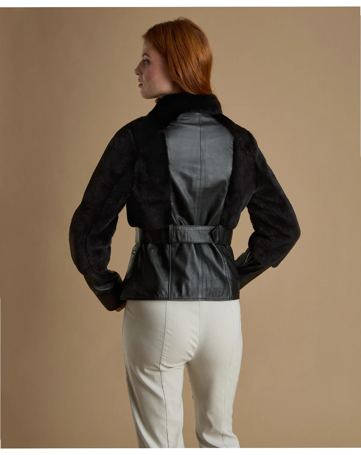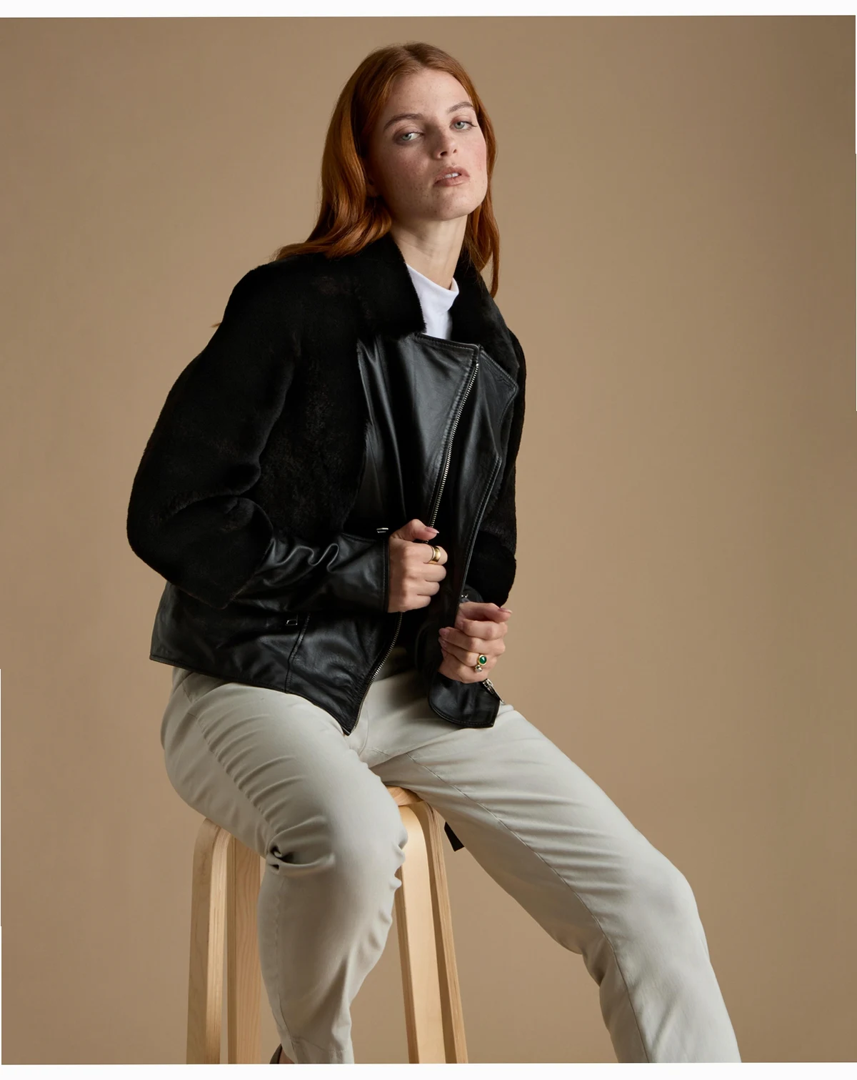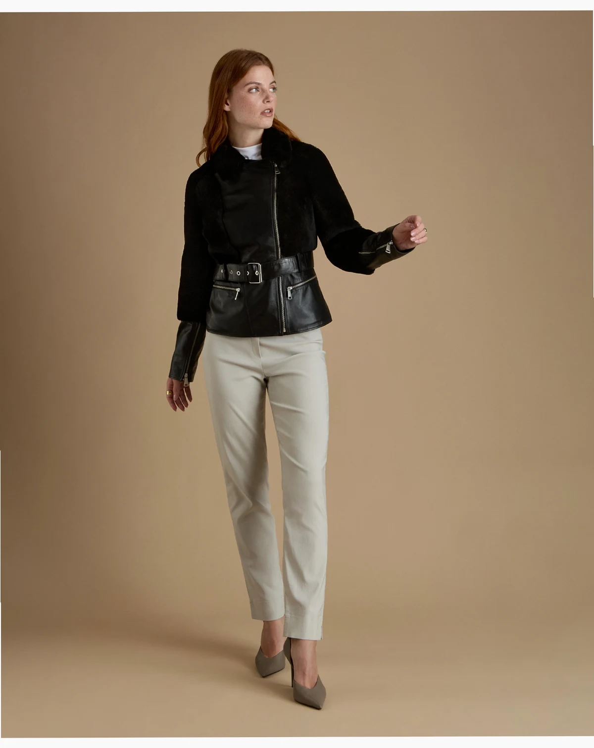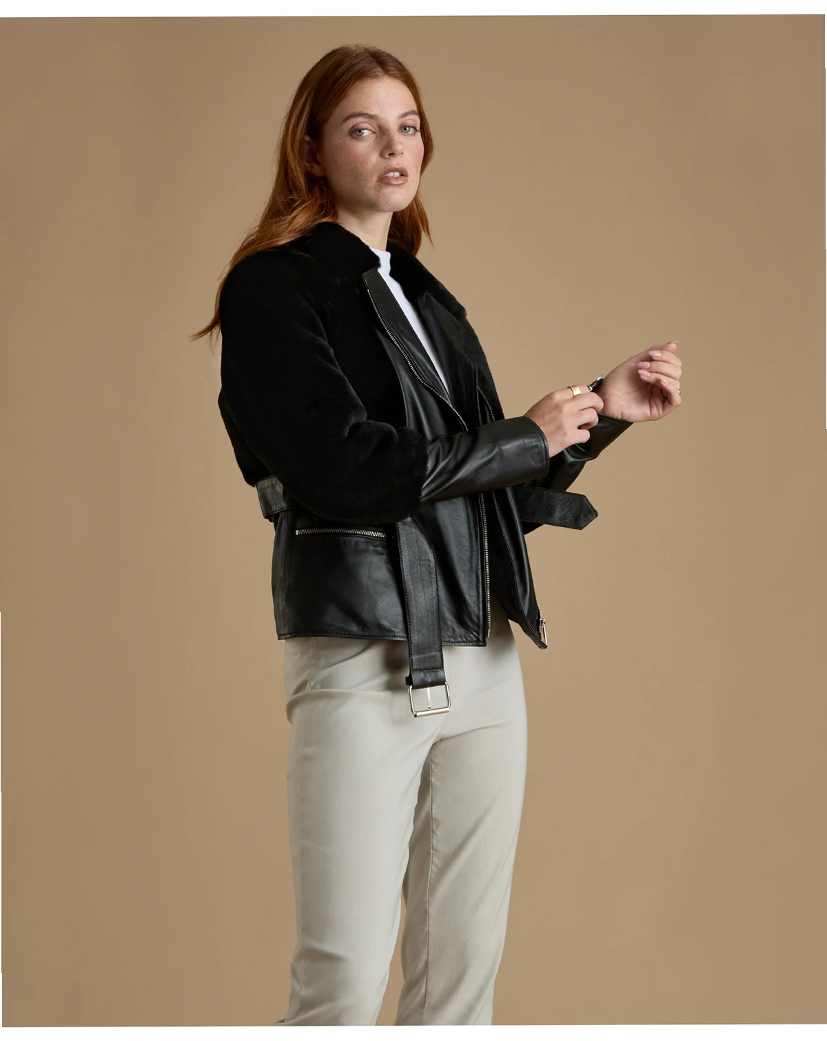 A bold take on a timeless classic. Handcrafted from supple leather with soft shearling accents, this belted biker jacket combines luxury and edge. The waist belt and asymmetric zip create a flattering, structured silhouette, while silver hardware adds a sleek finish. Perfect for elevating everyday looks with effortless style.