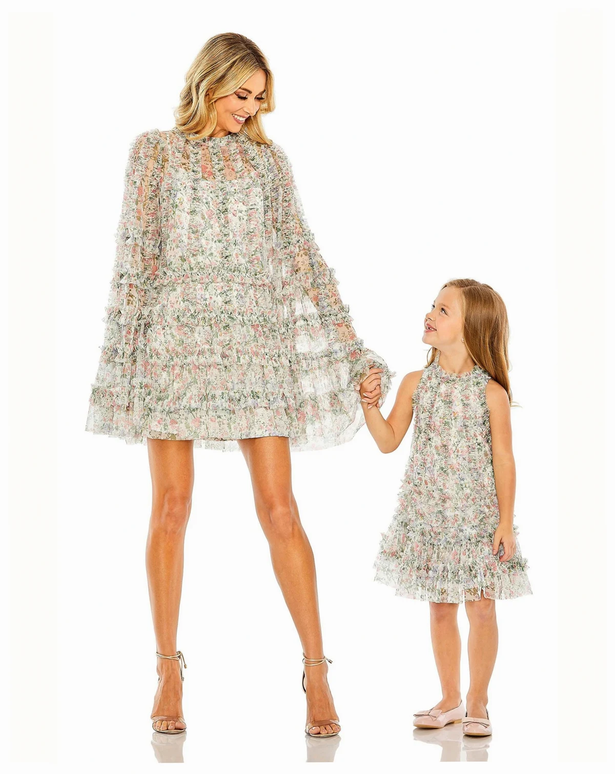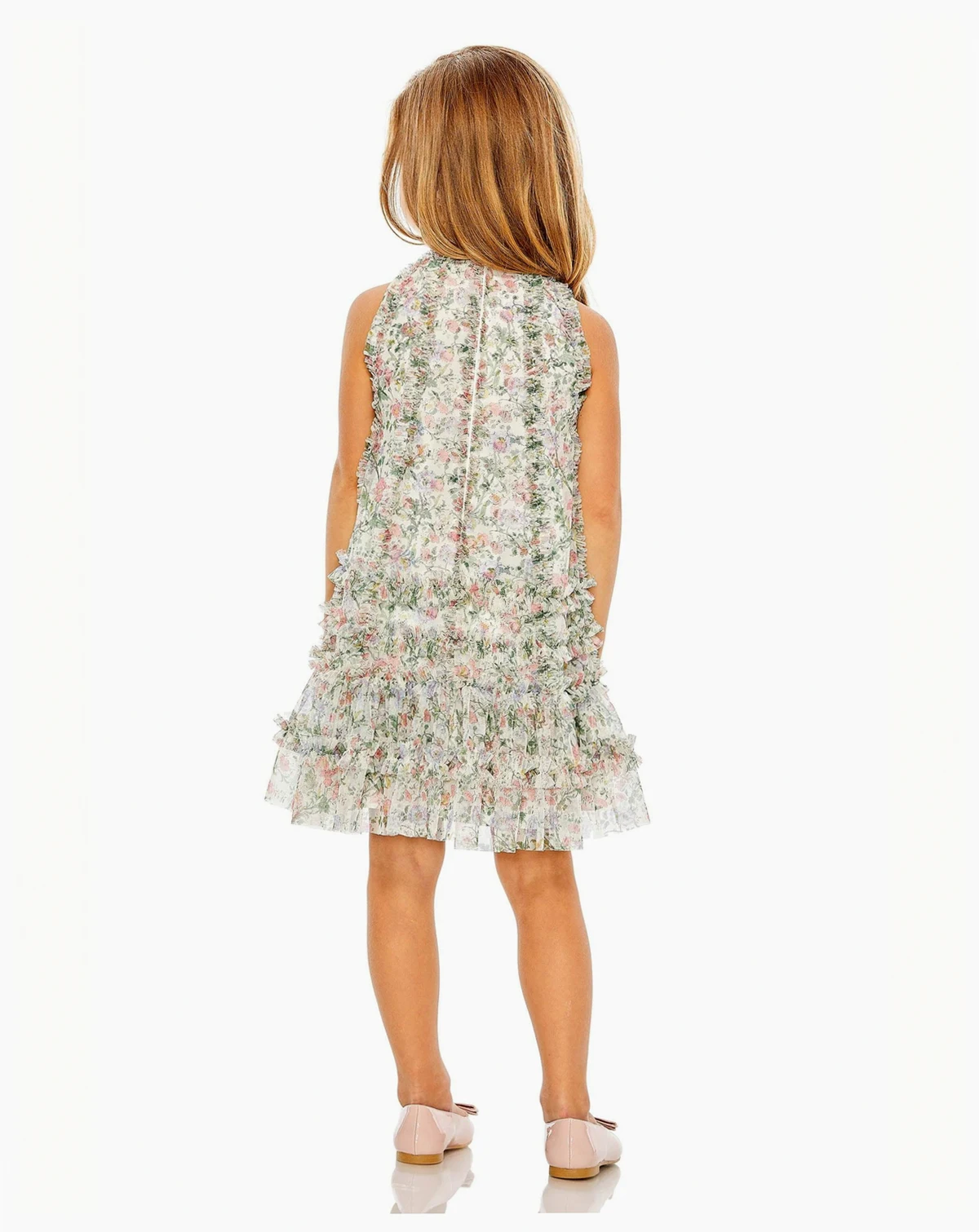 Mac Duggal Girls Floral printed mesh overlay 100% polyester lining Fully-lined High neckline Sleeveless Allover ruffled crisscross frill detailing Concealed back zipper Approx. 24" from top of shoulder to bottom hem Available in Floral Multi Style #8059 pairs with Style #8007