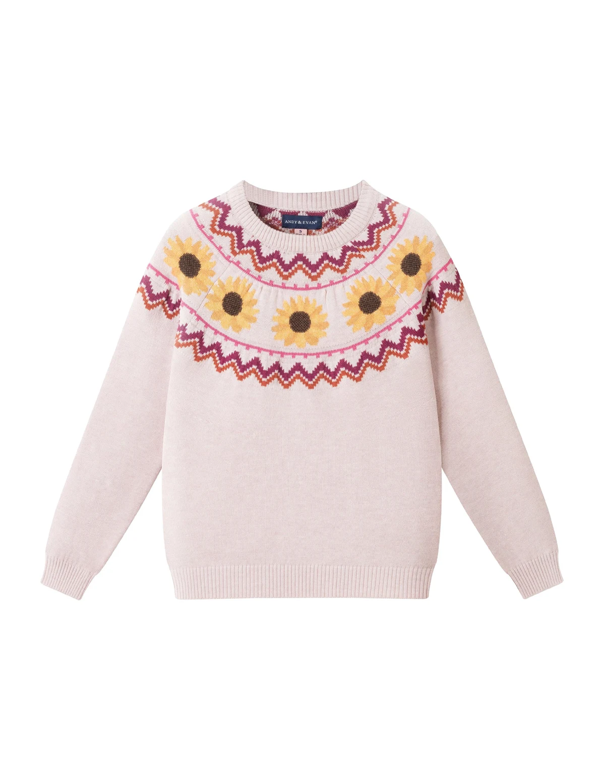Warm tones and sunny details make this outfit a feel-good favorite. The blush sweater features a cheerful sunflower fair isle motif across the yoke, bringing seasonal charm with a playful twist. Paired with rust-colored ribbed flare pants, the set delivers cozy comfort with a touch of retro flair. Perfect for cooler days, classroom style, or fall family outings, this duo is designed to brighten up any wardrobe.