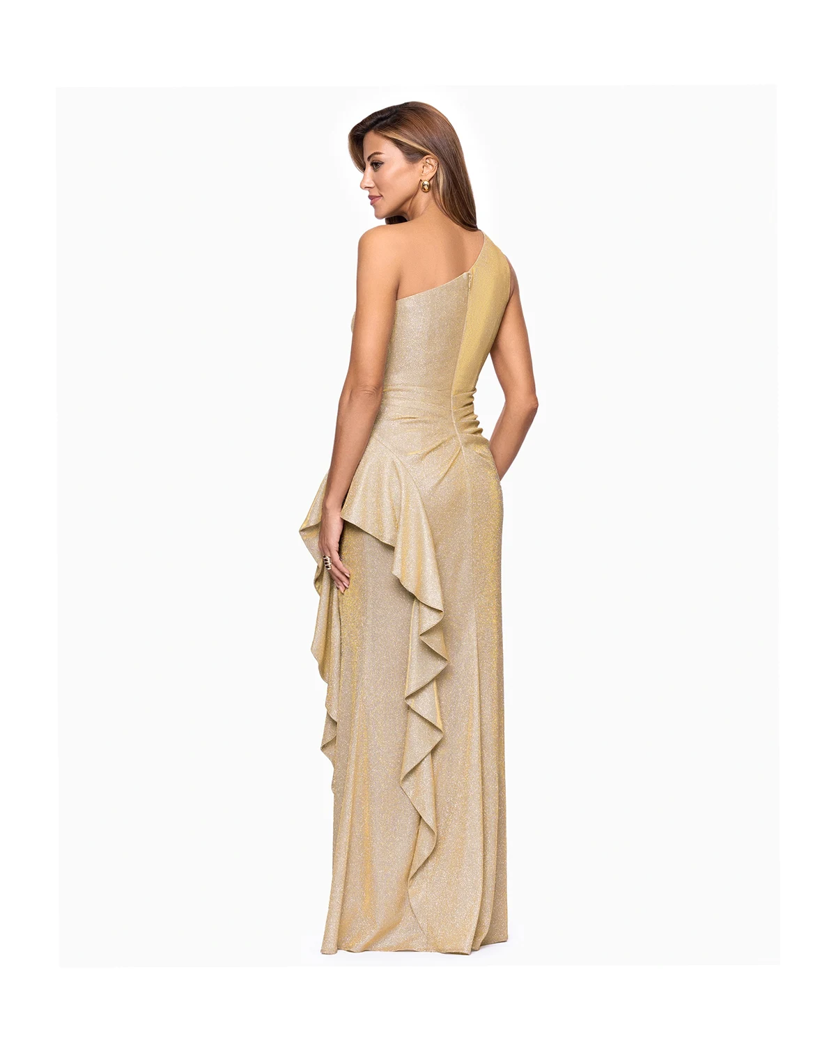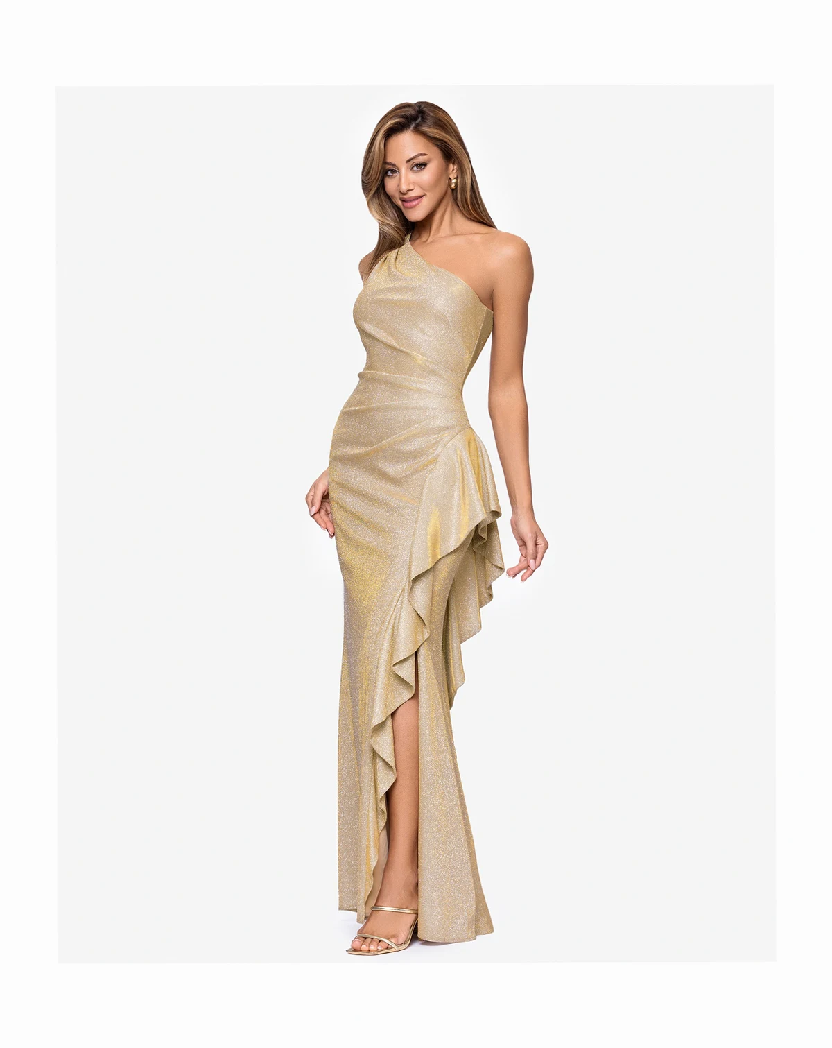 Make a stunning entrance in this one-shoulder glitter dress from XSCAPE, designed for formal weddings and special events. Its elegant halter neckline and full-length silhouette create a captivating look.
