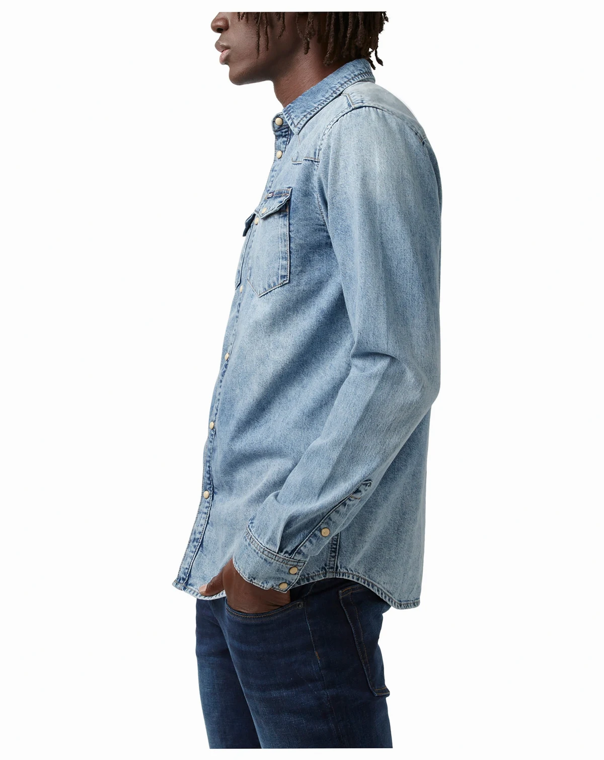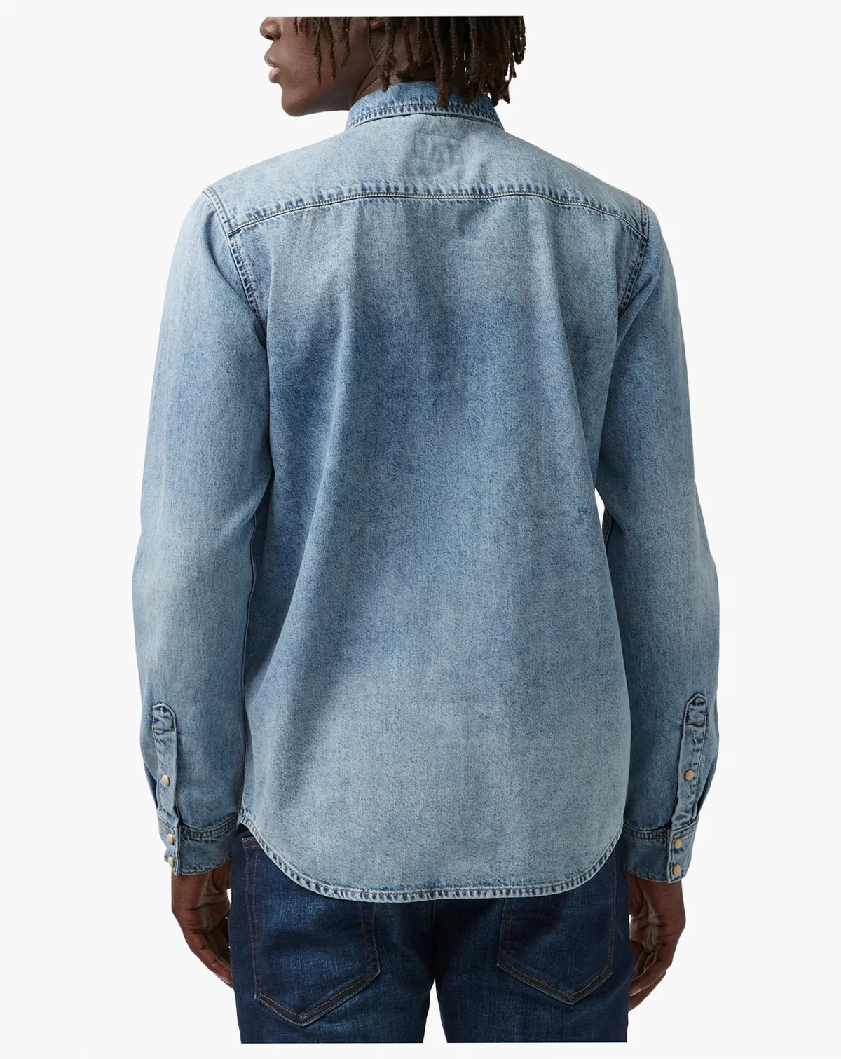 Denim shirt in a sanded wash. This classic style is the ultimate versatile must-have piece in any wardrobe. The simple design lets you pair it with virtually any outfit and it was always look put together.