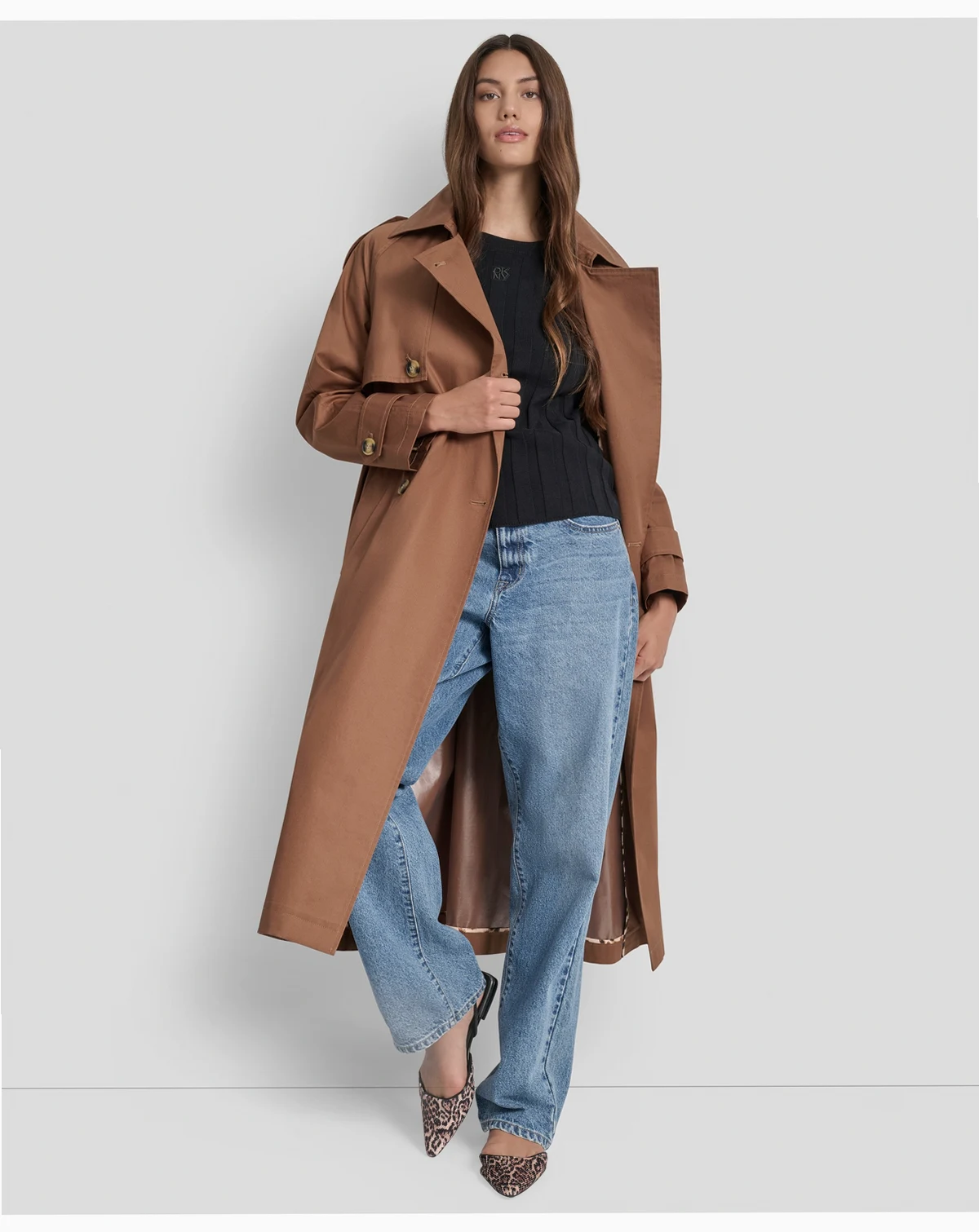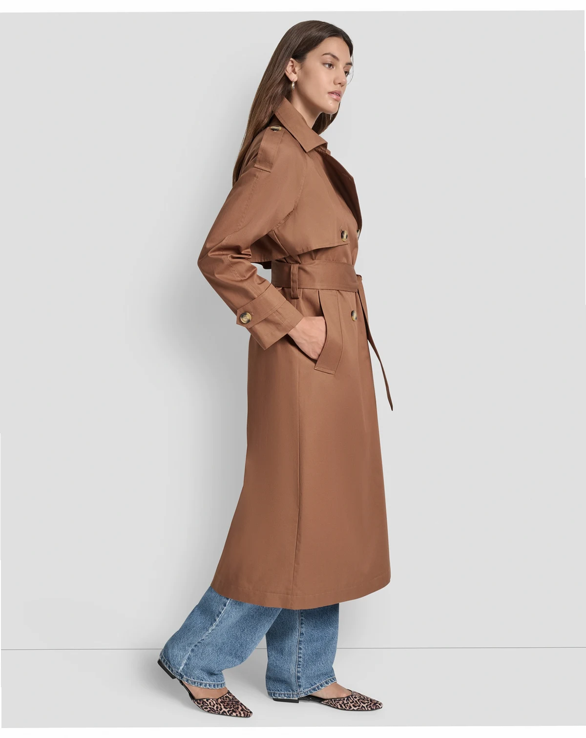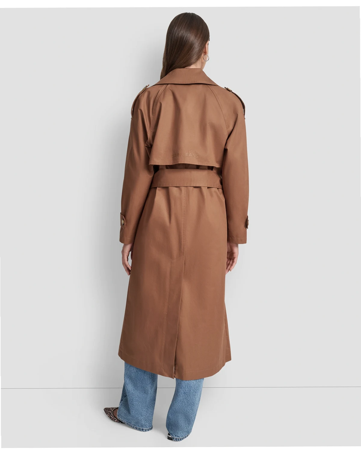 The iconic trench coat, as done by DKNY Jeans. This lighter cotton version features all the classic details in a midi-length silhouette.