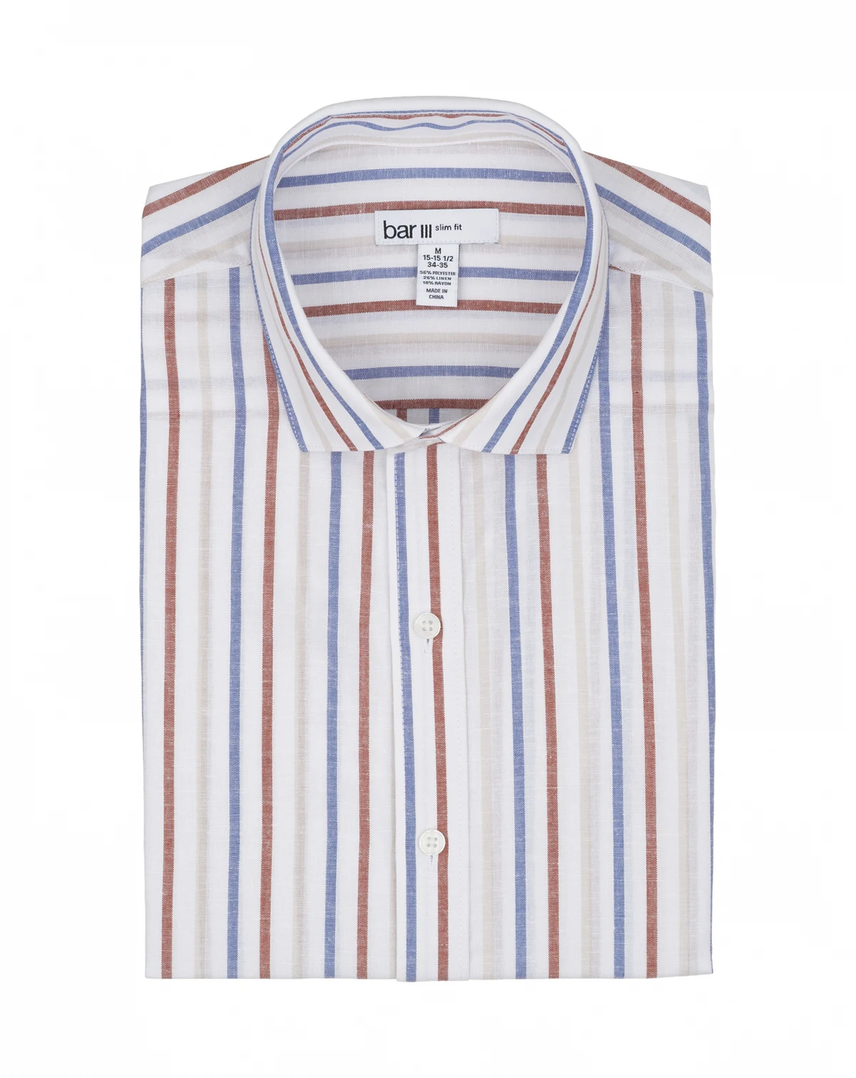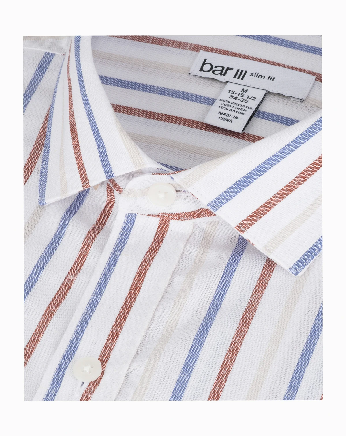 Textural stripe interest defines this Bar III Slim-Fit dress shirt crafted in a linen-blend with the Oslo stripe pattern. A spread collar and rounded cuffs pair with modern tailoring for crisp, everyday refinement.