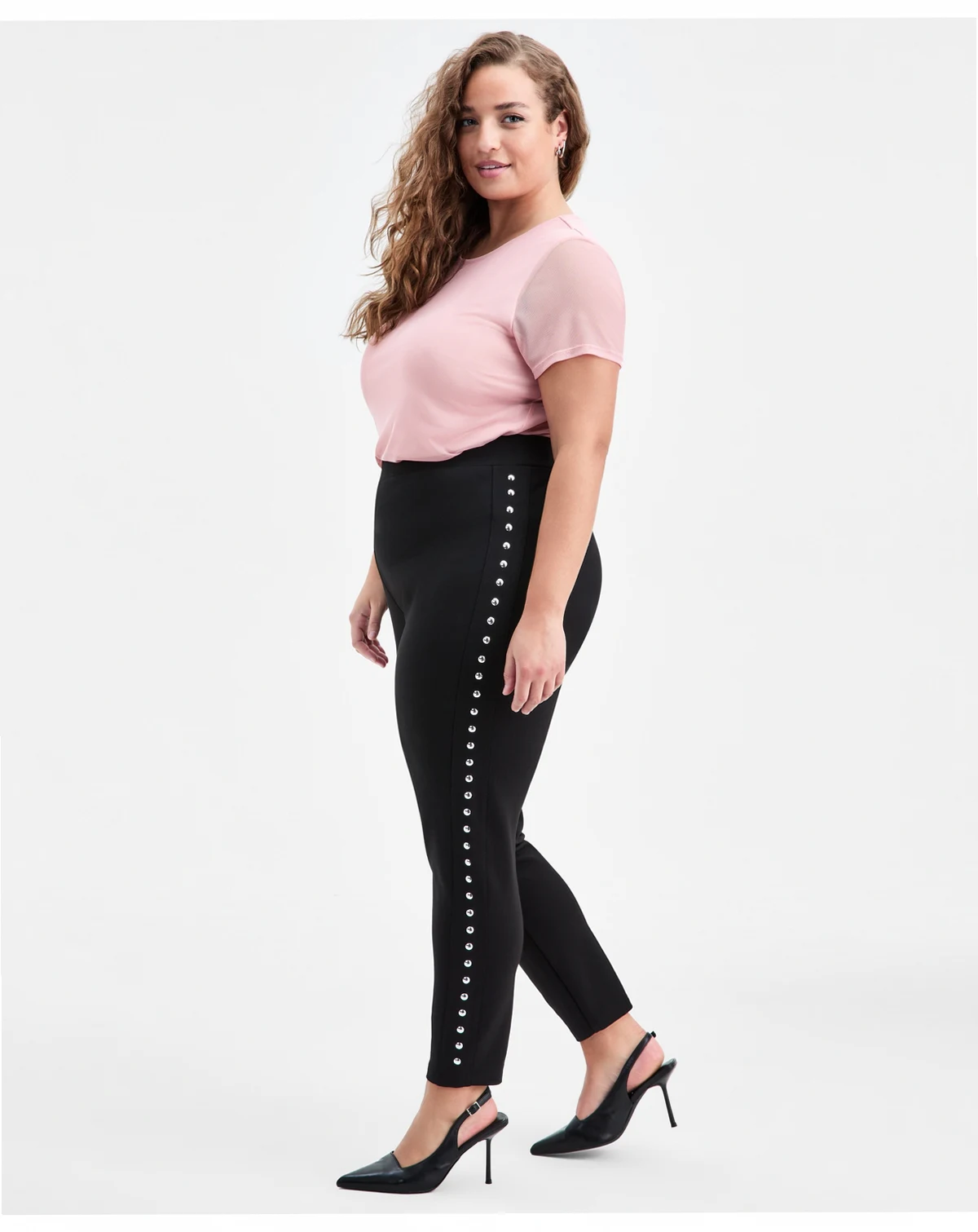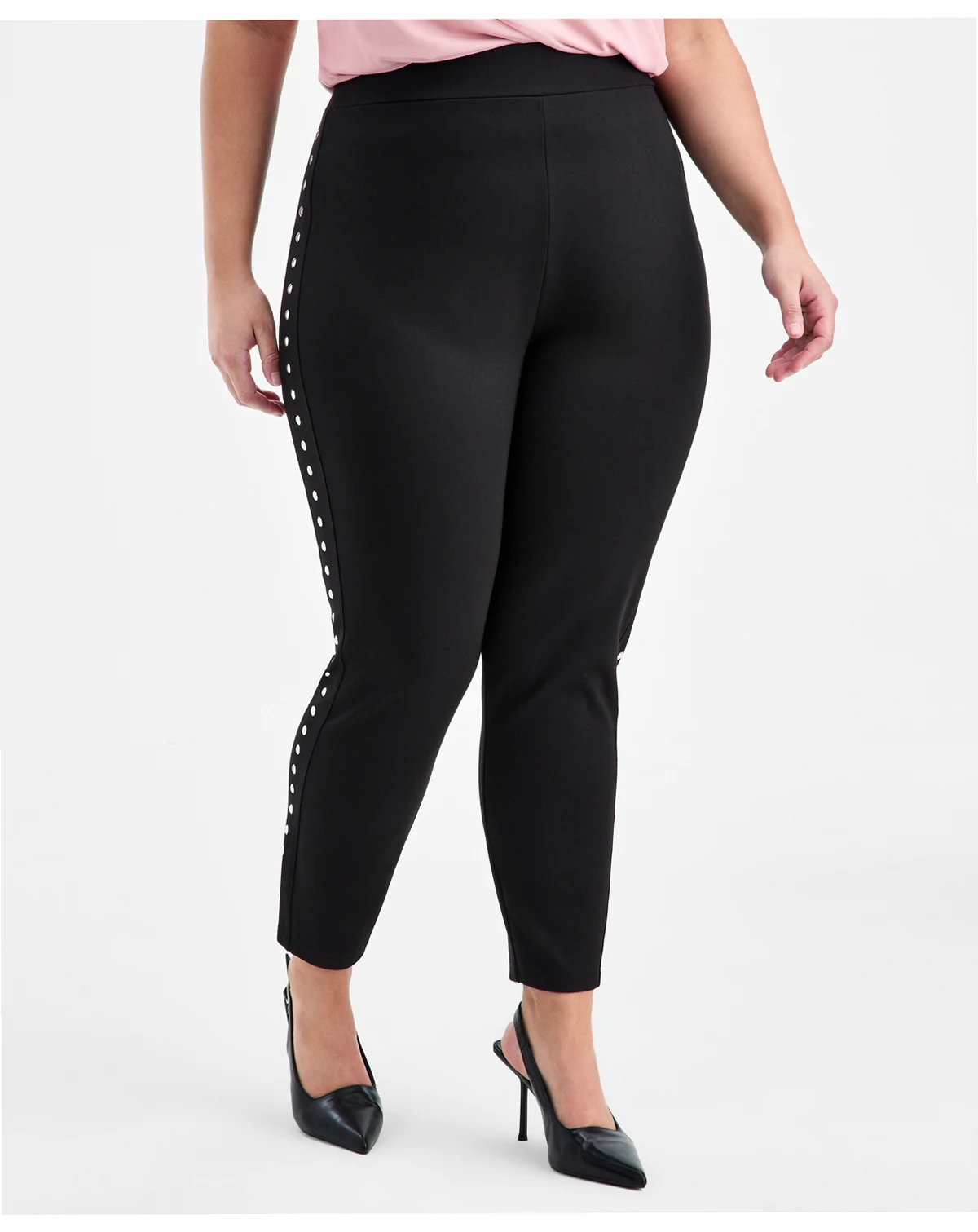 Edgy studding at the sides lends a Rockstar vibe to these body-hugging plus size leggings from Bar III.