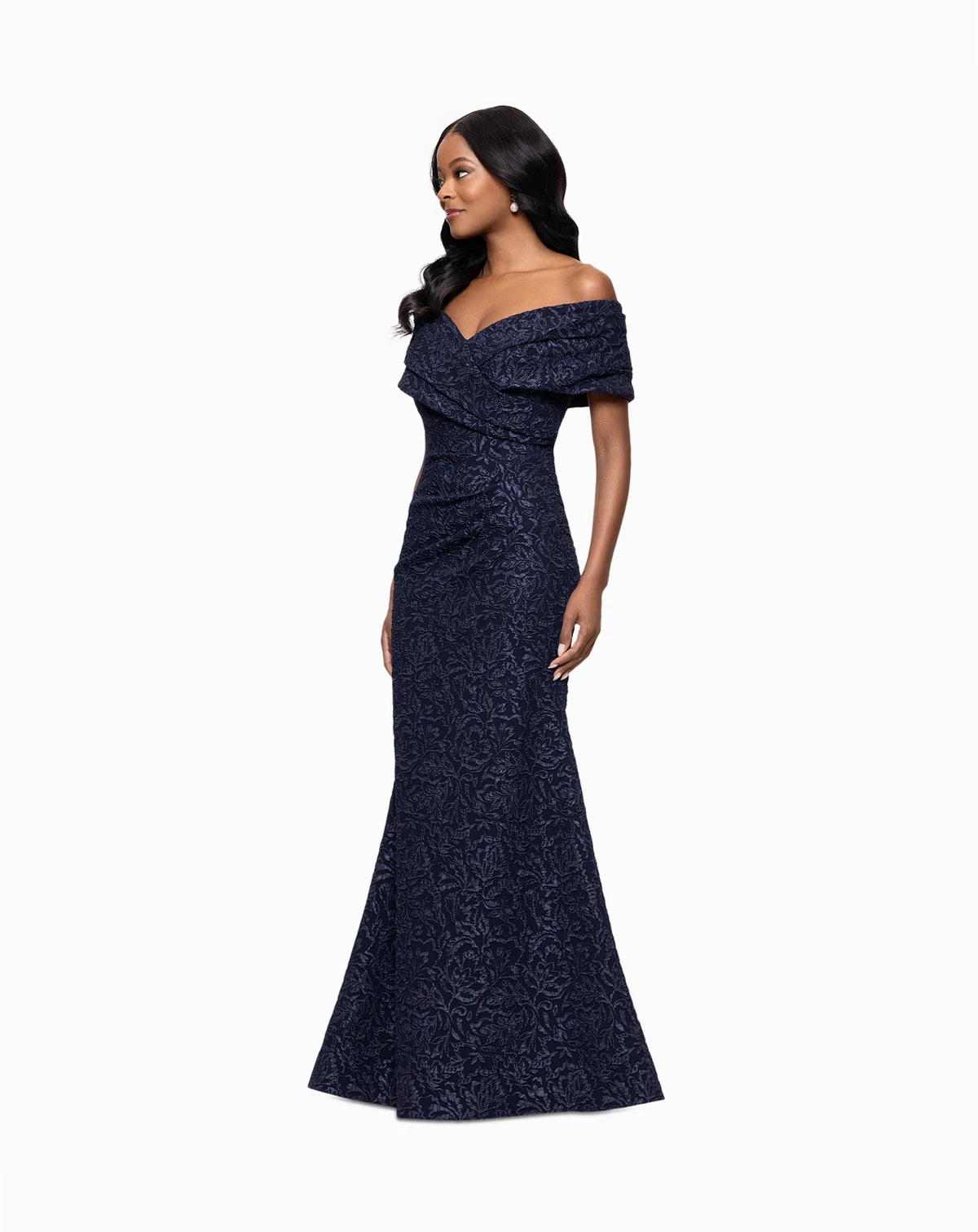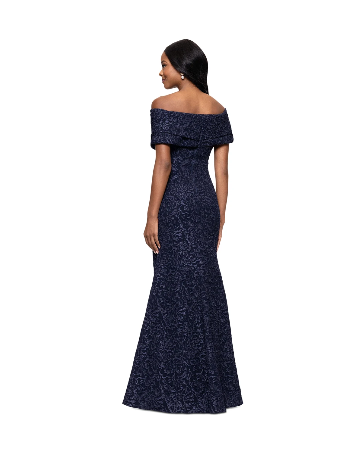 Radiate regal elegance in this women's brocade off-the-shoulder gown from Betsy & Adam, designed with rich, textured fabric and a flattering neckline for a truly opulent and unforgettable statement.