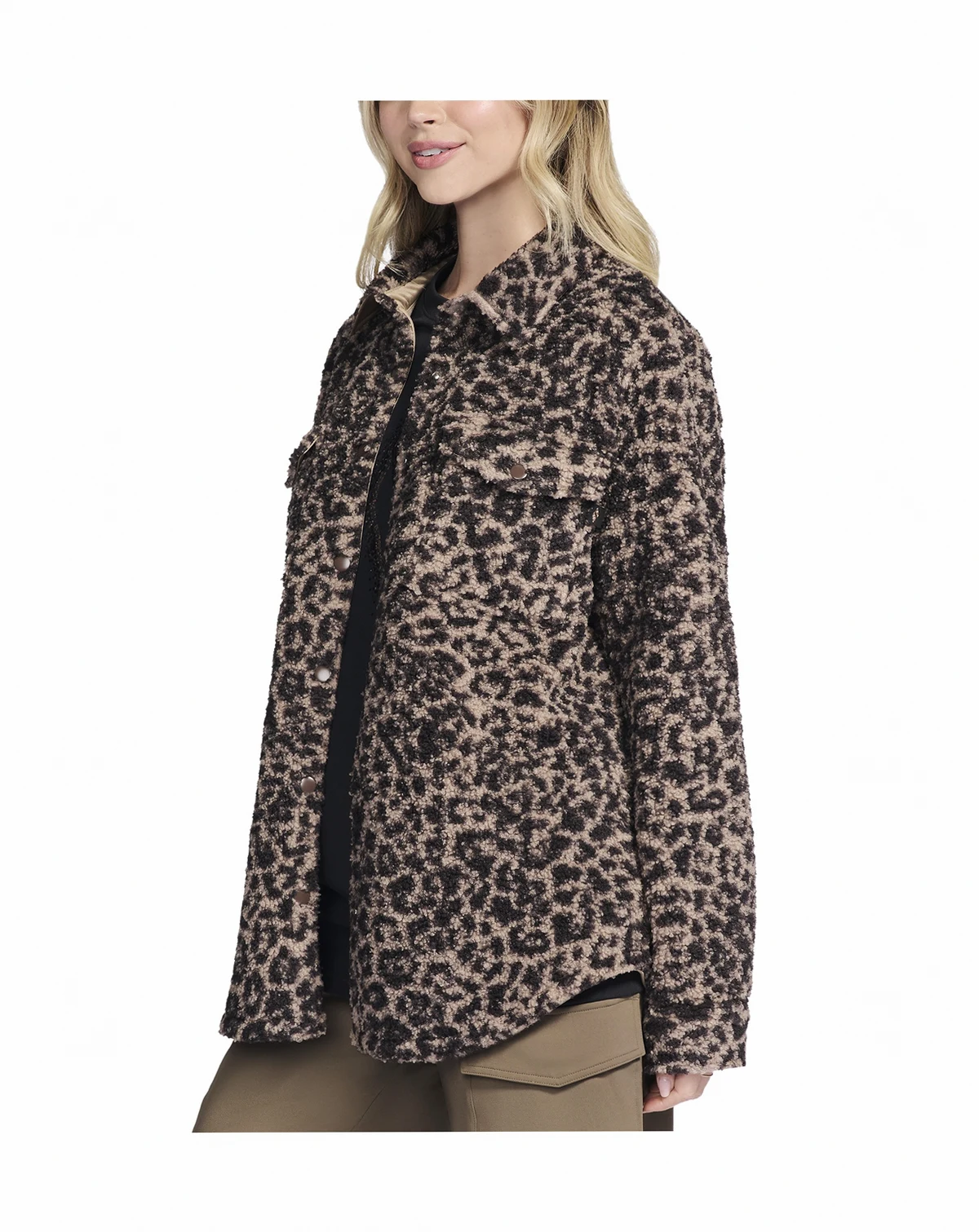 Unleash cozy confidence with this Skechers On-The-Go shacket, blending standout fashion with everyday comfort. An all-over cheetah print delivers bold, fashion-forward flair that makes a statement whether you're running errands or lounging in style. Chest flap pockets with snap closures provide secure storage for small essentials and add to the rugged, utility-inspired vibe. Double sleeve cuffs offer adjustable fit and styling versatility.