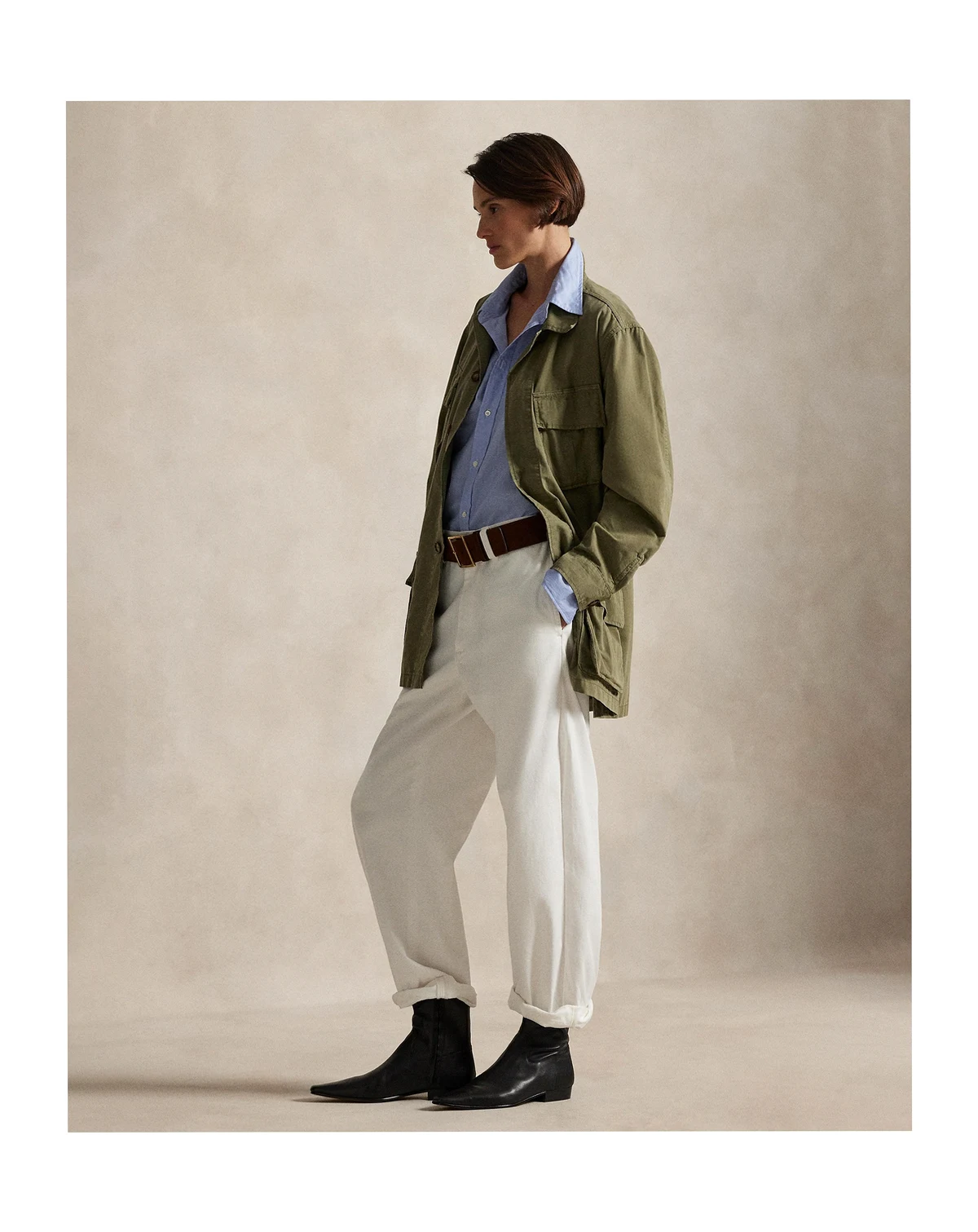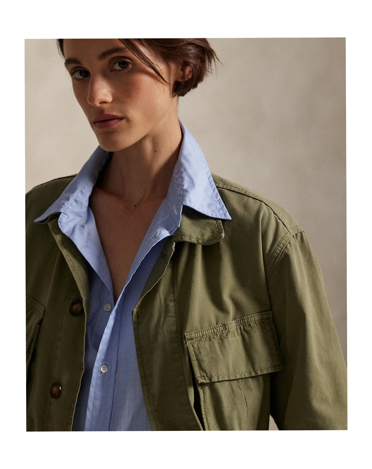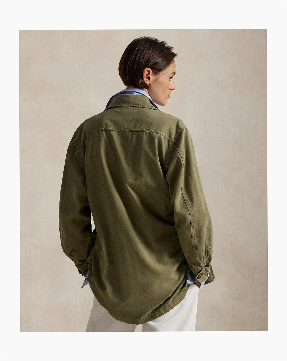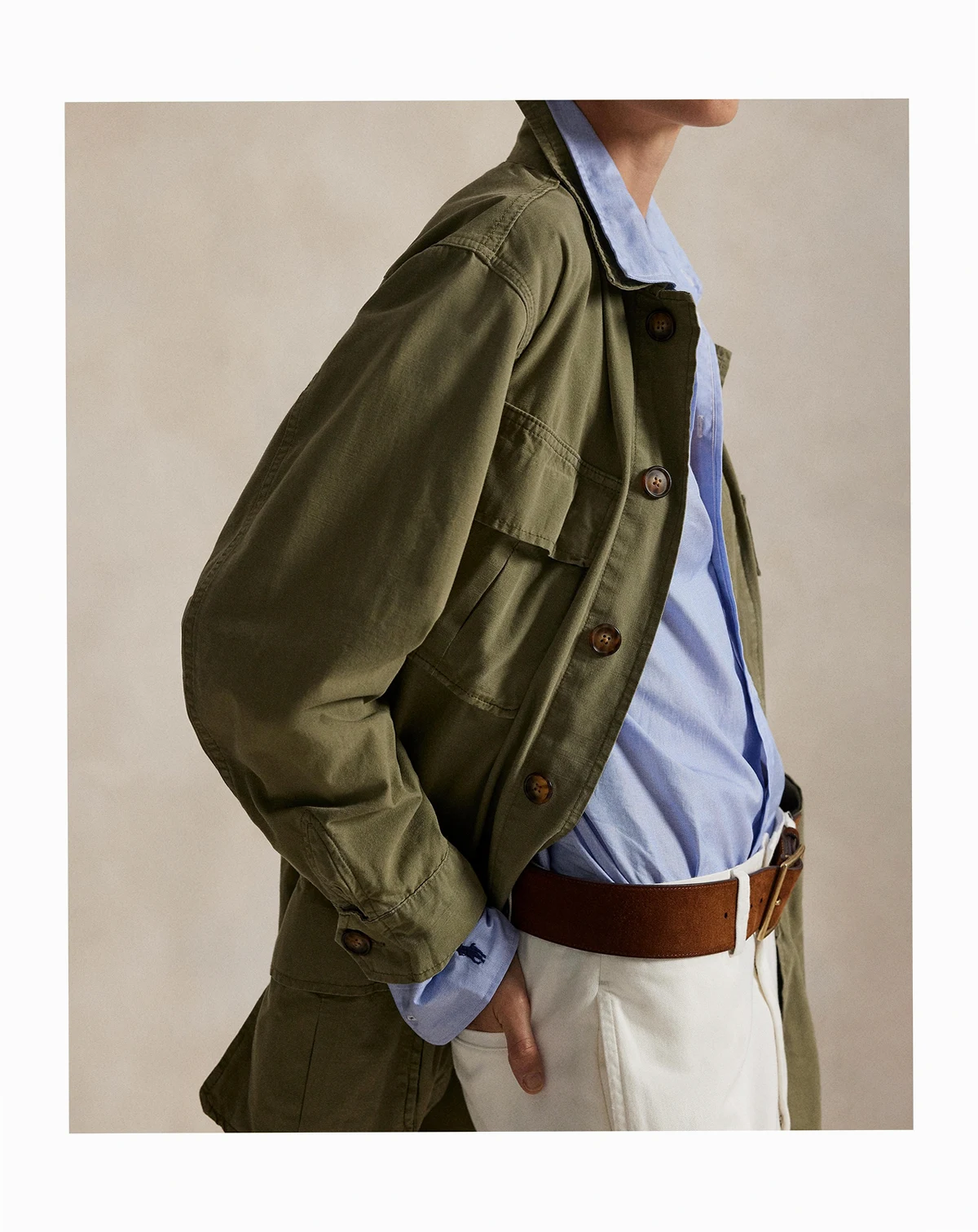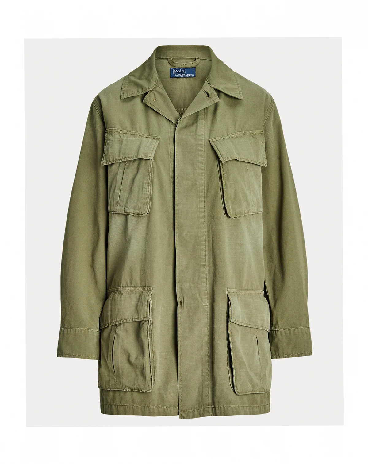 Add effortless style to your wardrobe with this Polo Ralph Lauren utility jacket that features a relaxed silhouette. Oversized chest and waist patch pockets lend functional, on-trend detail. Finished with a classic spread collar and long sleeves with adjustable buttoned cuffs for versatile wear.