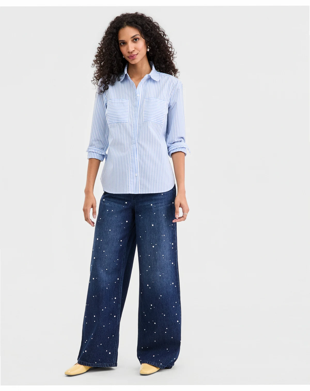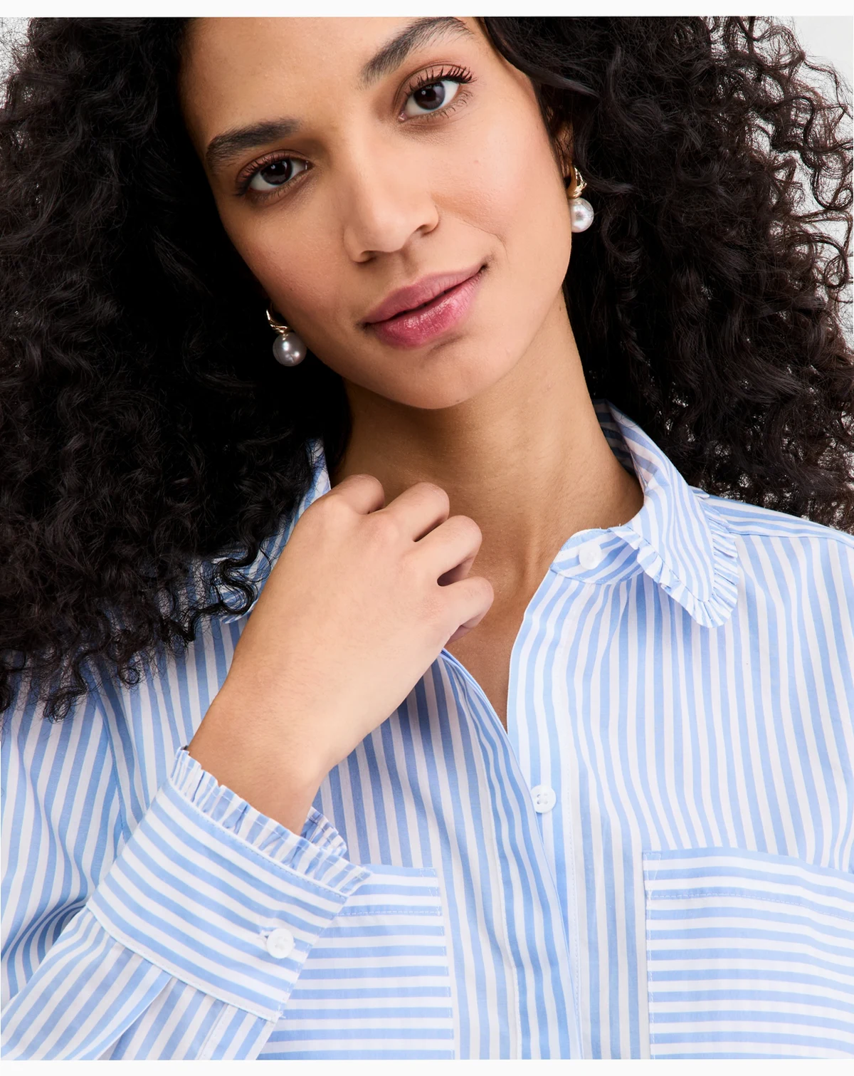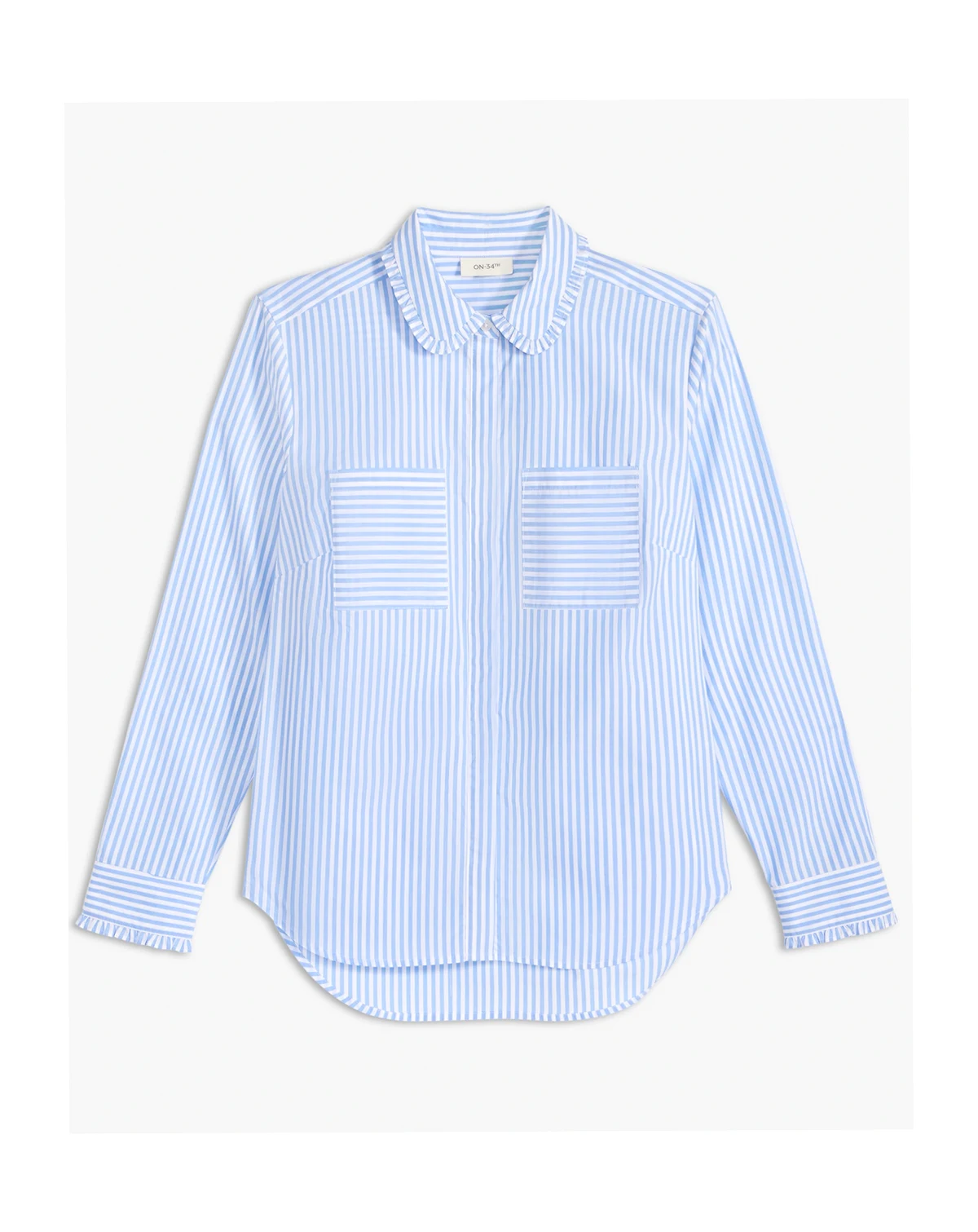 Stripes and dainty ruffles add extra charm to this versatile button-up shirt from On 34th. ABOUT THE BRAND: On 34th was designed for and with women like you. Made for your body, your style, and your truth. As your wardrobe's BFF, these mix-and-match pieces work with everything in your closet.