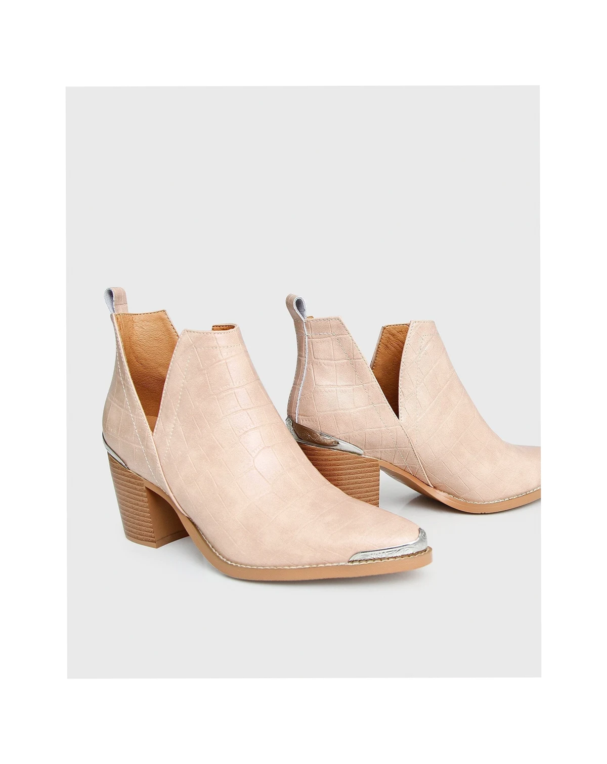 An etched metal capped heel and toe adds a dose of Western styling to the Austin Croc Embossed Ankle Boot. Grounded by a 7cm block heel, the cut-out silhouette and sleek croc embossed leather modernizes the classic western features and creates a stylish addition to any outfit.