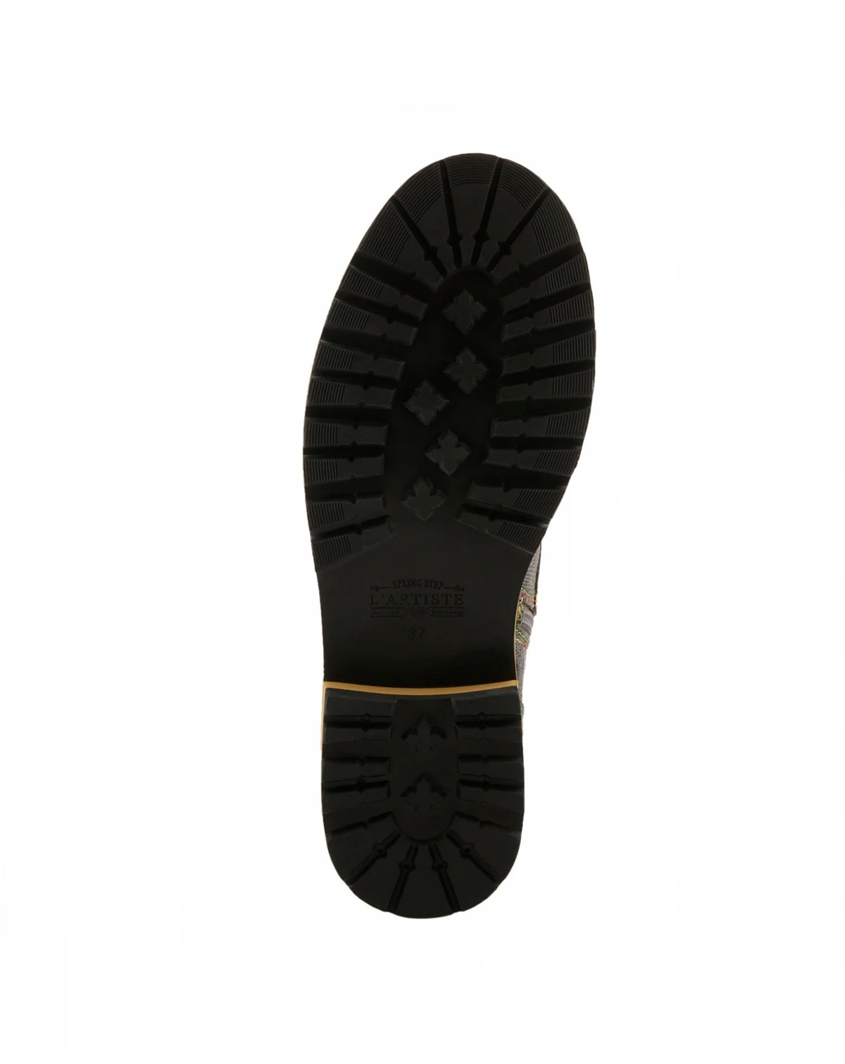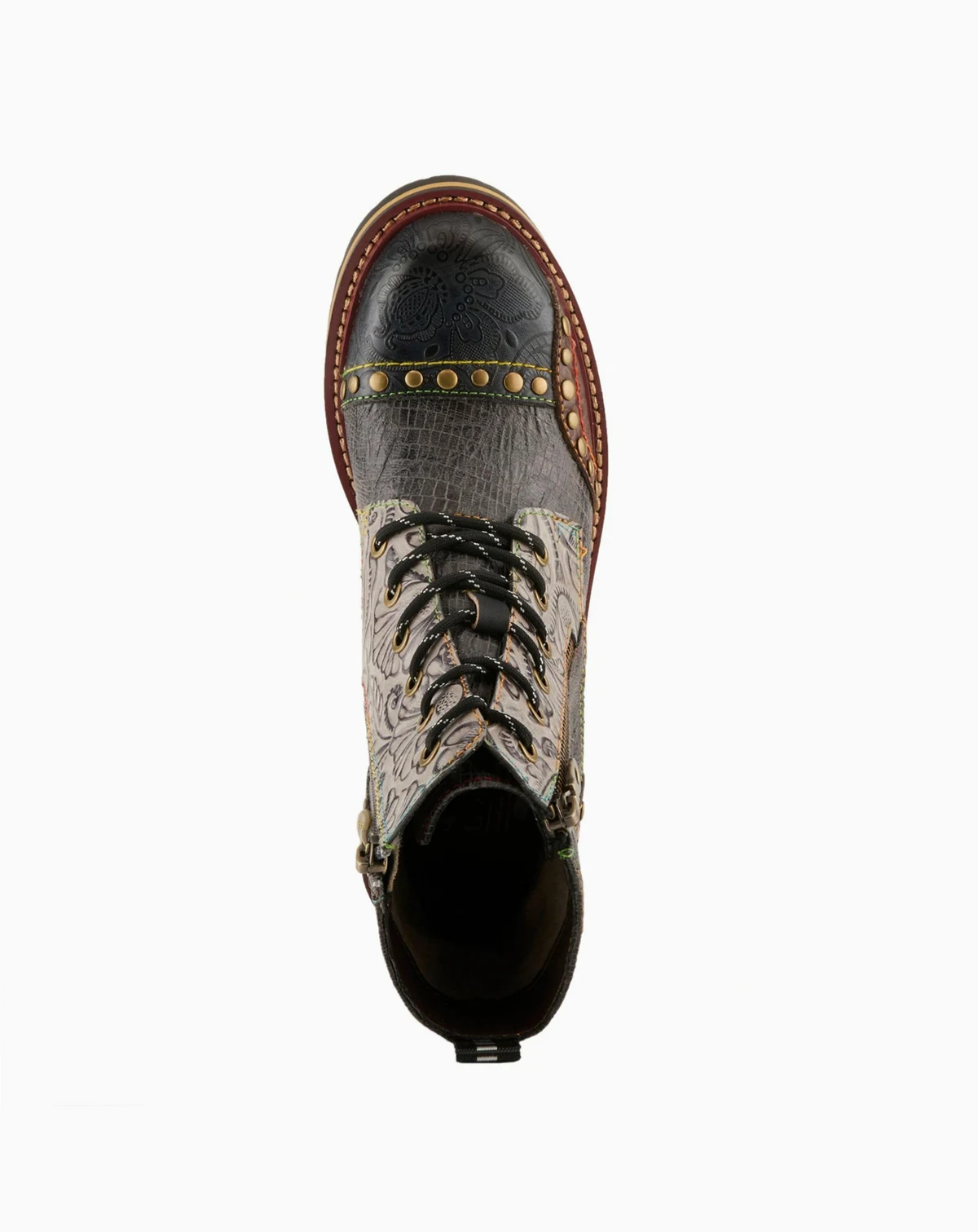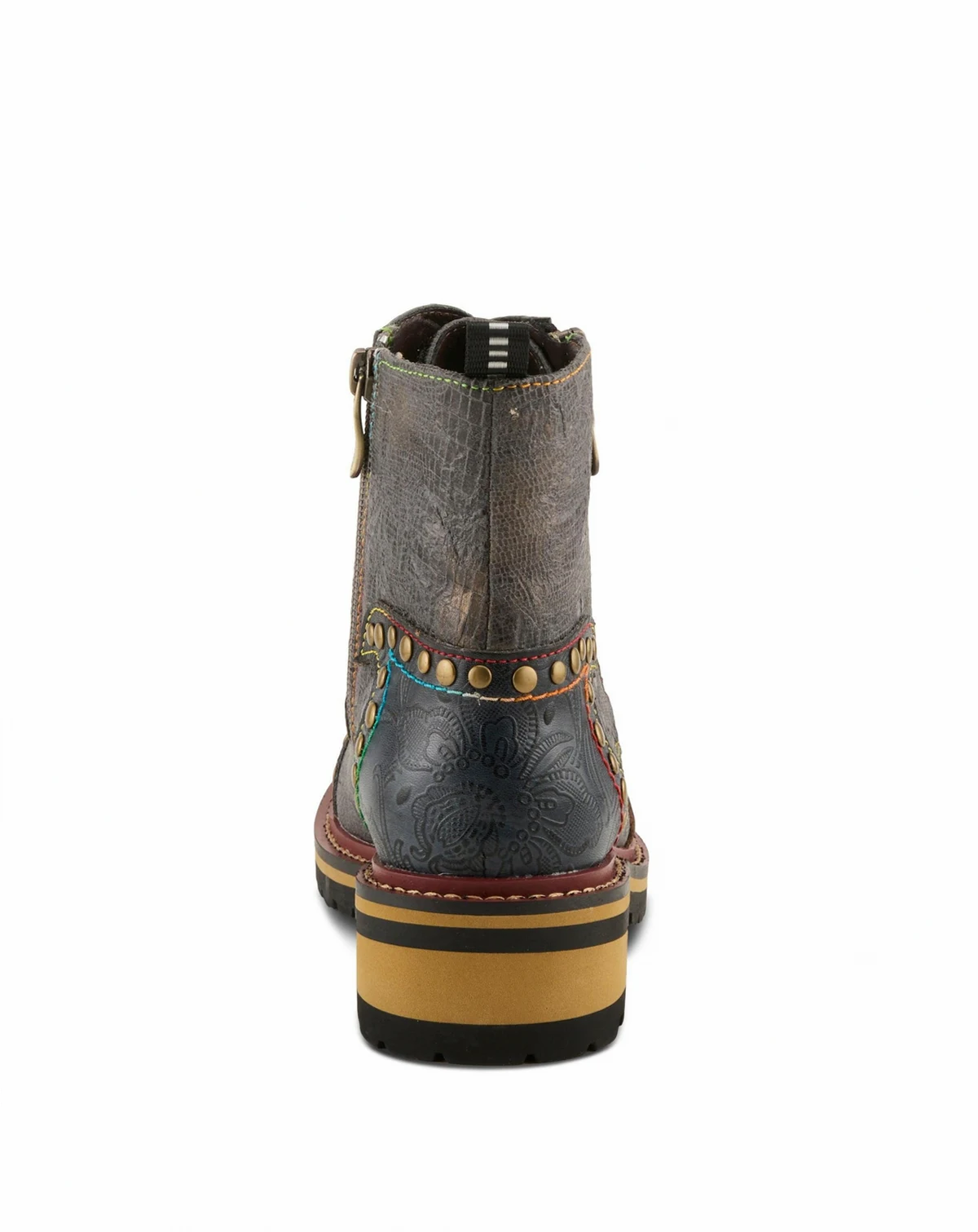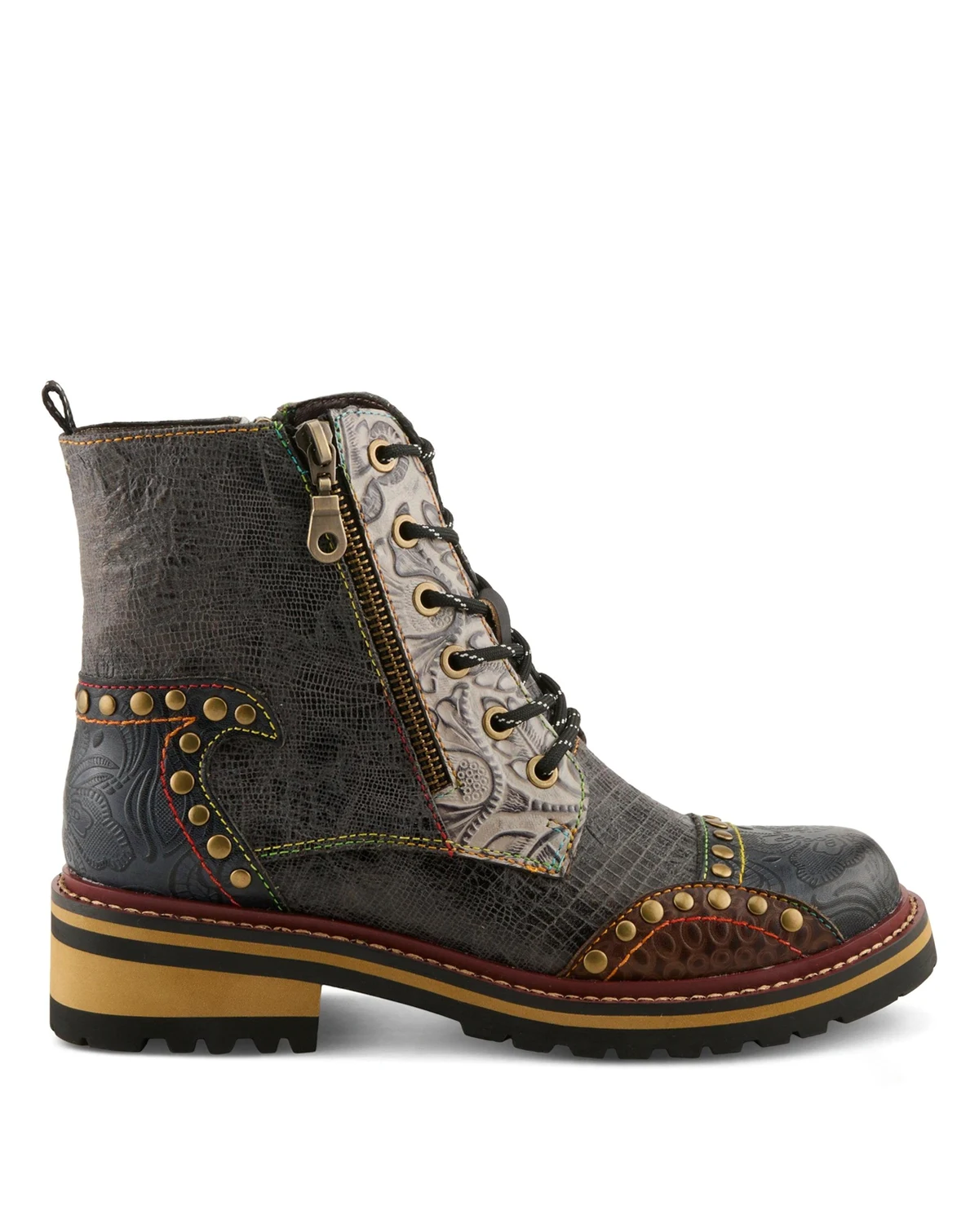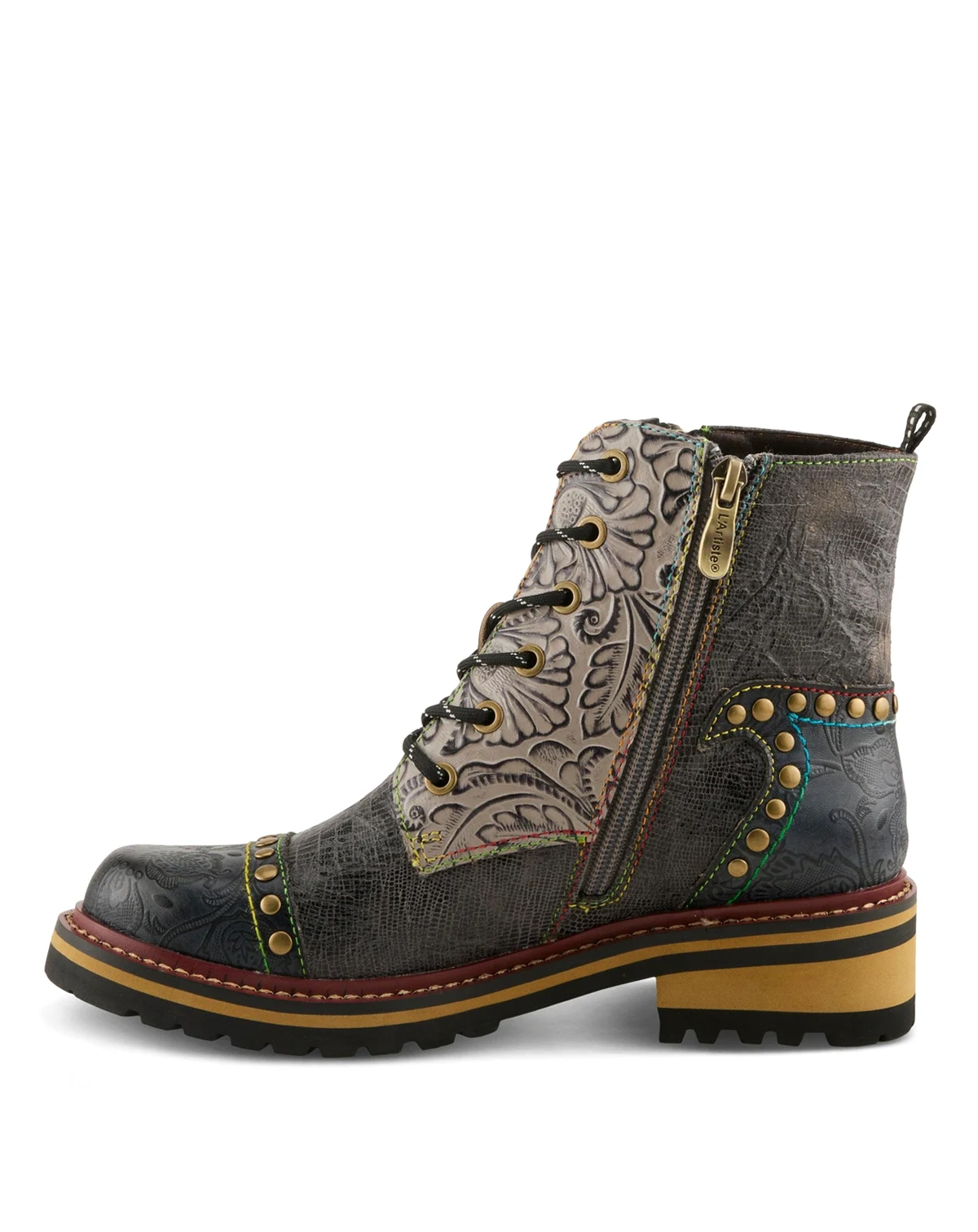 Bold and cozy, the L Artiste Rugup bootie is a cold-weather standout with a showstopping mix of textures and colors. This hand-painted leather and textile boot features metallic, crinkle, and embossed panels, finished with decorative studs, rainbow stitching, and dual lace-up and side-zip closures for adjustable wear. Lined in plush faux fur with a padded insole and flexible 2" lug sole, Rugup offers all-day warmth and support without compromising on style. Perfect for chilly days when you still want to turn heads. Shaft height: 5¼". Circumference: 9"–11". Fits true to size.