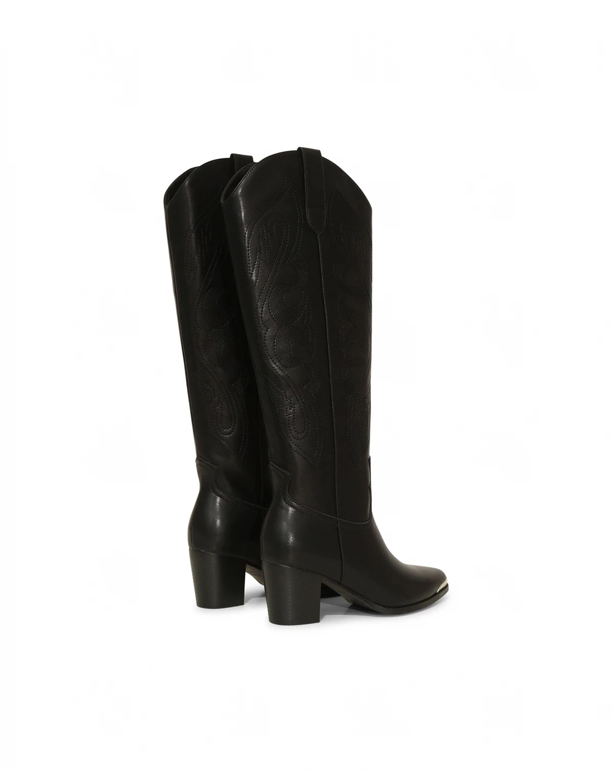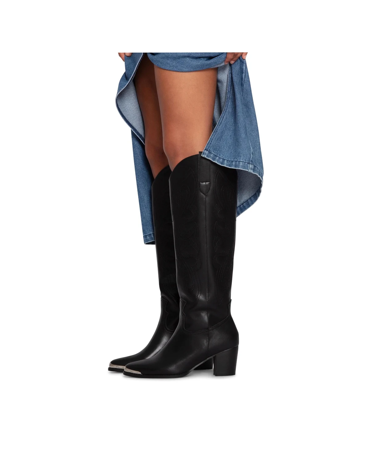 Strut into winter in the Rebelle Knee High Western Boots. Featuring a silver capped toe with embossed detailing and a custom designed stitching pattern up the shaft, you will want to keep them on from day to night all year round.